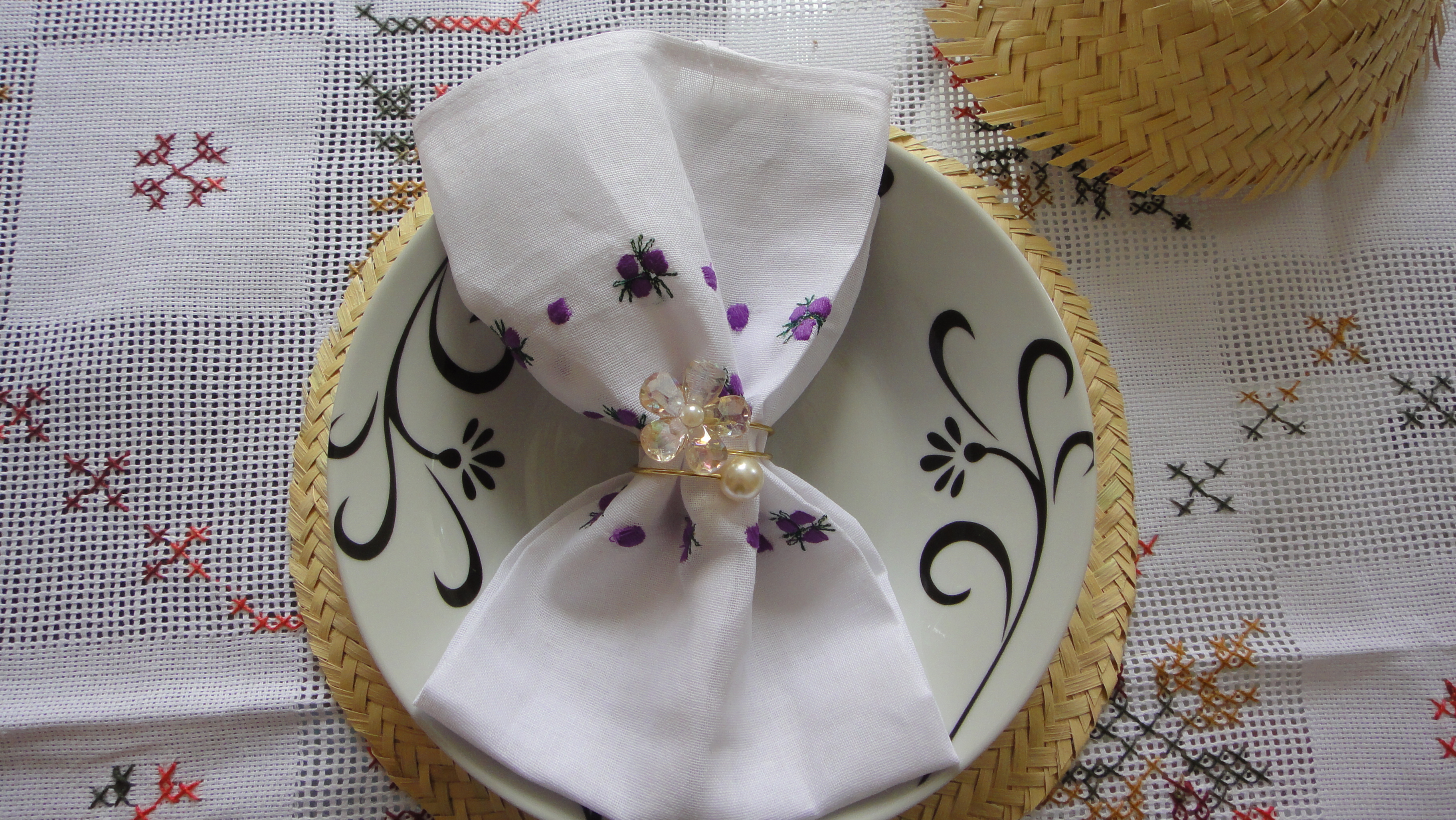 Claro que tal almoço tem uma motivação vinda de “brinquedinhos” novos que ganhei essa semana. Minha comadre Ivaneide me enviou porta-copos e sousplat digamos “diferentes”…. Eles são de palha, mas não tem o formato habitual desse tipo de acessório de mesa. Não resisti e tive logo que montar uma mesa para vocês.