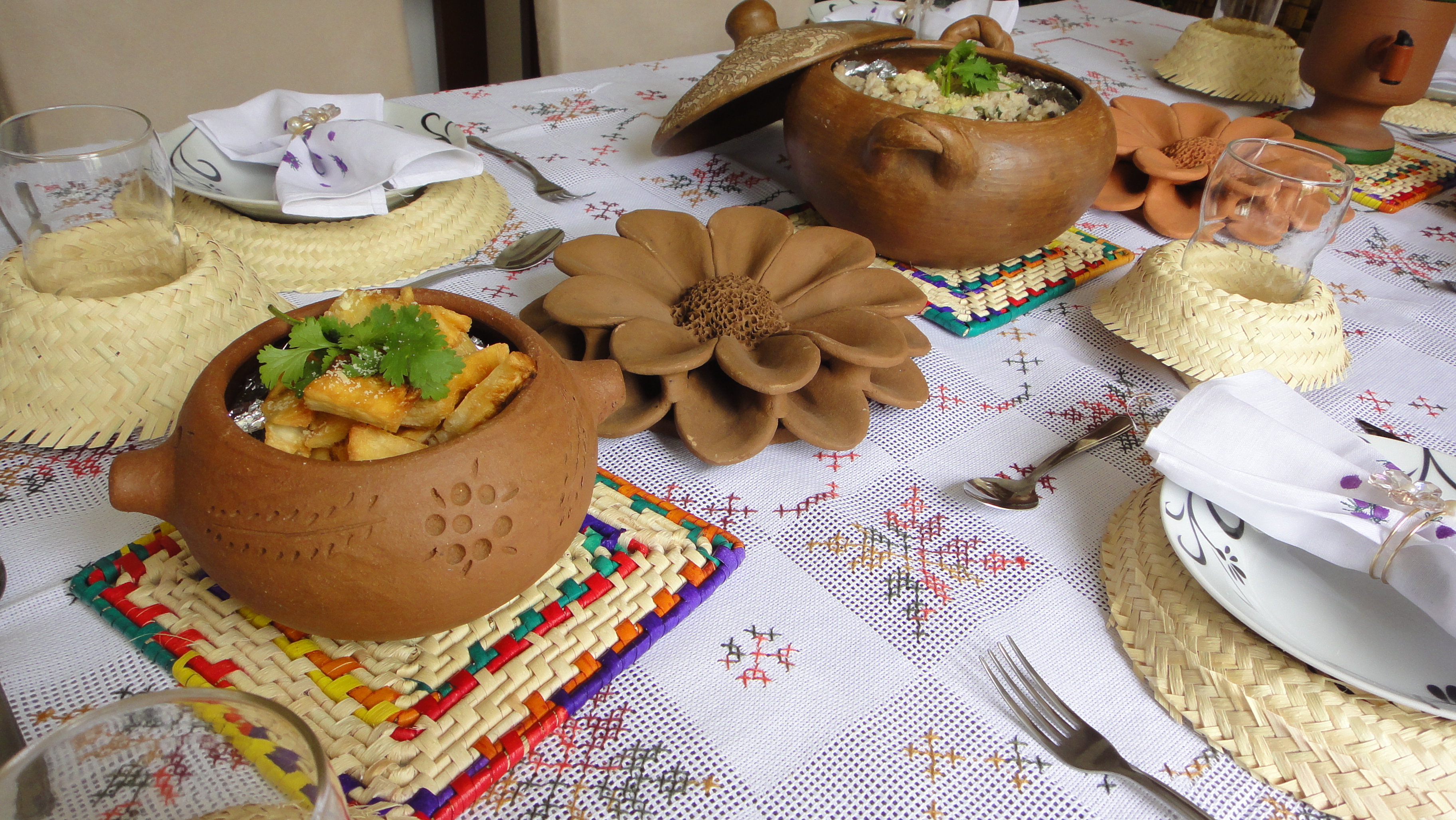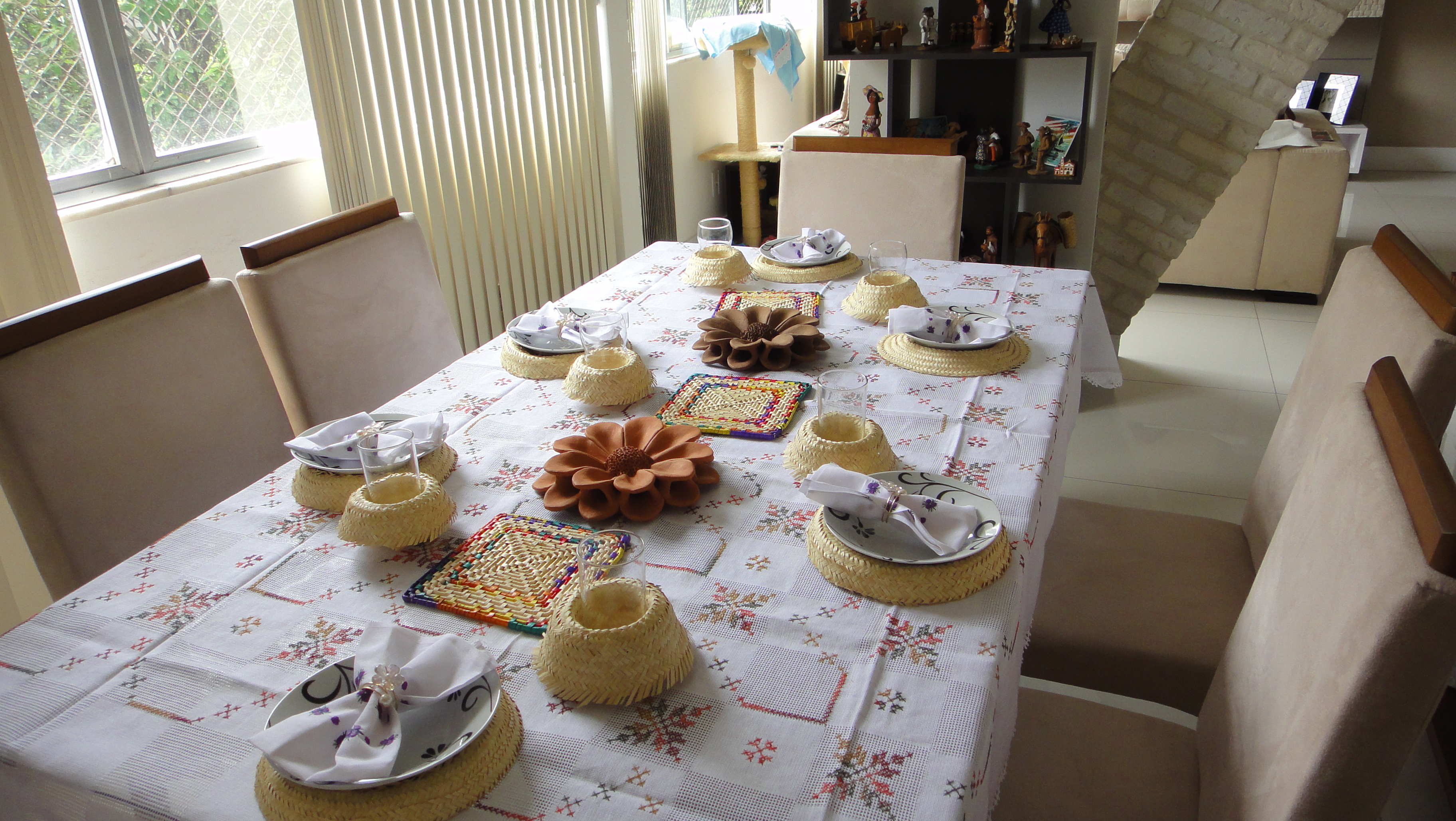 O arranjo da mesa dessa vez ficou por conta dos mestres do barro. Preferi colocar essas lindas flores de barro que comprei para pôr na decoração da minha casa, mas que com essa confusão de fim de ano, ainda estão na gaveta.