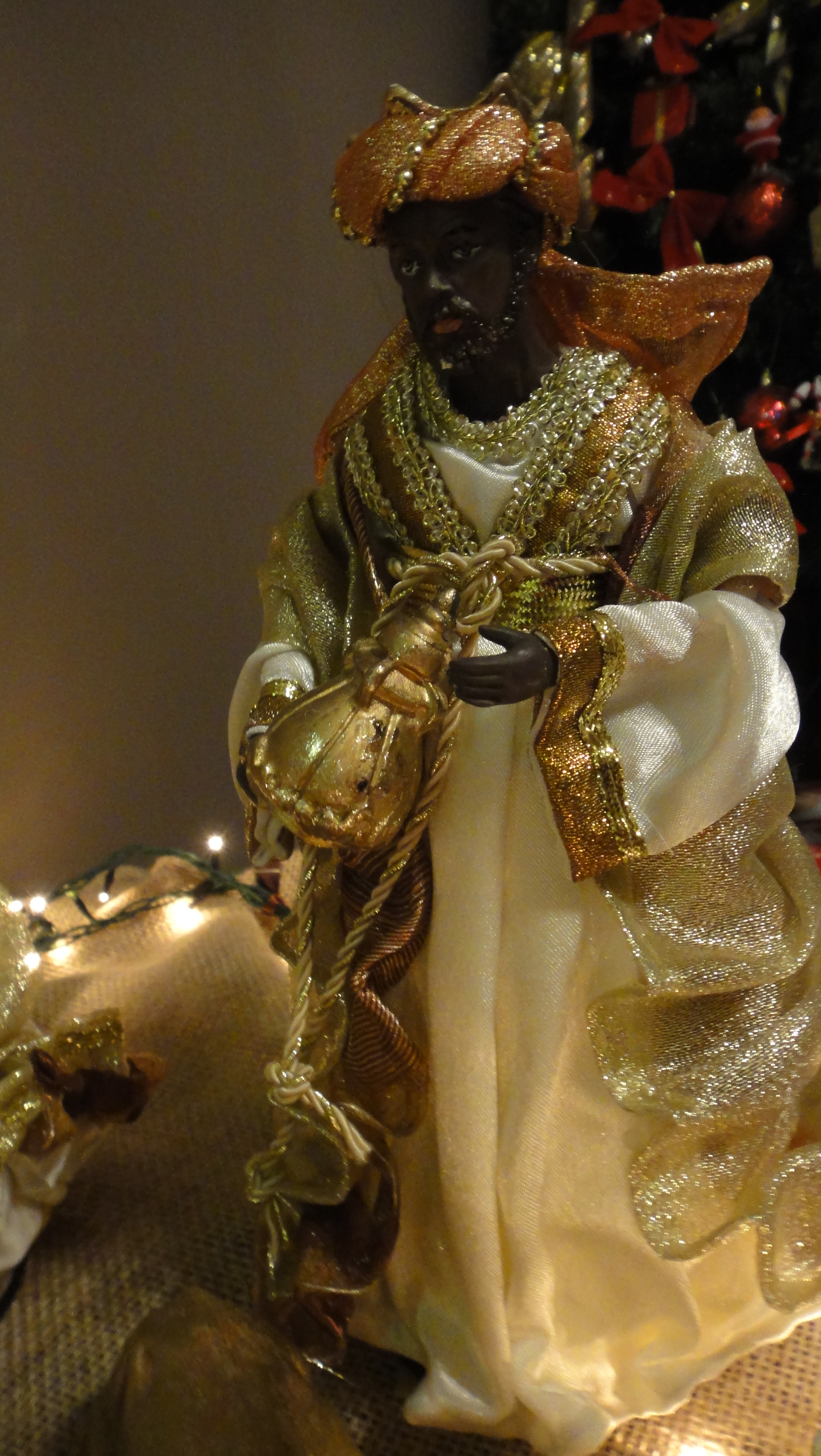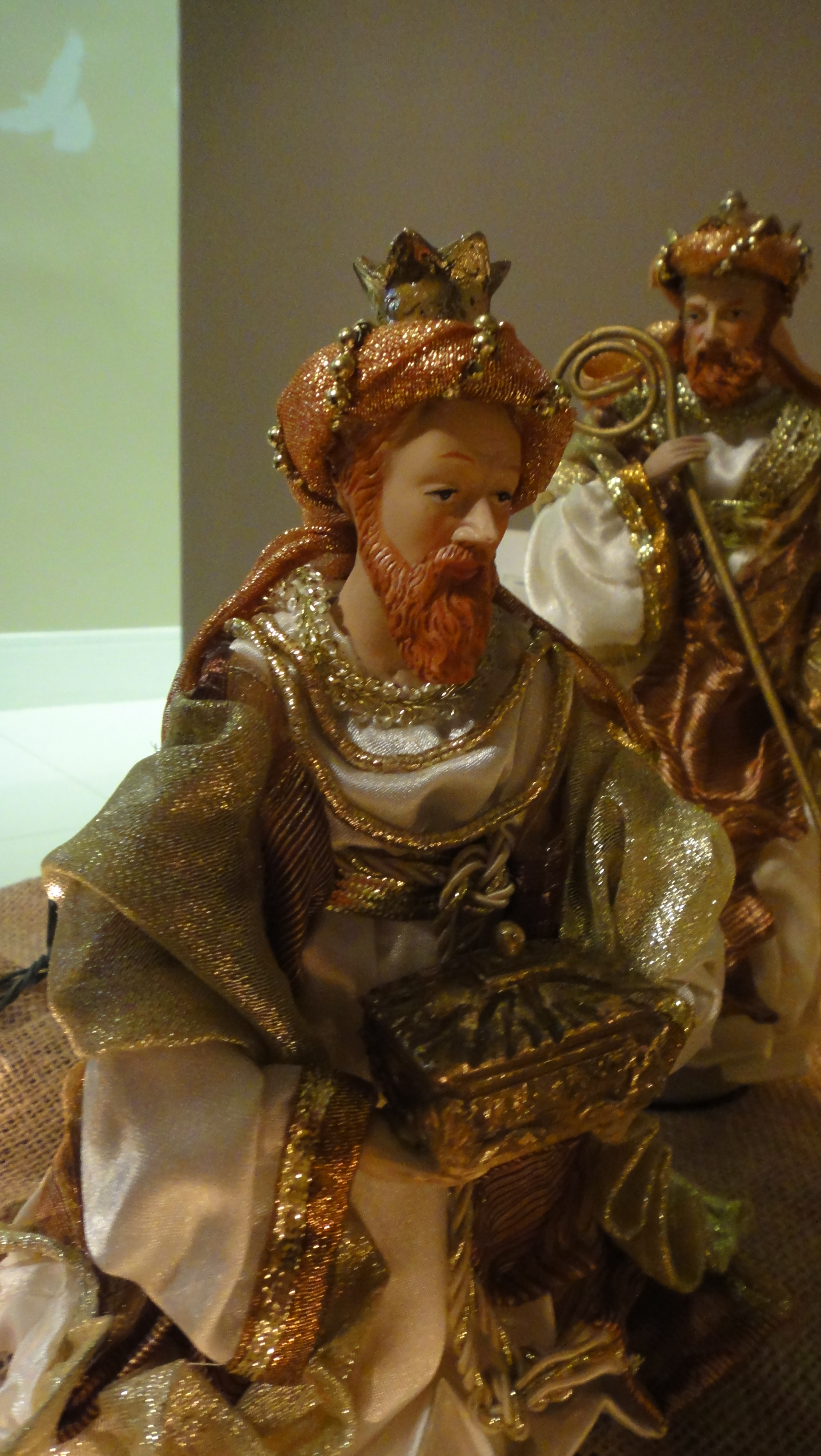 Decidimos montar o presépio bem próximo ao chão e ao lado da árvore de natal. Pensamos em fazer um estilo cabaninha, mas lembramos que Raul (o dono do reino) adora uma cabana. Logo teríamos um menino Jesus rapidamente desalojado.