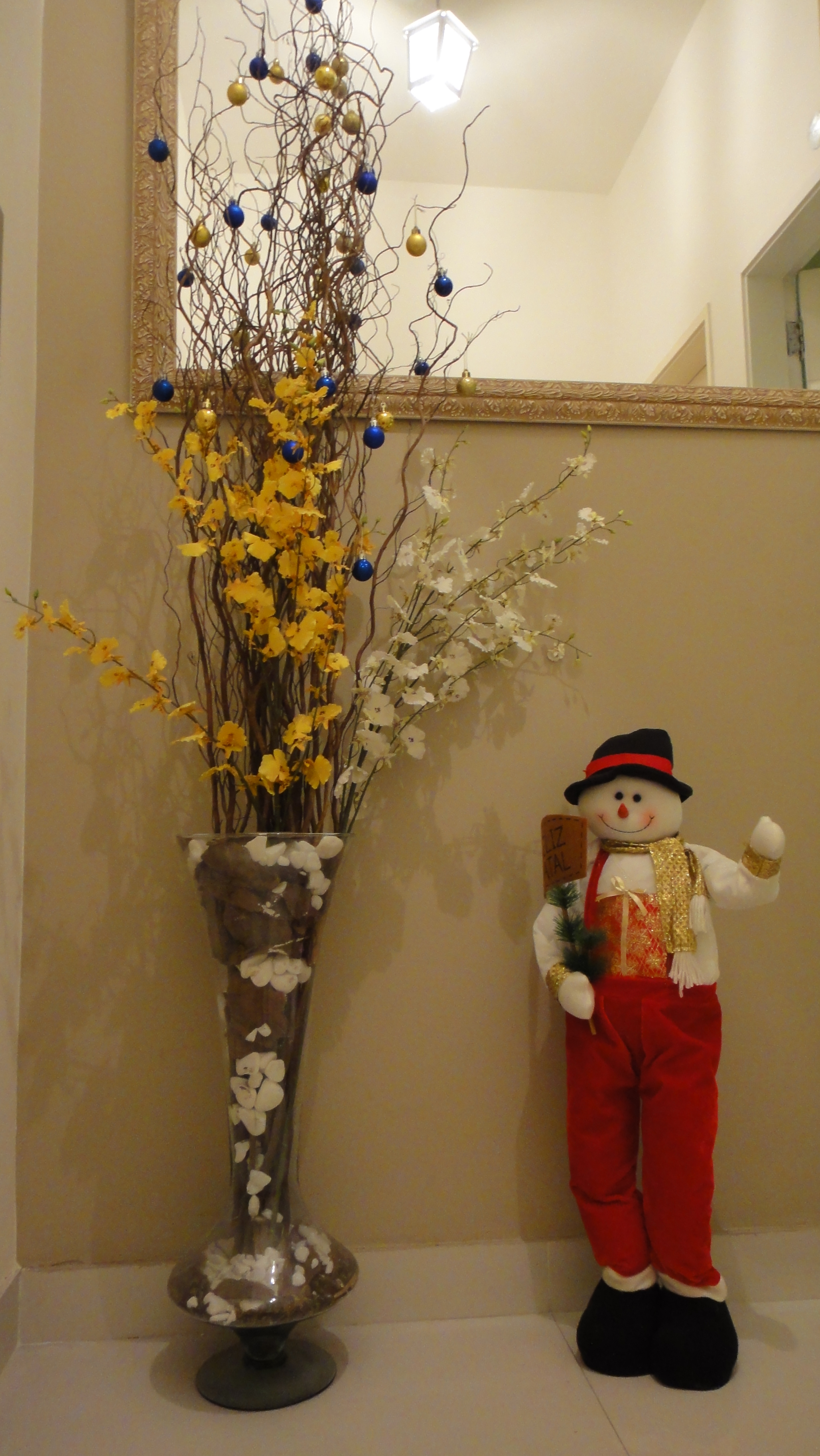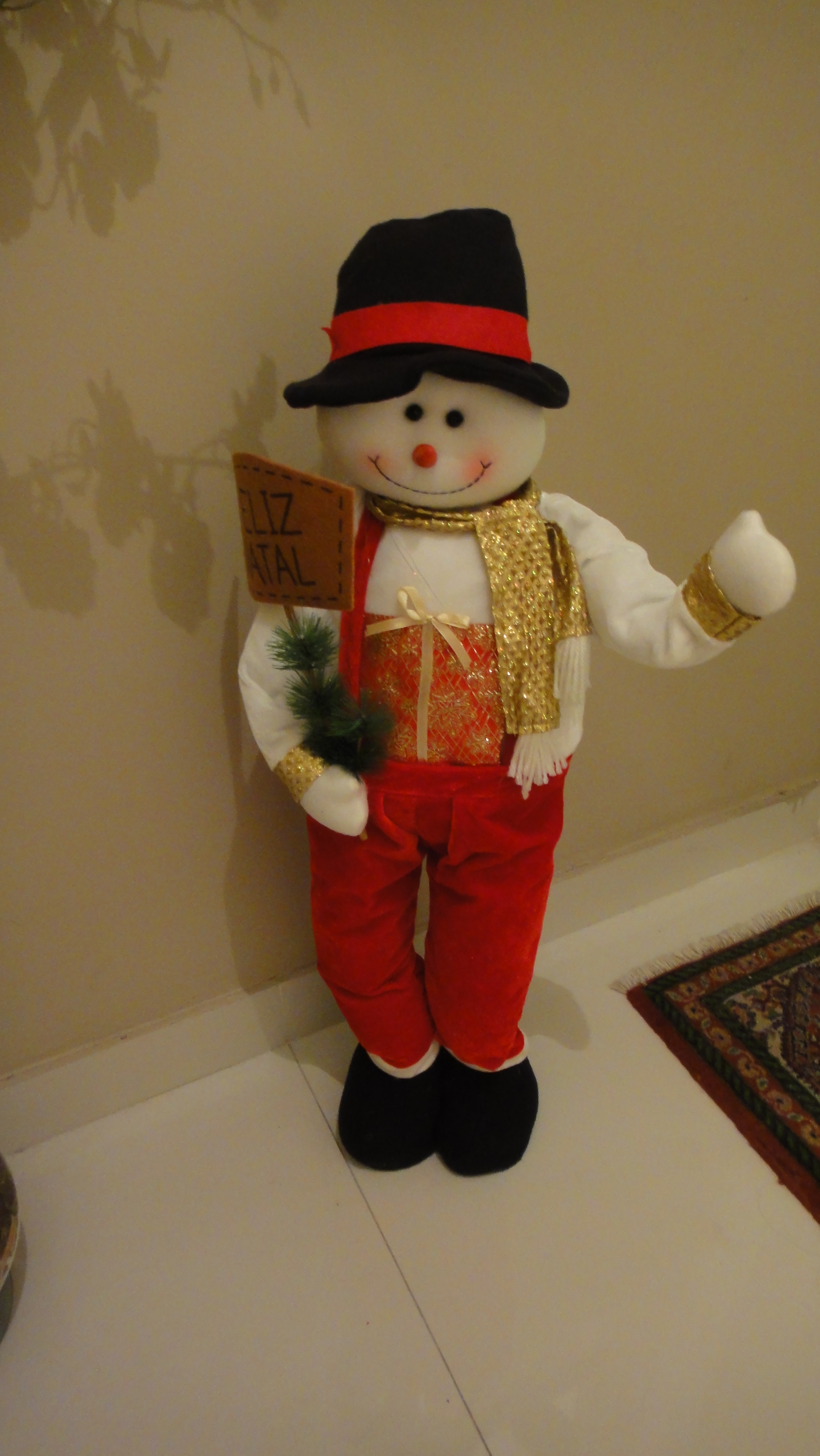 Saindo da sala, vamos mostrar meu simpático boneco de neve. Ele está dando Feliz Natal para minhas visitas.