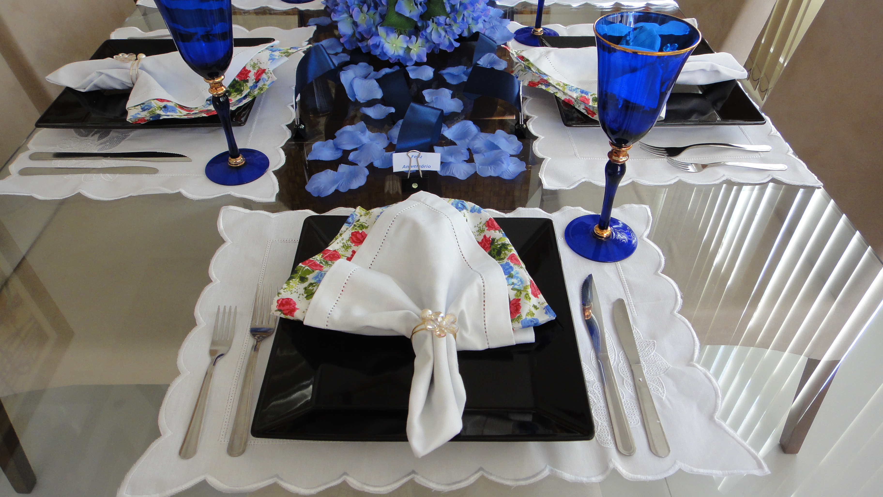 Não sei se vocês já repararam, mas não utilizamos toalhas. Usei lugares americanos brancos bordados. Os guardanapos na verdade foram dois: um branco por cima e um florido por dentro. Os pratos foram os pretos, bem neutros para não influenciar no resto da decoração.
