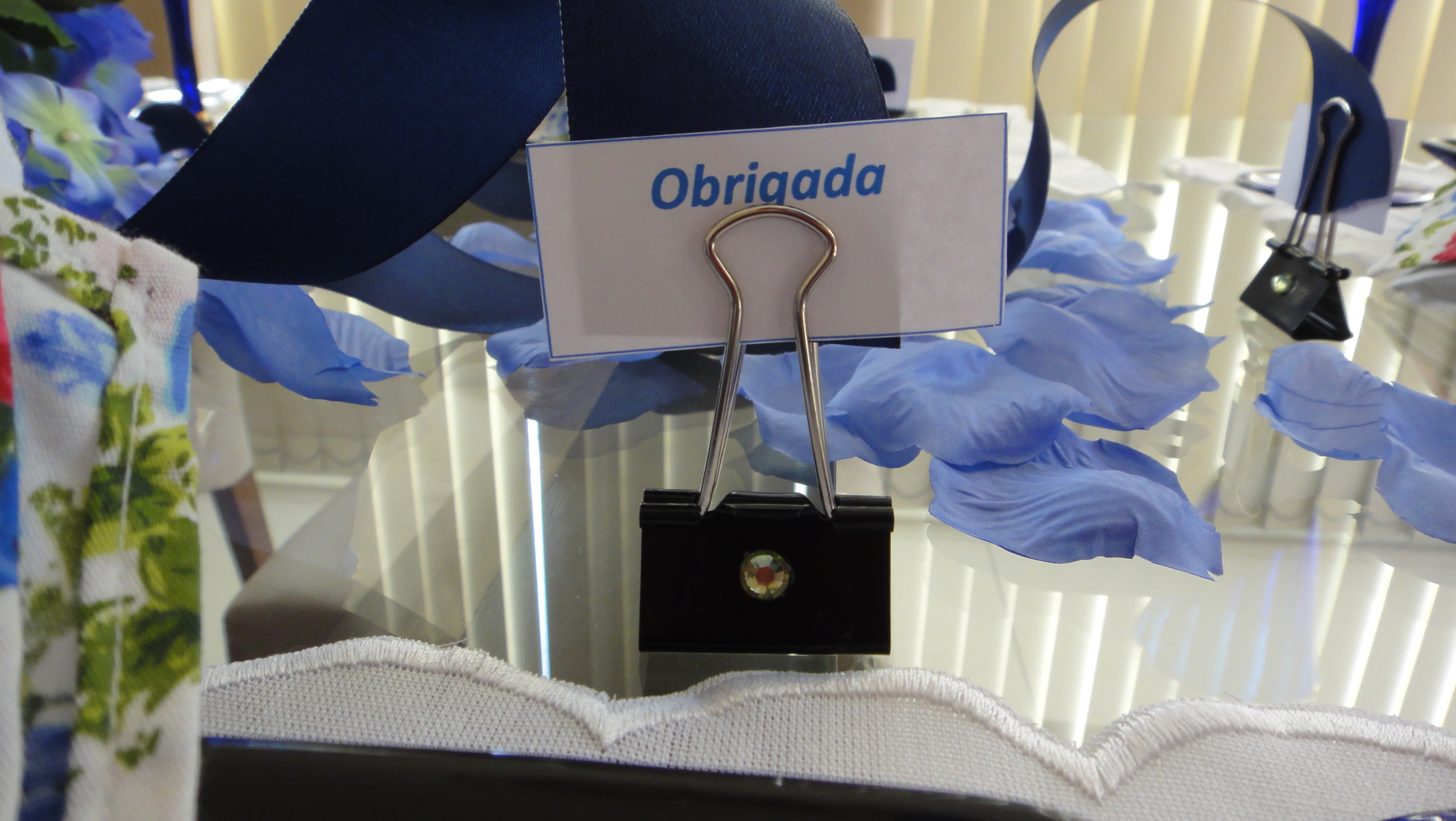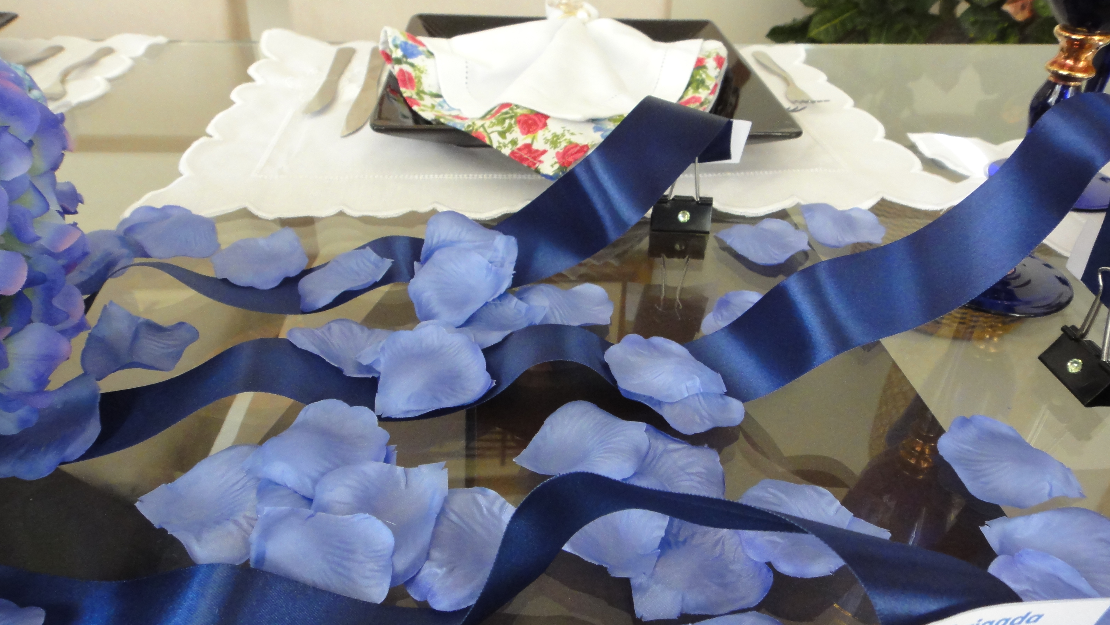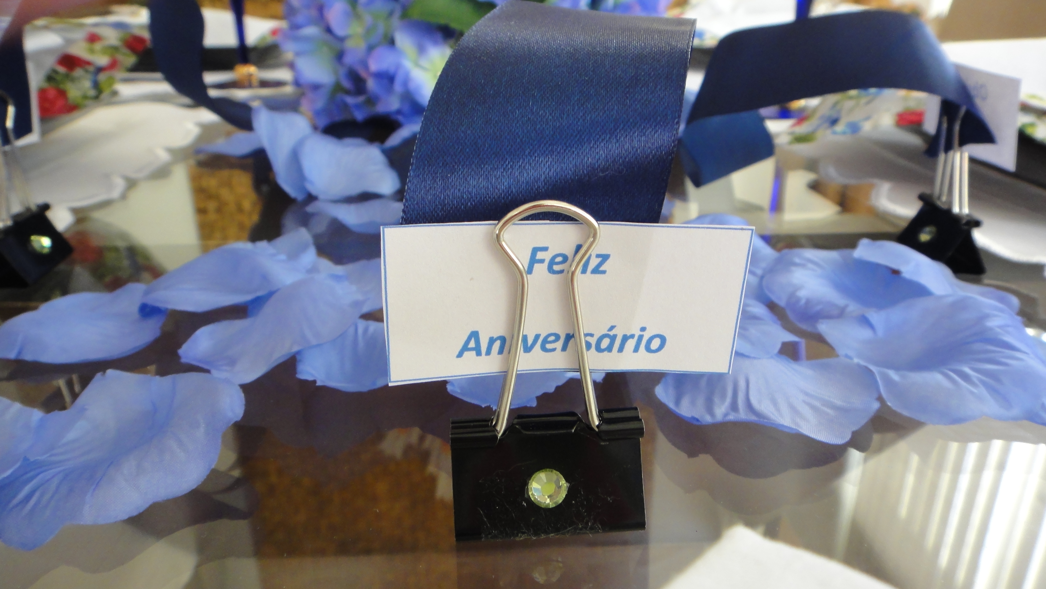 Espalhamos pela mesa pétalas azuis. Do arranjo puxamos fitas azuis royal em direção a cada convidado. Elas terminavam no clips que usamos para por os nomes dos convidados. Mas resolvemos inovar: ao invés de definir lugares, os cartões agradeciam a presença e desejavam Feliz Aniversário a homenageada.