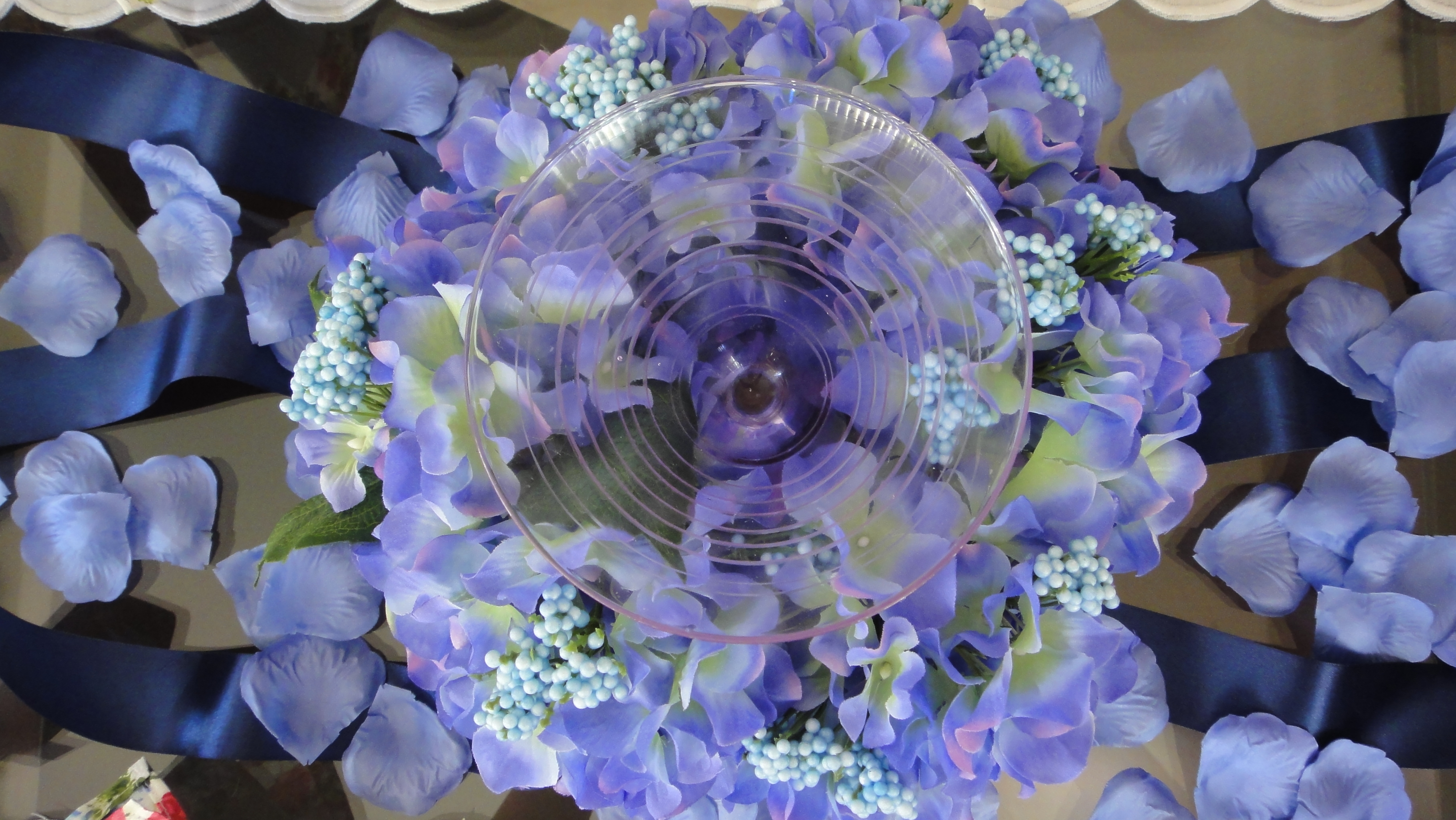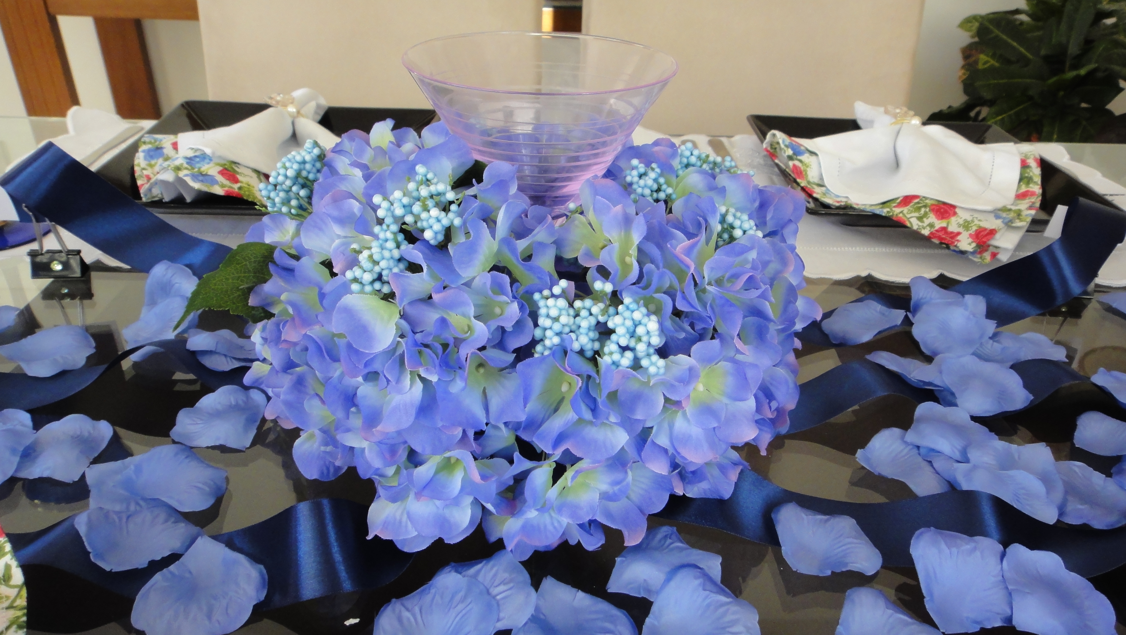Adoramos a cor da hortênsia. Possui um azul tão suave que é impossível não deixar qualquer lugar belo. No centro do arranjo utilizamos uma taça com vela flutuante.