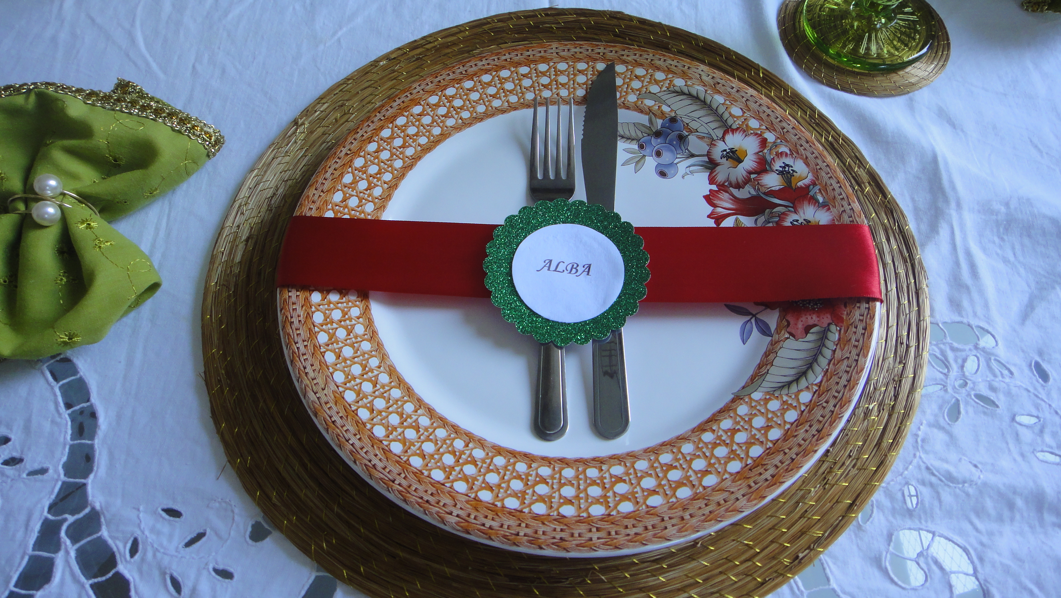 Os pratos e sousplats também são os mesmos, mas com uma “cara” bem diferente. Reaproveitei as fitas vermelhas para envolver os pratos. Os nomes que estavam nos marcadores de lugar “saltaram” para dar fechamento a fita vermelha.