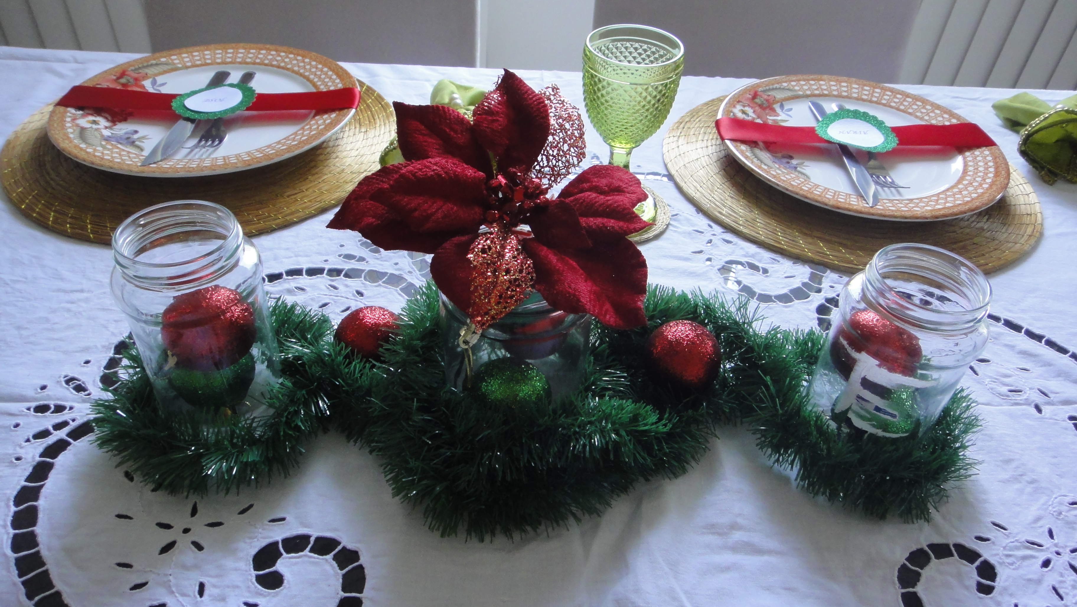 Os demais itens, assim como a comida, vieram todos da noite de Natal direto para nosso almoço. O arranjo simples (afinal não exijam muito de quem estava morta de cansada depois de tanto trabalho) era uma adaptação do arranjo que enfeitou nosso rack. Era feito de bolas de Natal dentro de potes de molho de tomate envolvidos por festão verde. Para dar um toque “roubei” uma flor da árvore de natal.