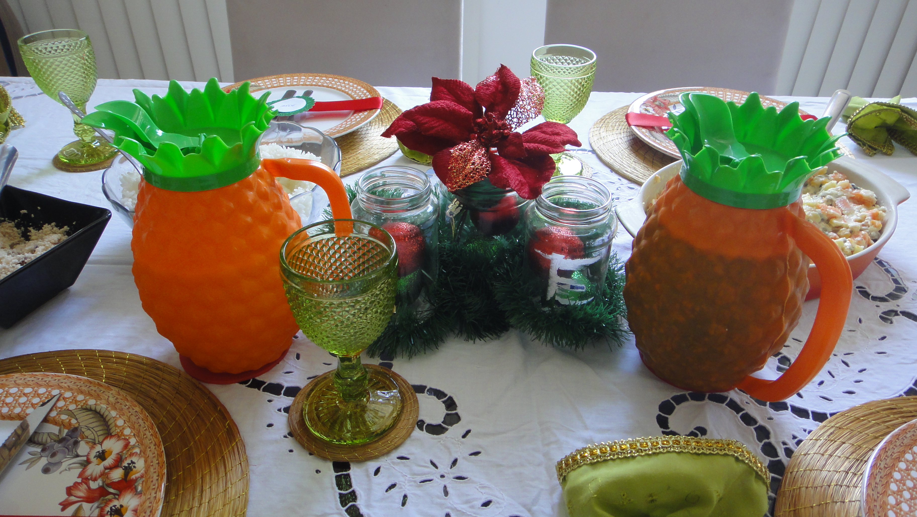 Quando pensei em família o que me veio na cabeça foi aquele abacaxi da Grande Família e foram eles que deram a cor da mesa. Outra ideia de família era a toalha bordada pela minha mãe para seu enxoval de casamento. Eles foram os novos itens que fizeram com que mesmo com a reciclagem da ceia, o almoço fosse completamente diferente.