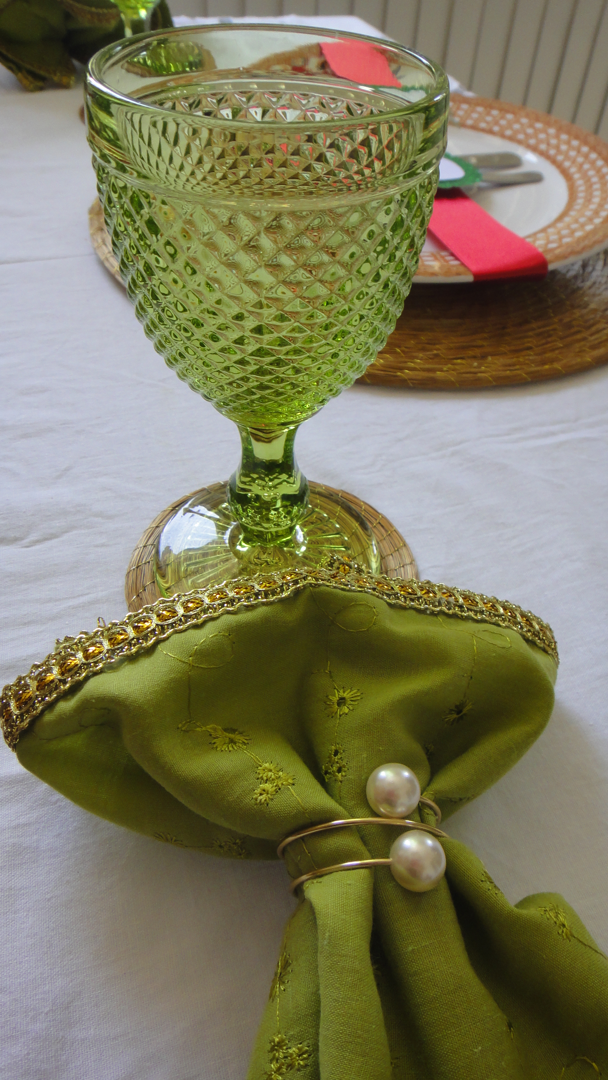 Para harmonizar com essa mesa colorida preferi as taças verdes e mantive os mesmo guardanapos (já devidamente limpos) apenas com dobradura diferente.