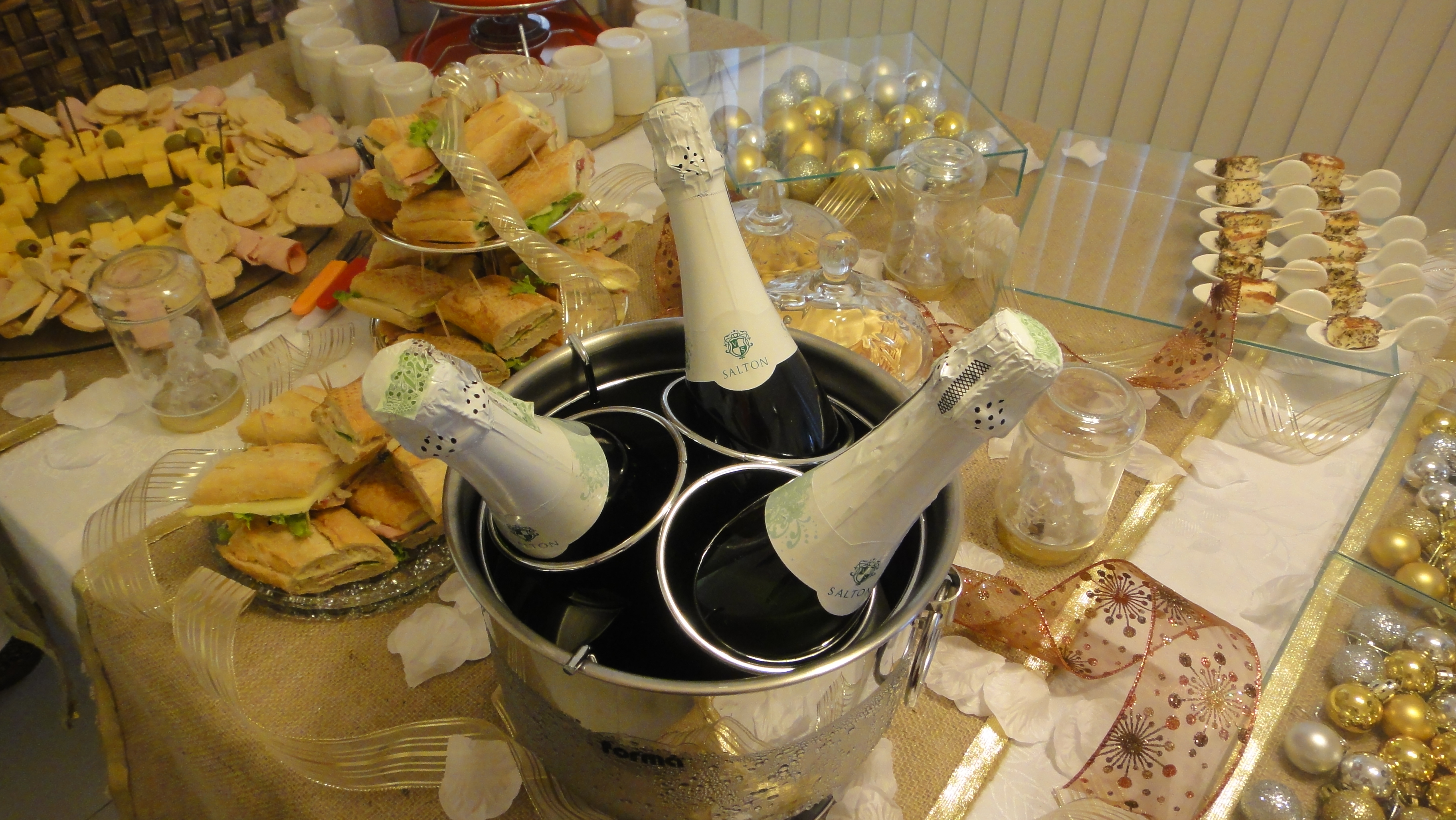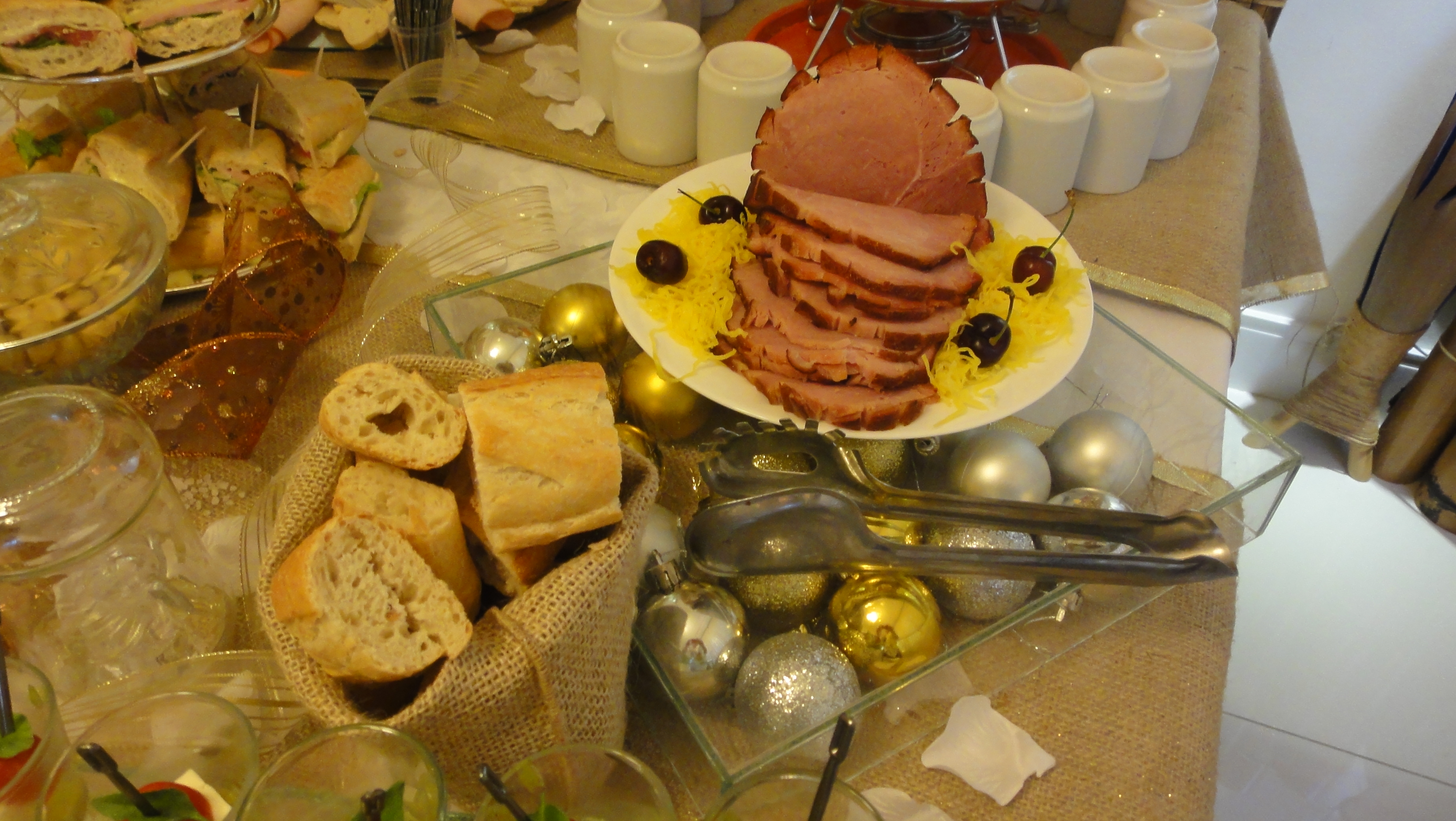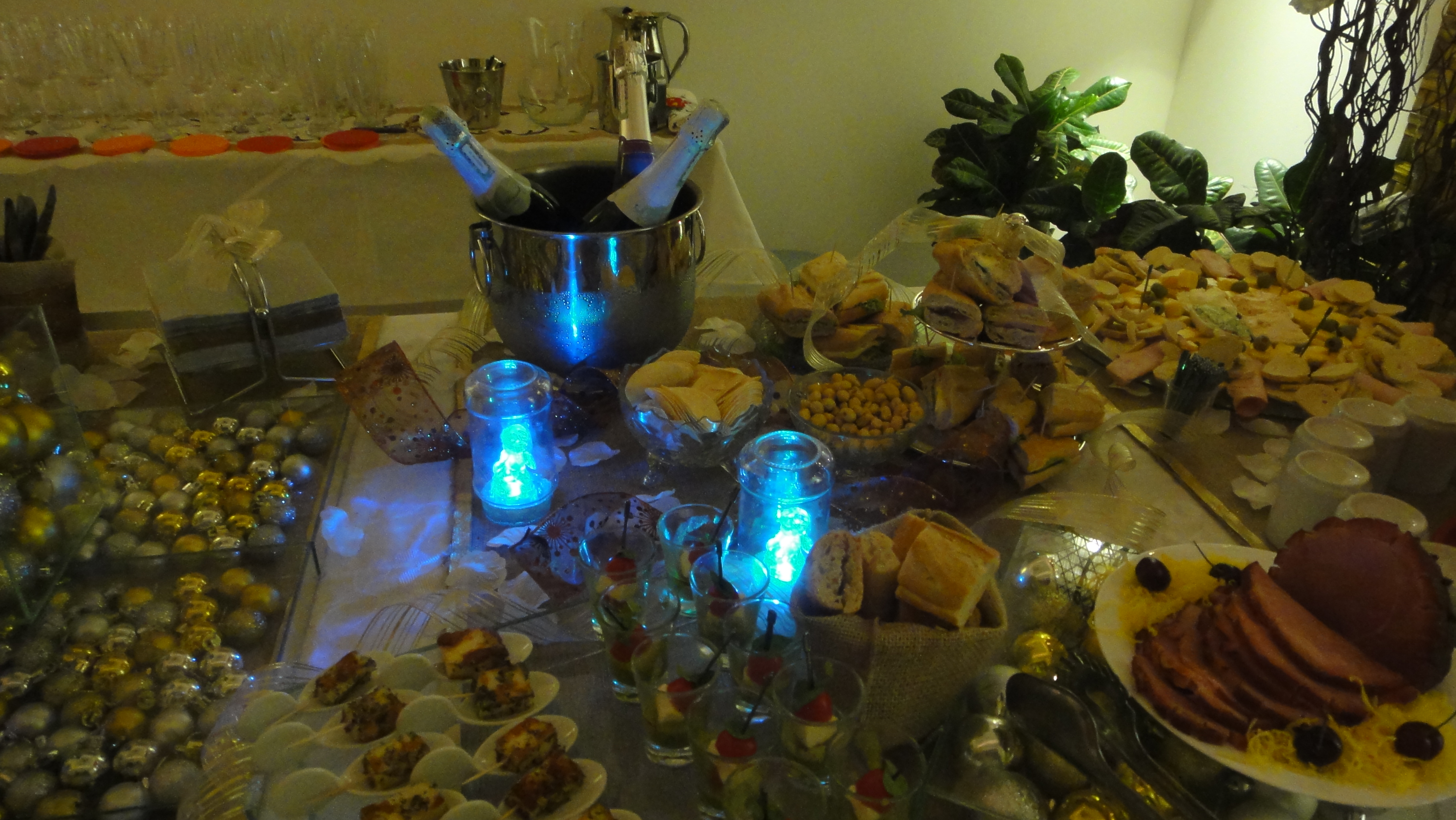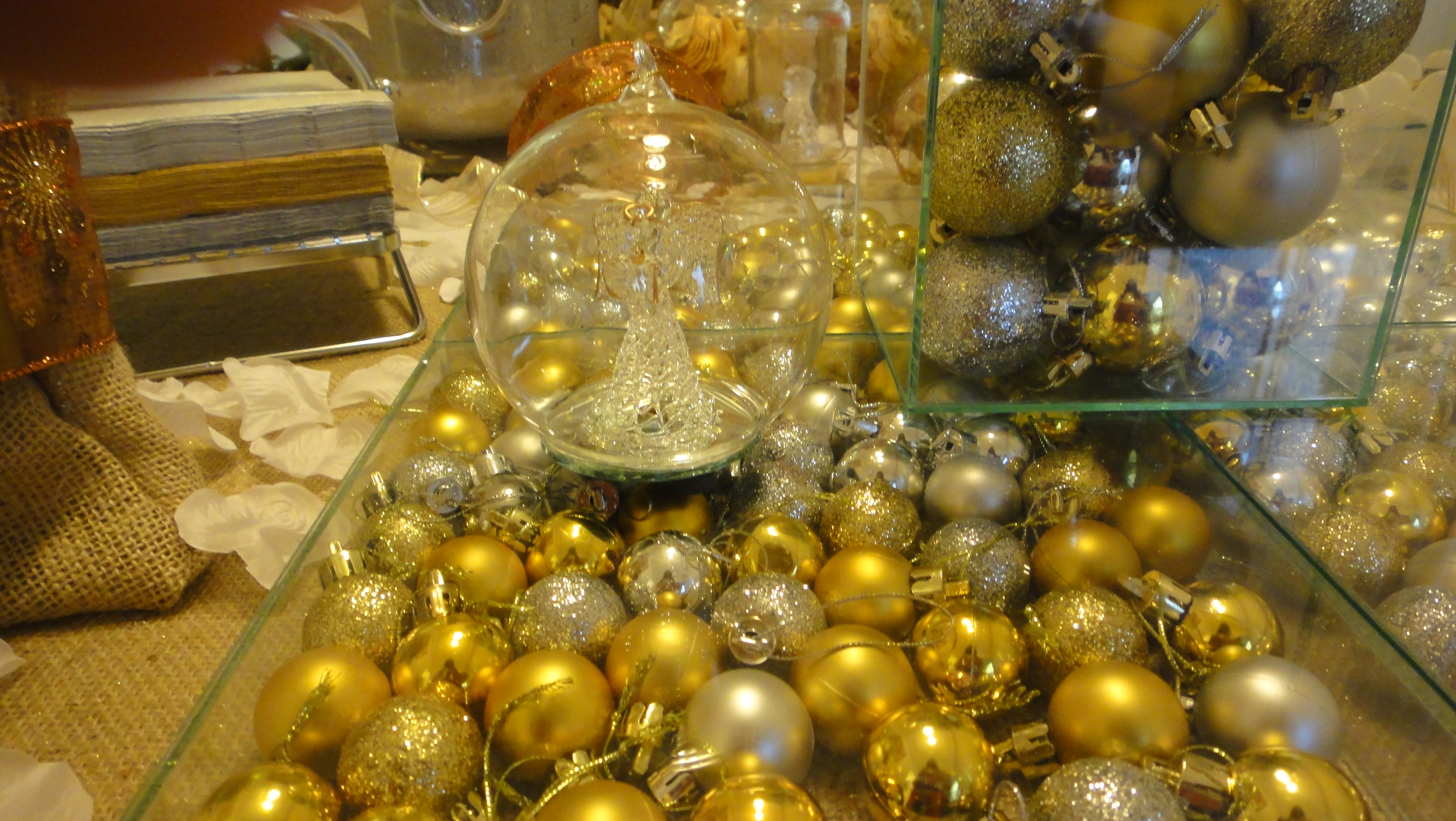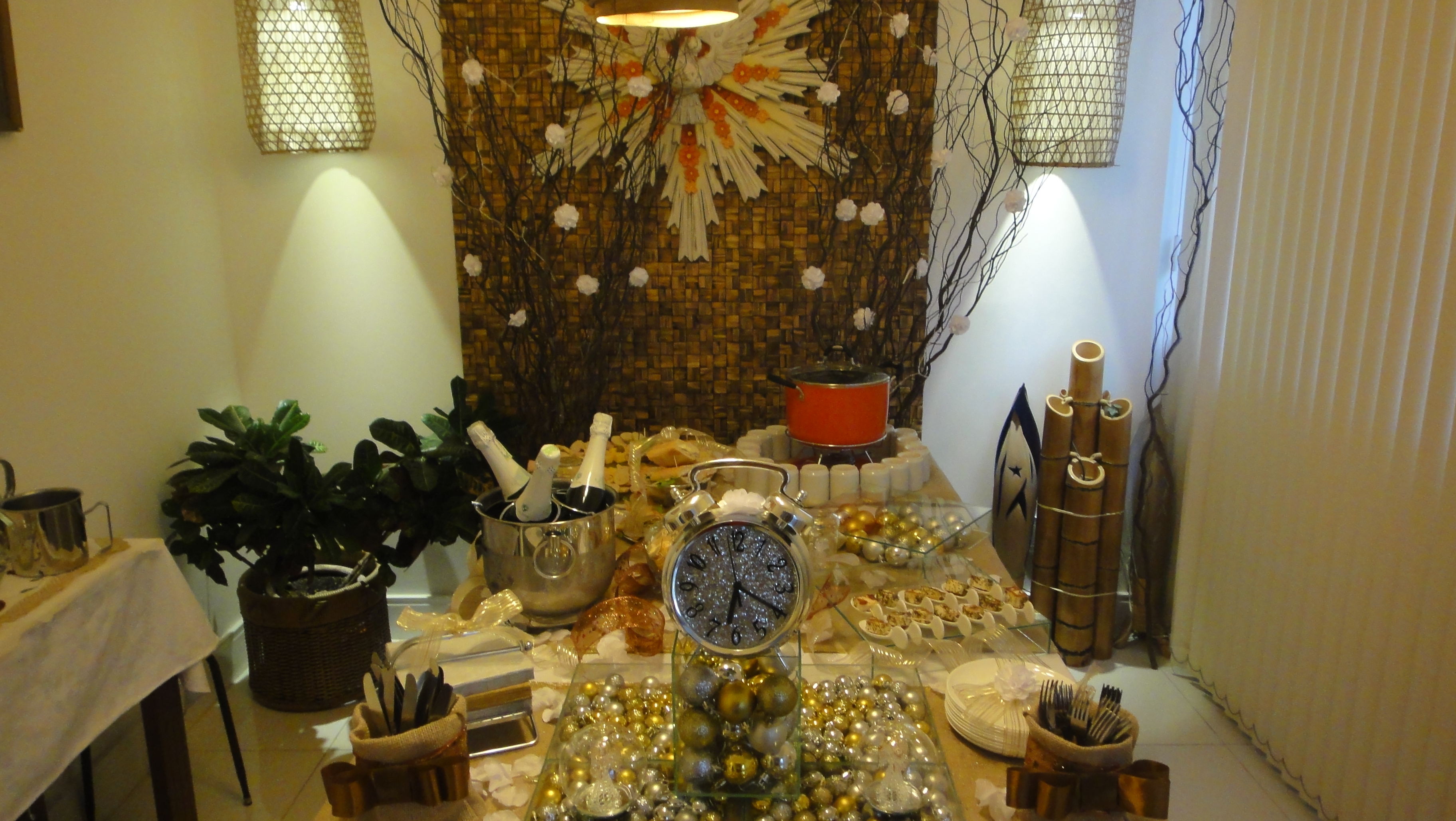 Na frente coloquei a decoração principal, o relógio sobre os vidros com bolas prateadas e douradas no interior. Após essa decoração (substituta do arranjo) coloquei as comidinhas e em seguida a composição final: os galhos secos dispostos já na outra cabeceira e formando um fundo com a minha imagem do Divino. Consegui esse tipo de colocação dos itens porque não havia disposição de louças e talheres.