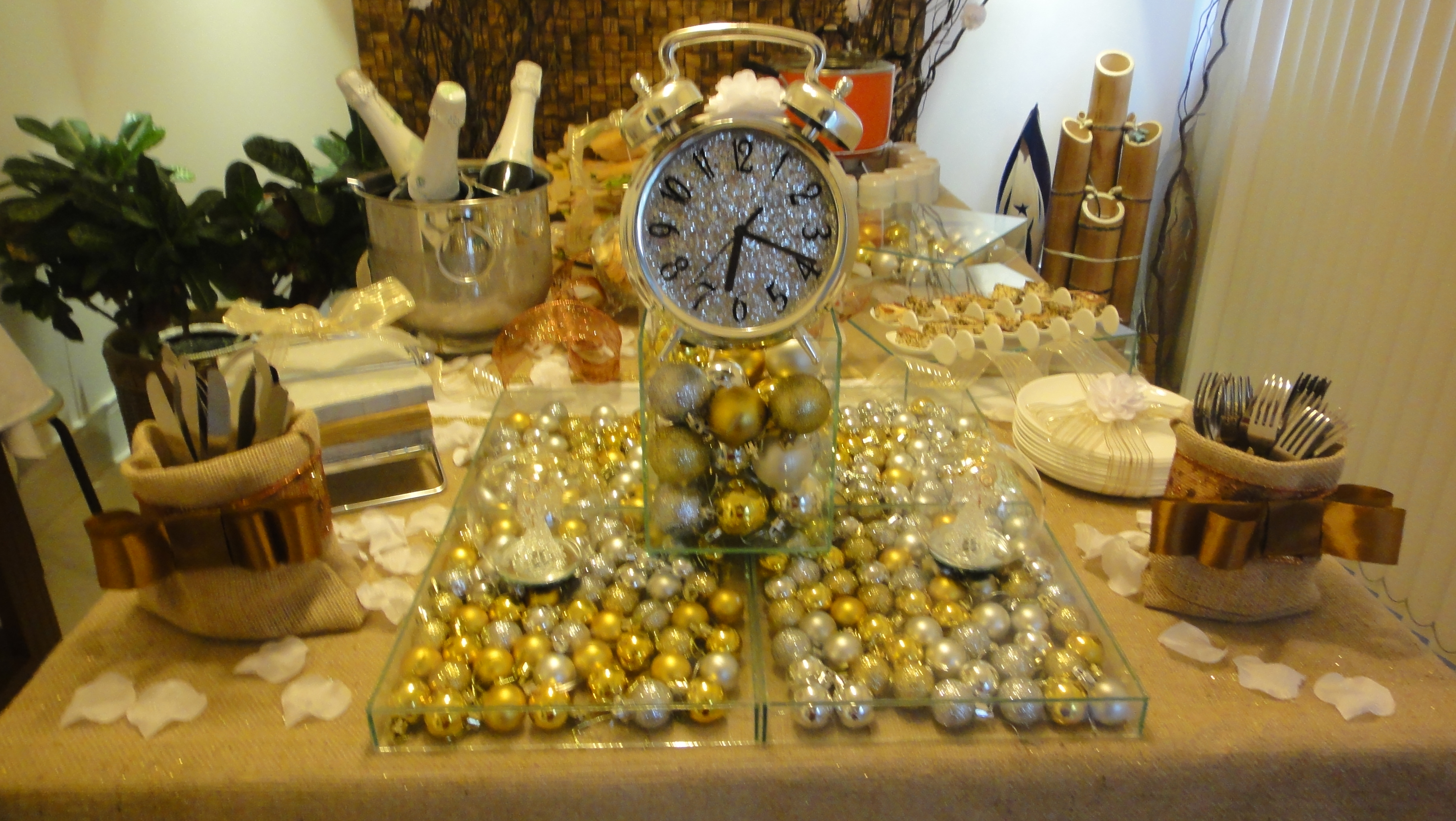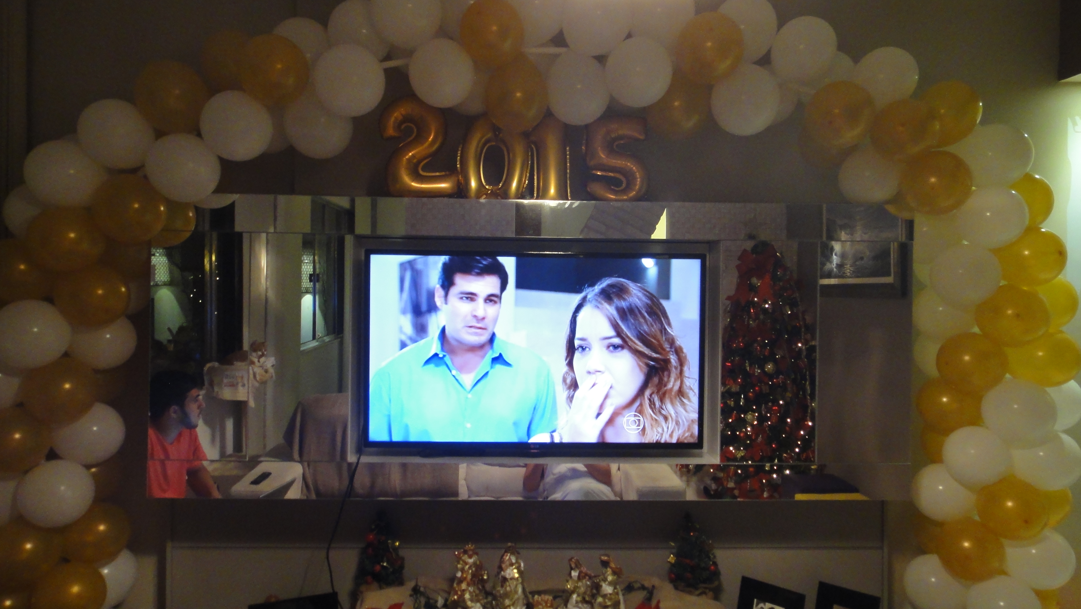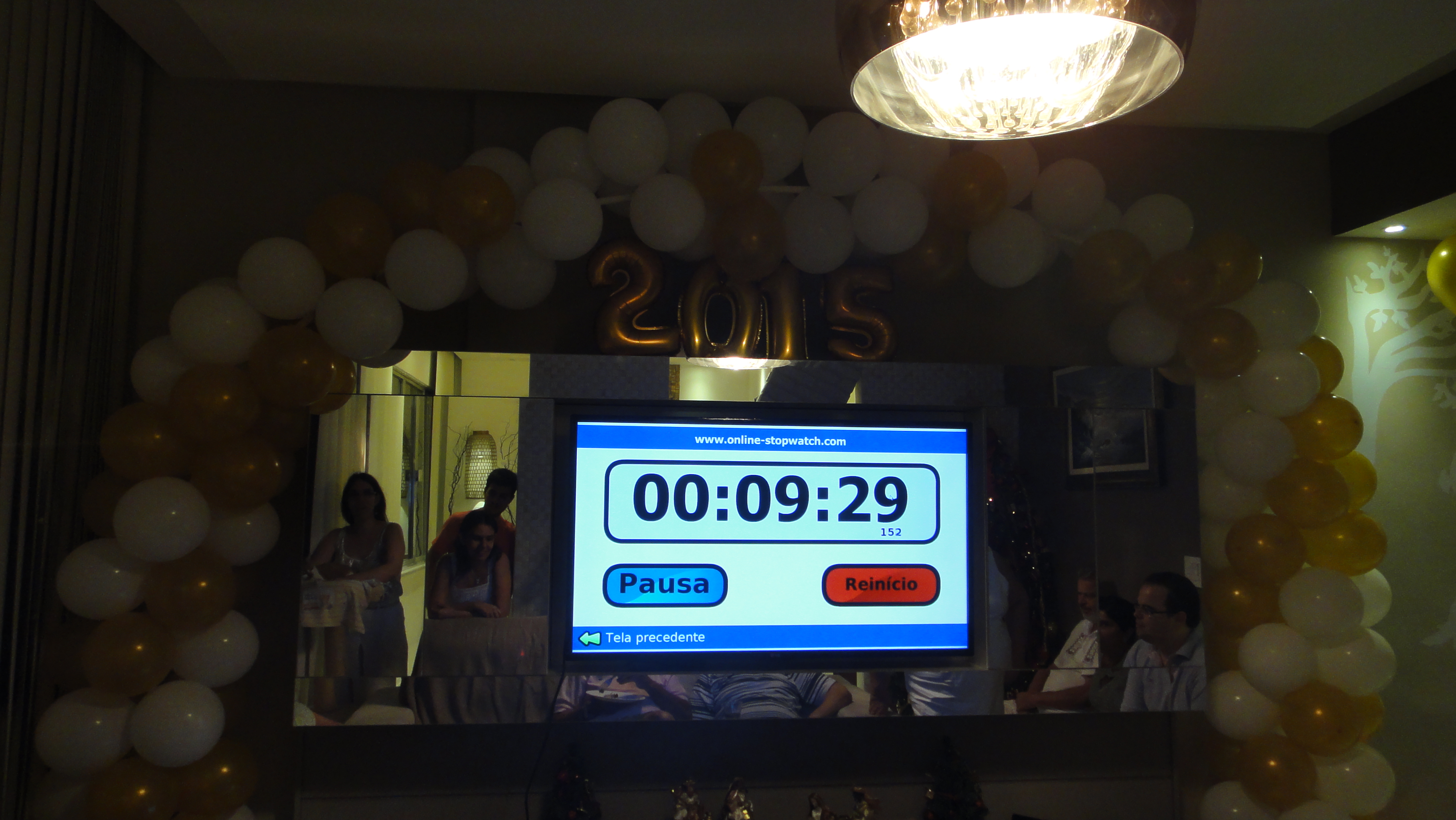 Aproveitei a minha estante para montar o cronômetro oficial da festa. Consegui um site que disponibiliza cronômetro on line, conectei um notebook na TV e estava feito meu painel de contagem regressiva. Para ficar mais ano novo fiz um arco de balões e coloquei um 2015 laminado. Só faltaram os fogos, mas depois do Gato Raul aqui em casa percebi o quanto eles fazem mal aos bichinhos.