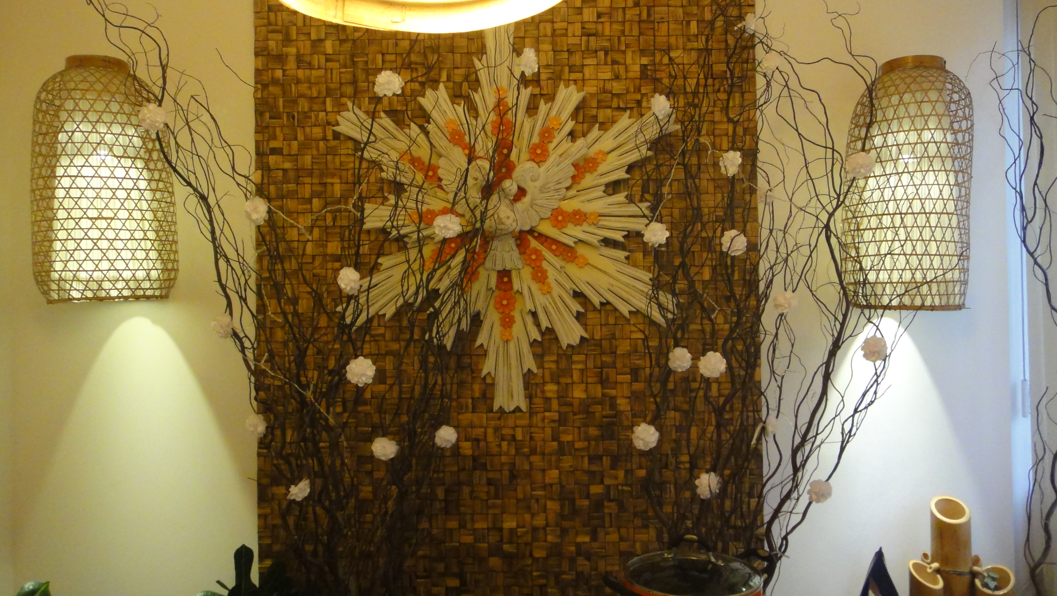 Vou começar com a decoração do corredor de entrada da minha casa. Resolvi fazer uma “cortina” de boa sorte. Cobri o teto com balões de látex dourados e brancos e pendurei fitinhas do Senhor do Bonfim. Tentei conseguir gás hélio para os balões, mas com o fim de ano parece que esgotaram todos os estoques. Fiz com durex mesmo. Gostei bastante do colorido, isso sem comentar a vibração positiva.