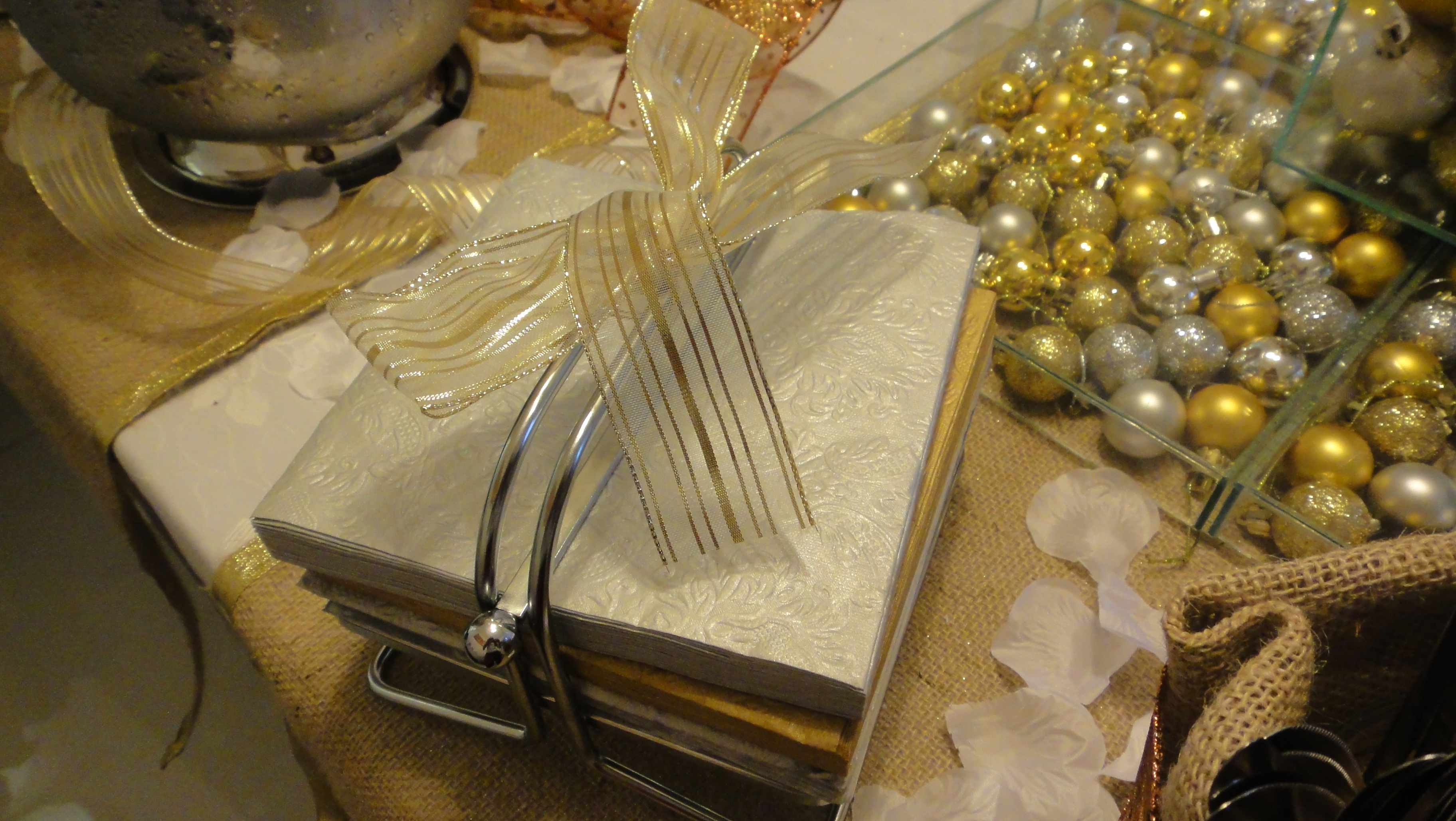 No porta-guardanapos coloquei guardanapos de papel dourados e prateados.