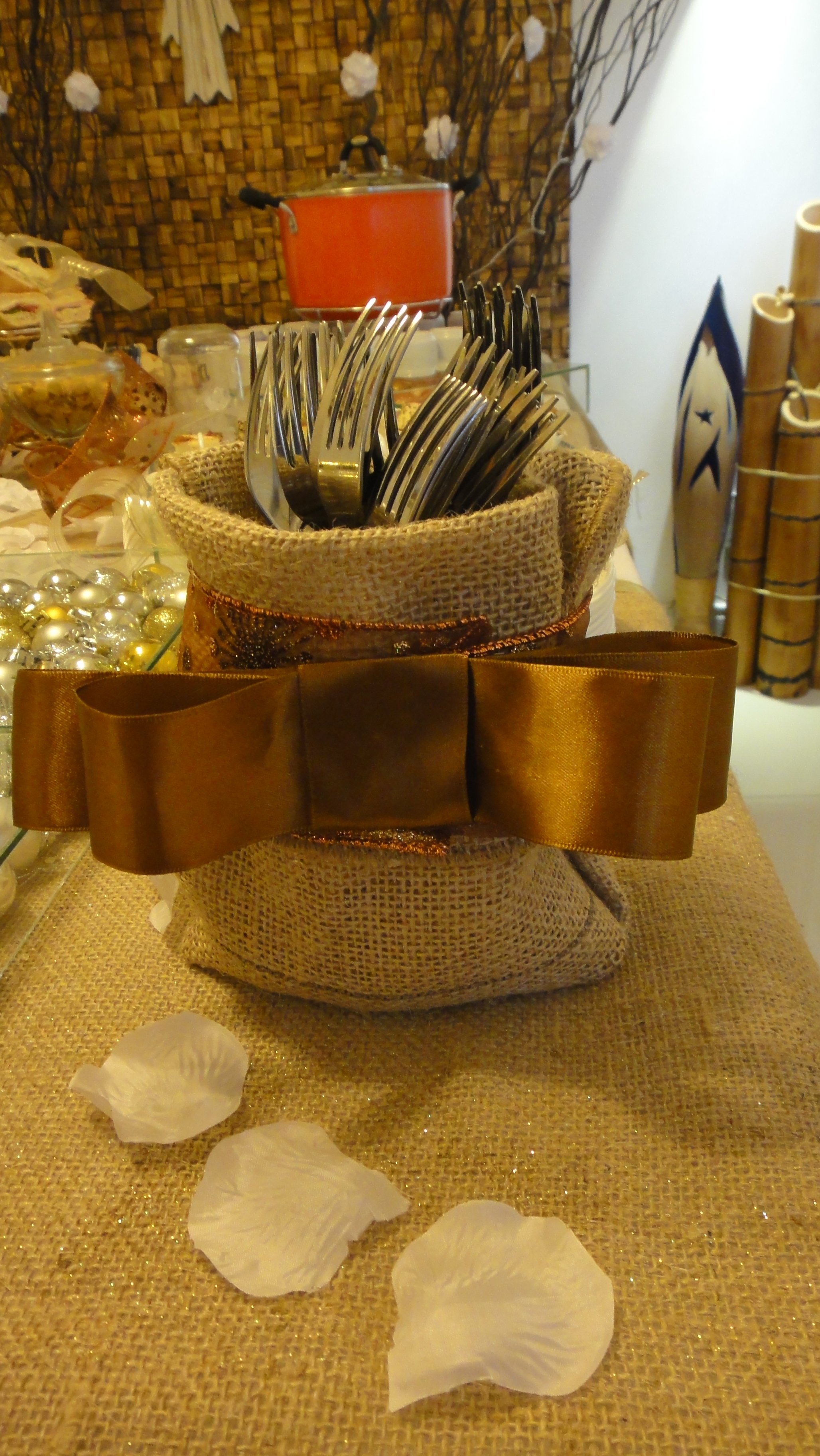 Aproveitei as laterais para pôr os potinhos com os talheres dentro. Eram potes de molho de tomate dentro de um saco de juta comprados prontas em lojas de embalagens para presentes. Coloquei uma fita em volta para segurar o saquinho.
