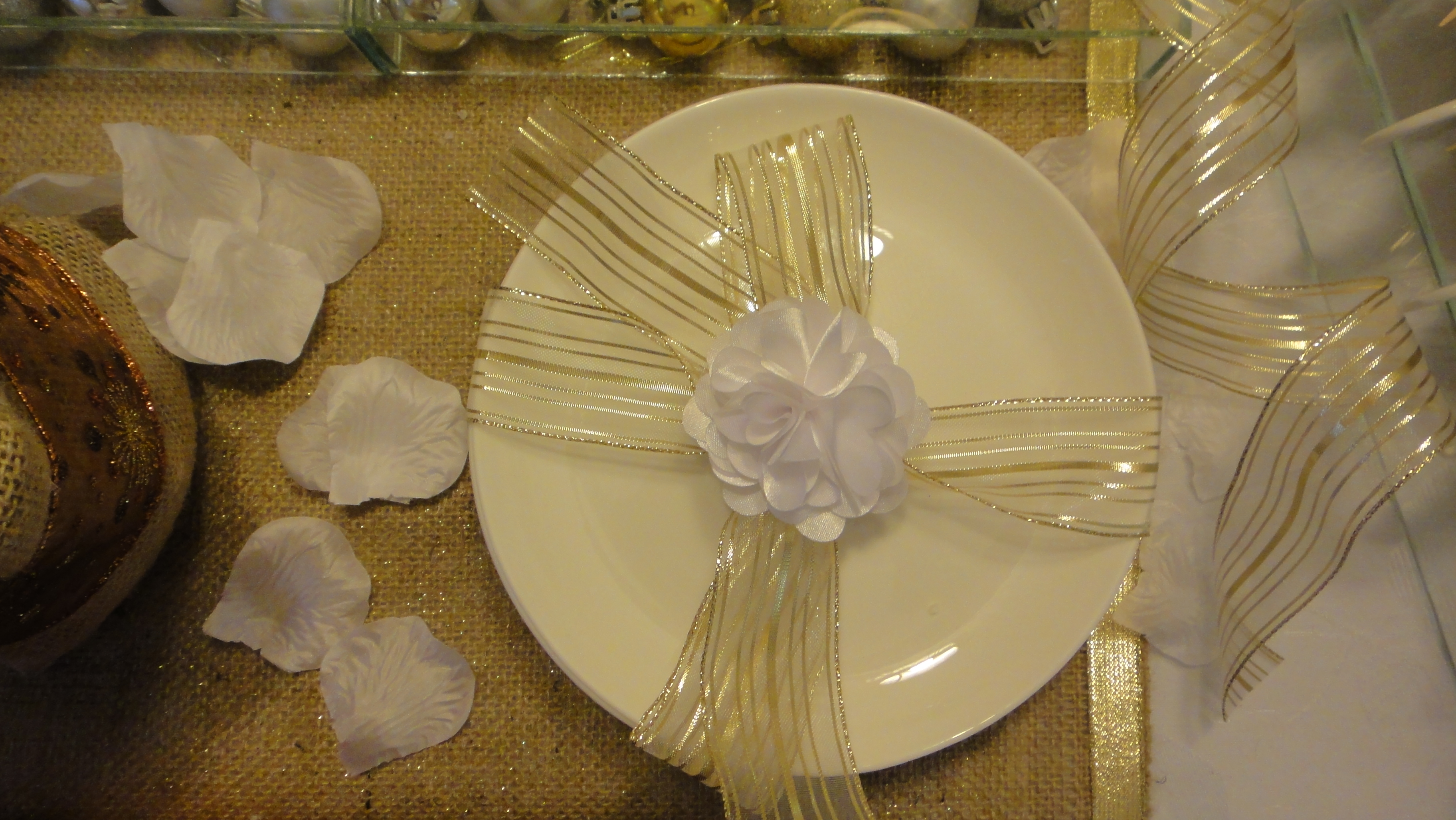 Logo atrás dos potinhos foram colocados os pratos e o porta-guardanapos. Coloquei em ambos um laço de fita dourado. No caso dos pratos arrematei com um flor de pano branca (a mesma que decoraram os galhos secos).