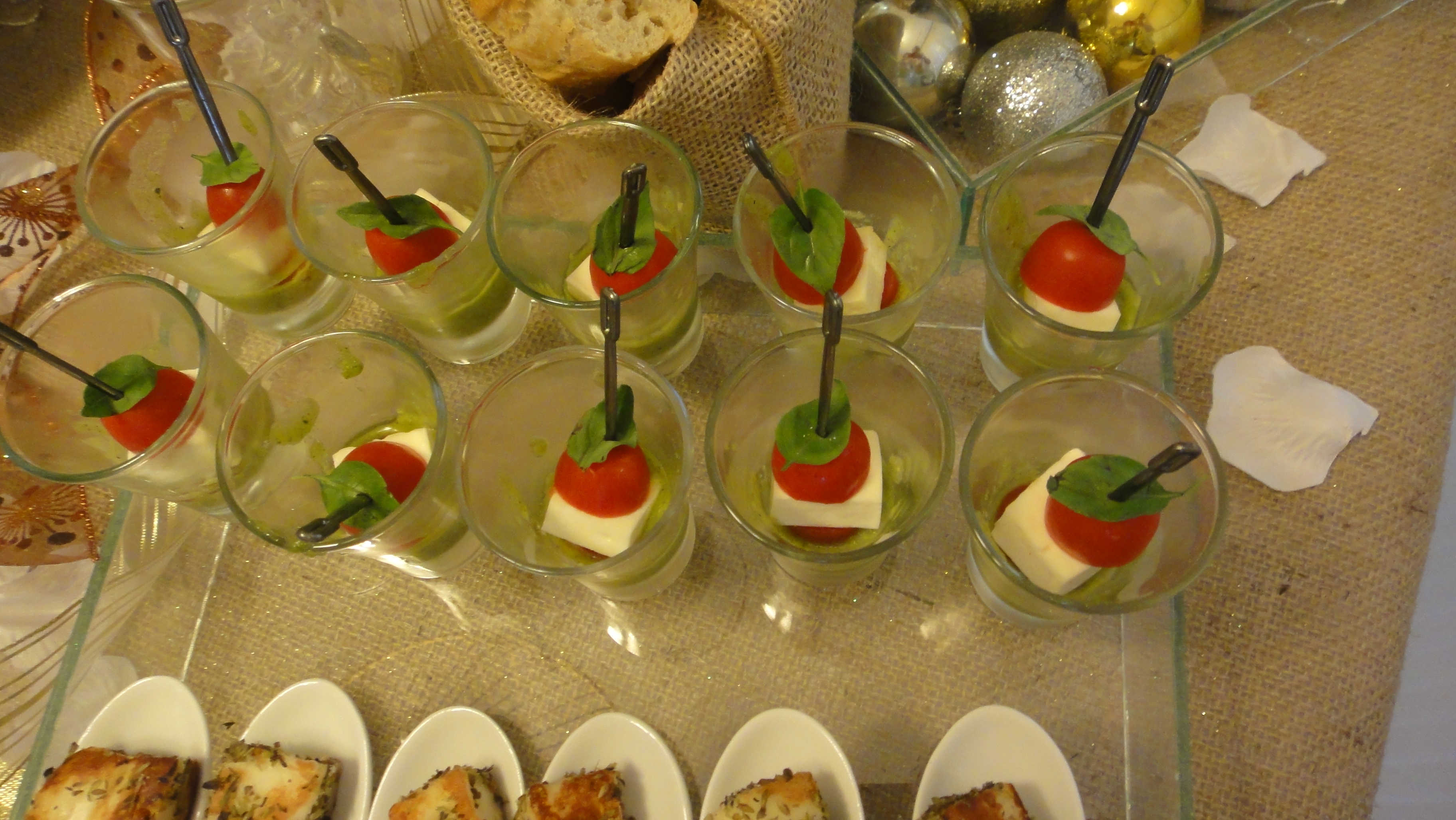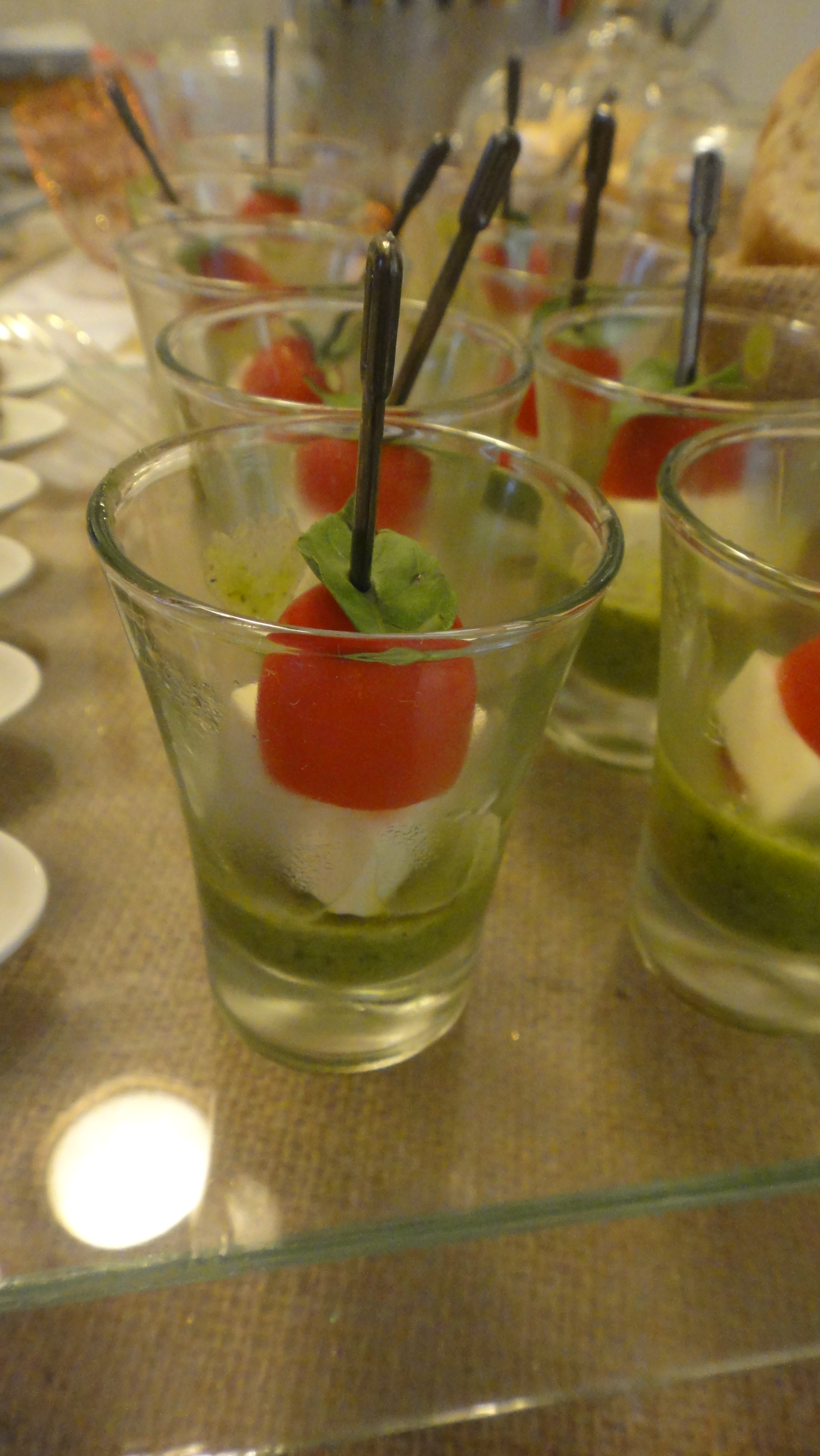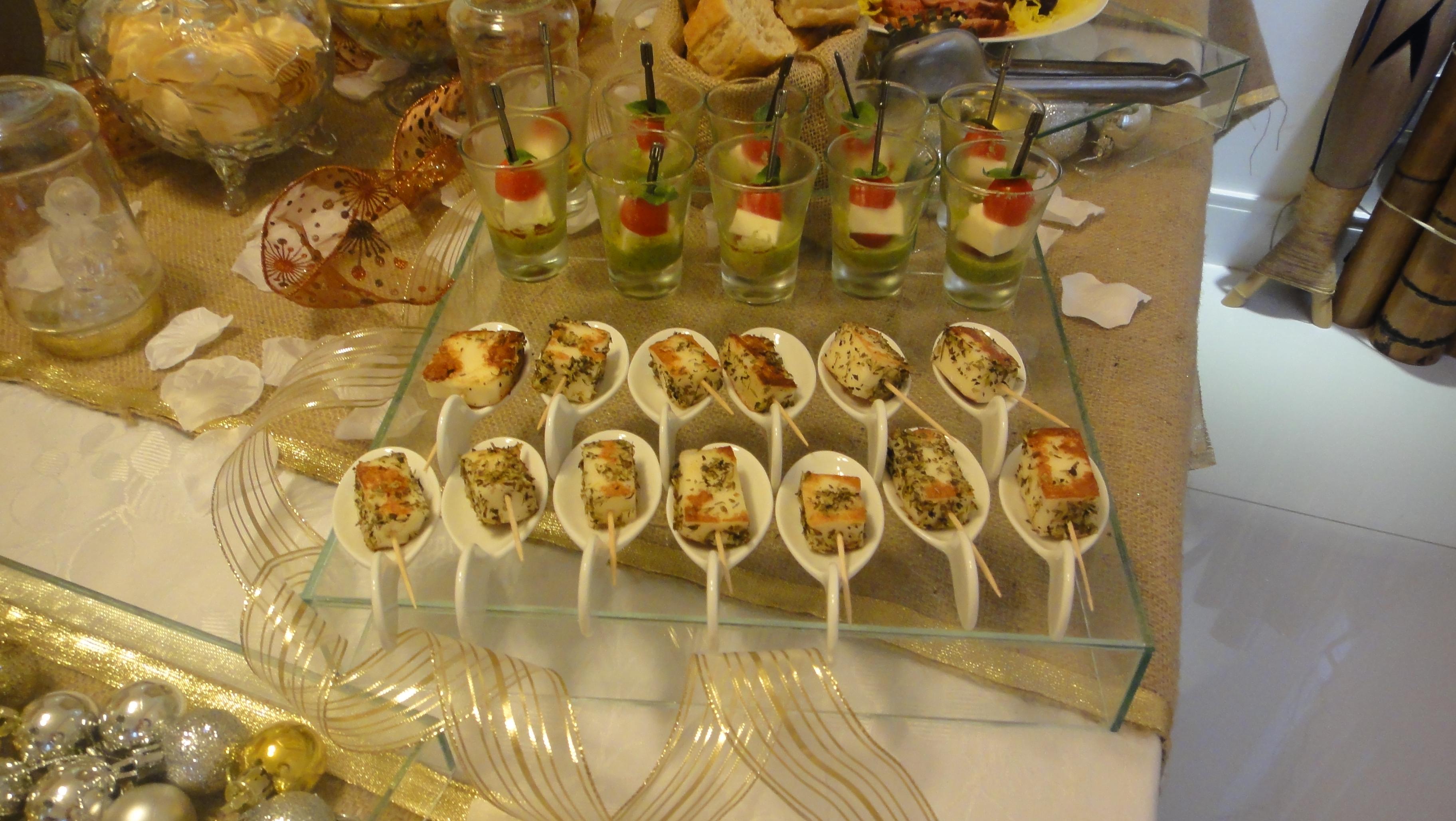 Em seguida vieram as comidinhas. Tenho dois destaques: a bandeja com queijo coalho e salada caprese no copinho e os pães do tender em um saquinho.