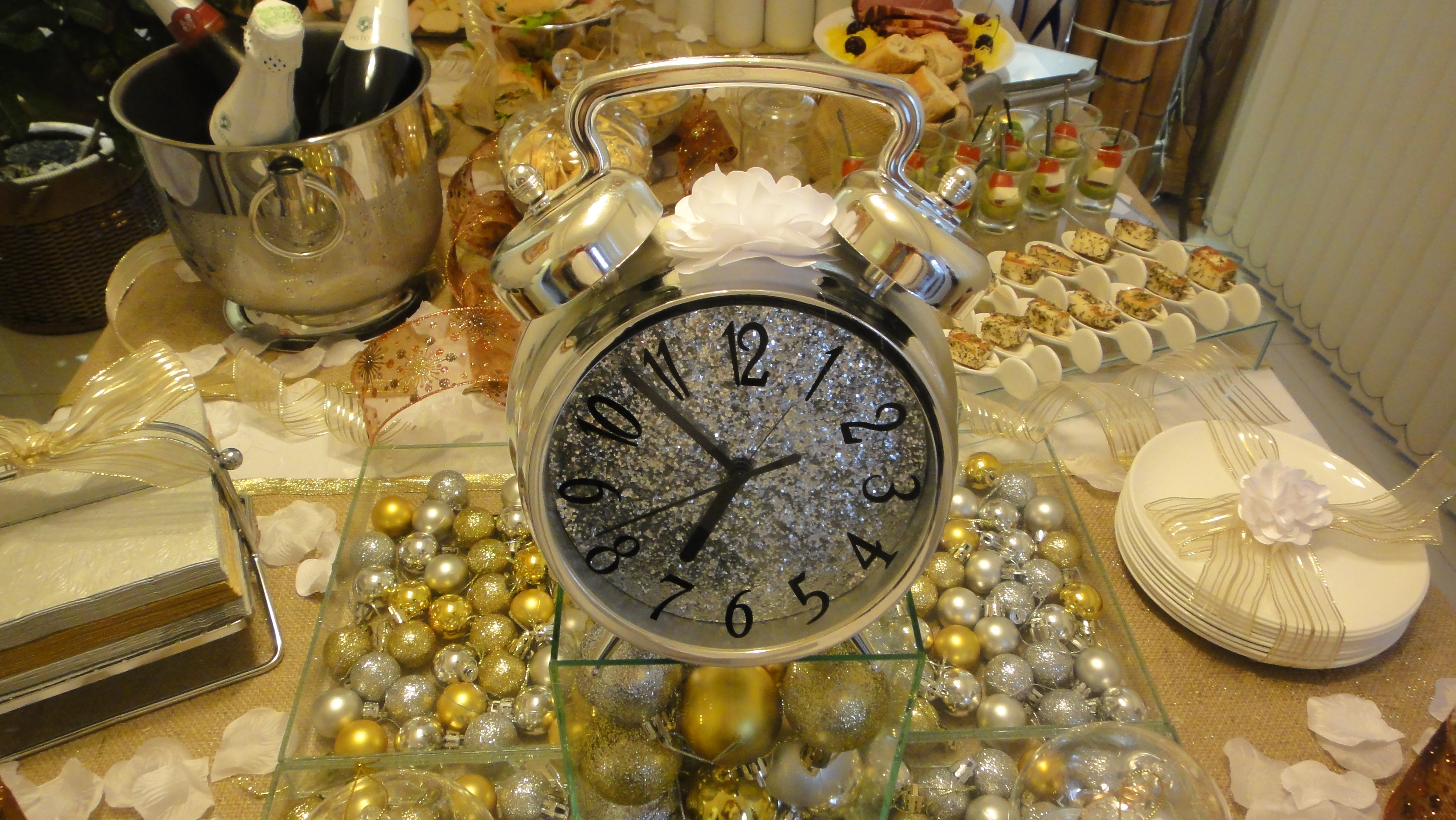 Essa é parte da mesa que os convidados viam logo na entrada da sala. Nada melhor que um relógio para simbolizar o Ano Novo. Ao lado do relógio coloquei anjinhos de cristal que eu já tinha em casa. Foram comprados em Gramado.