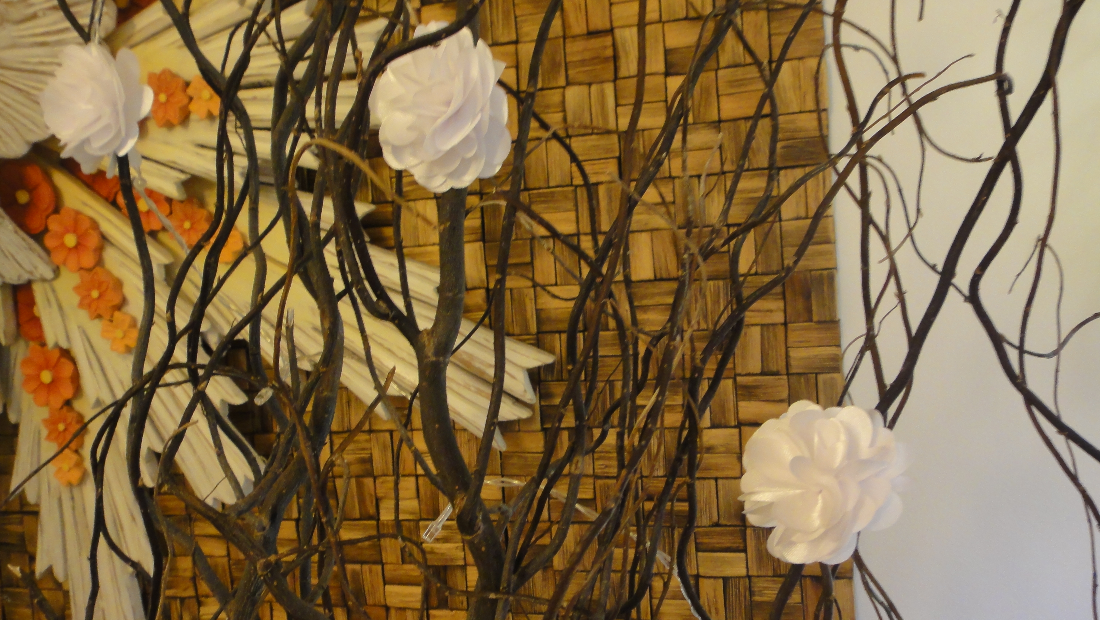 O fundo da mesa foi feito com os galhos secos decorados com flores de pano brancas. Para combinar com essas flores espalhei pétalas brancas pela mesa.