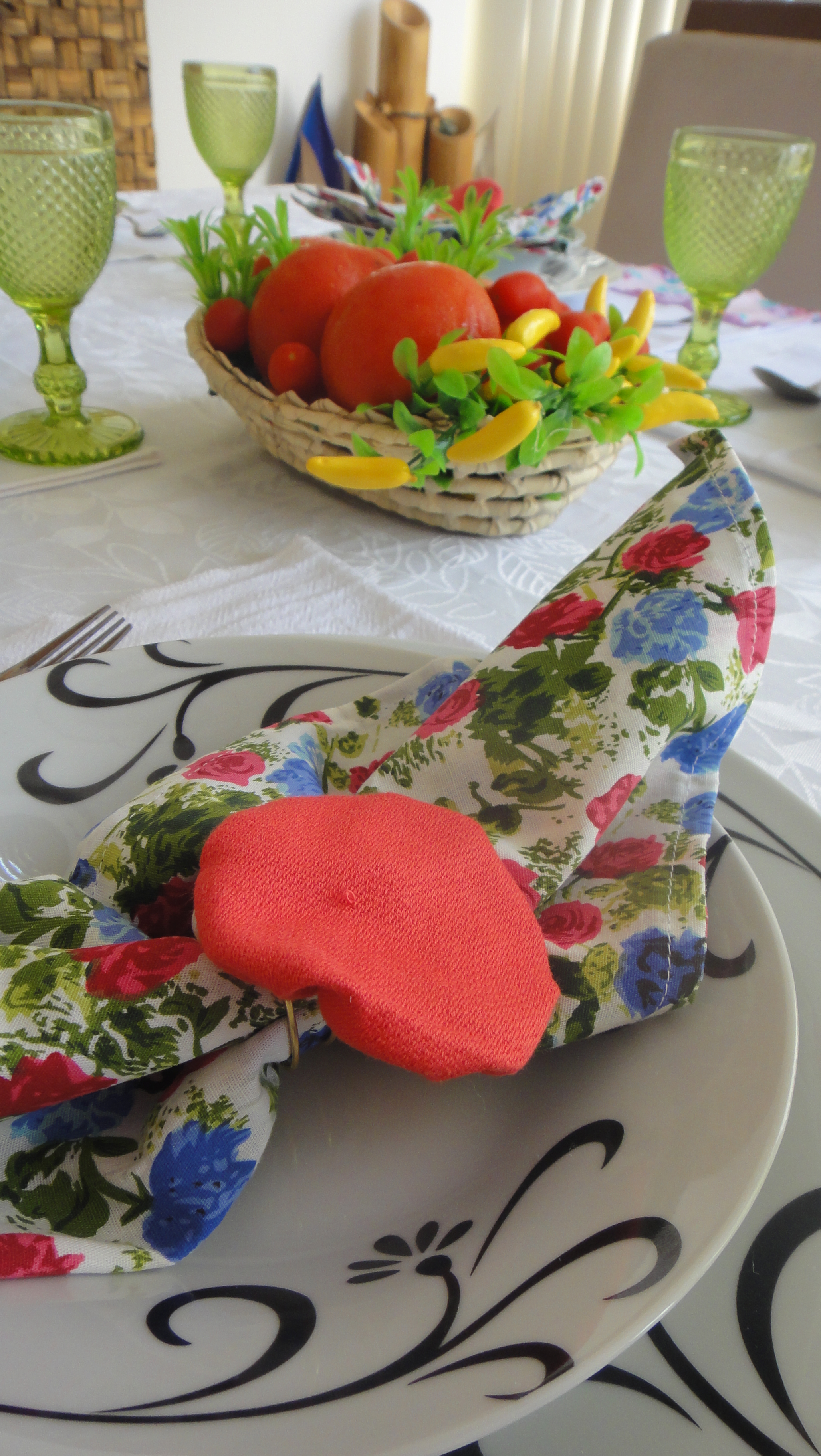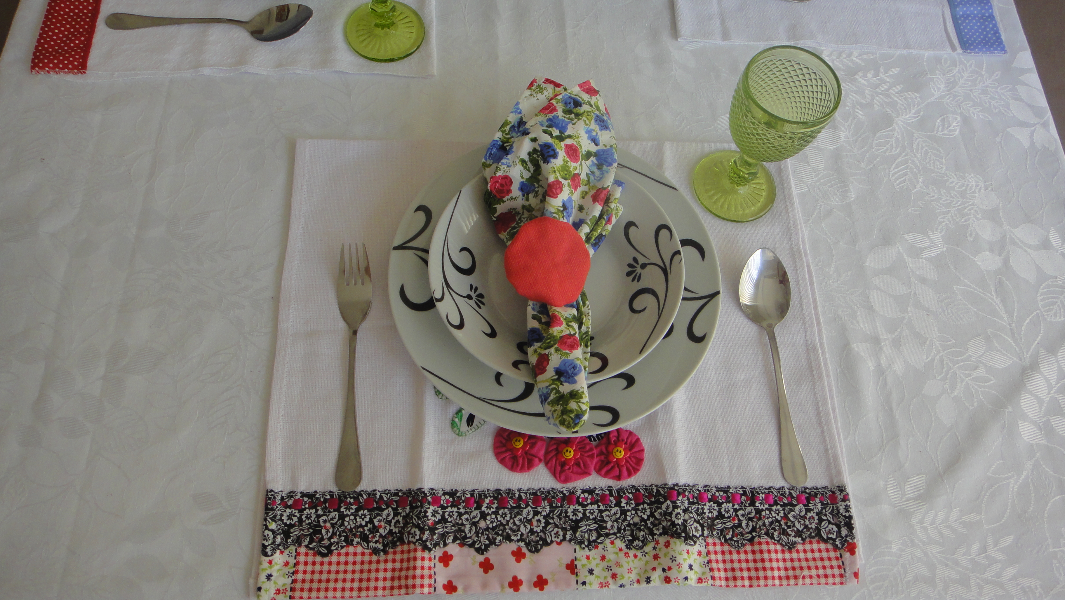 Usei uns guardanapos coloridos e “vesti” o porta-guardanapos com um fuxico. O lugar pronto ficou assim: