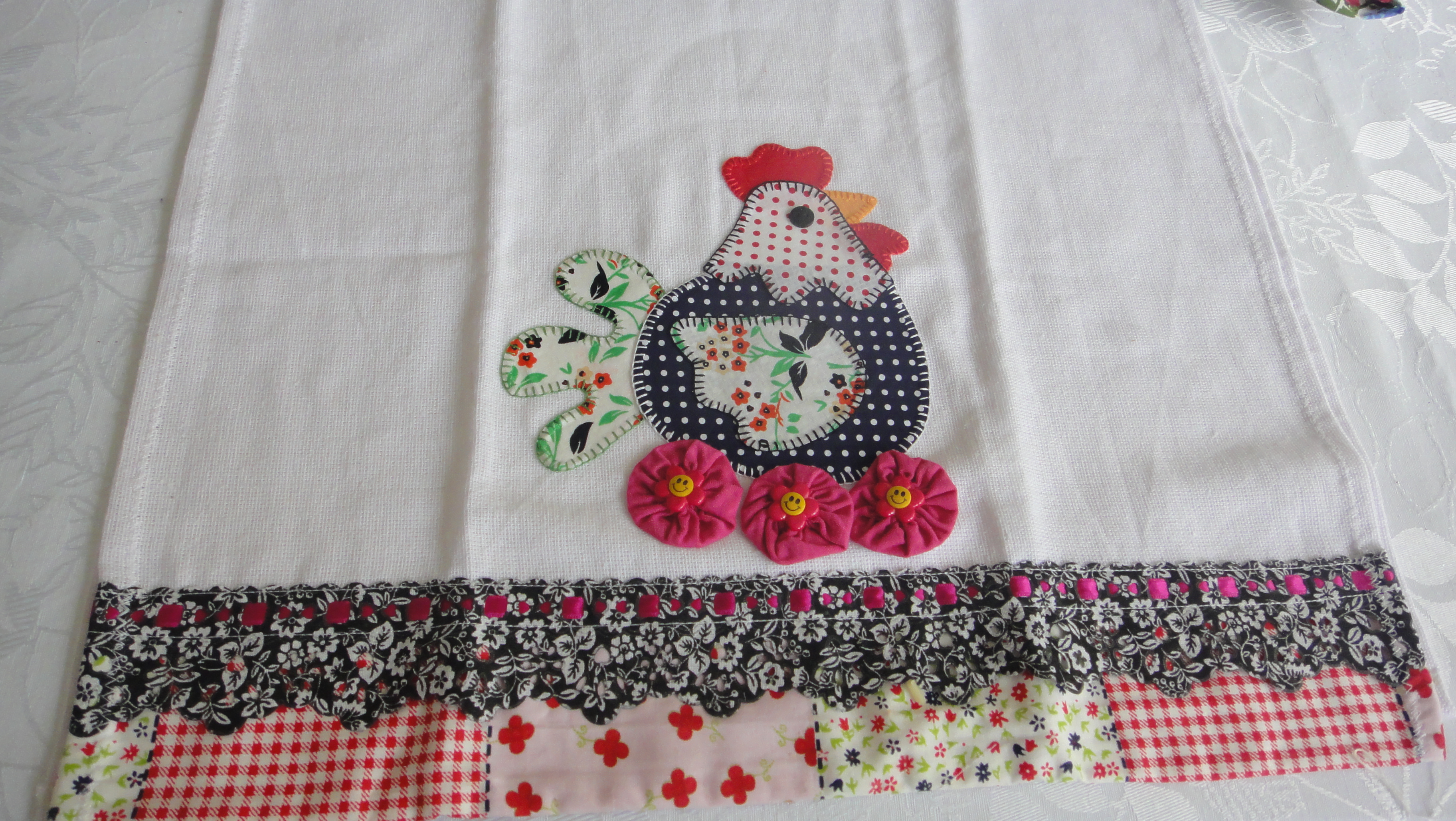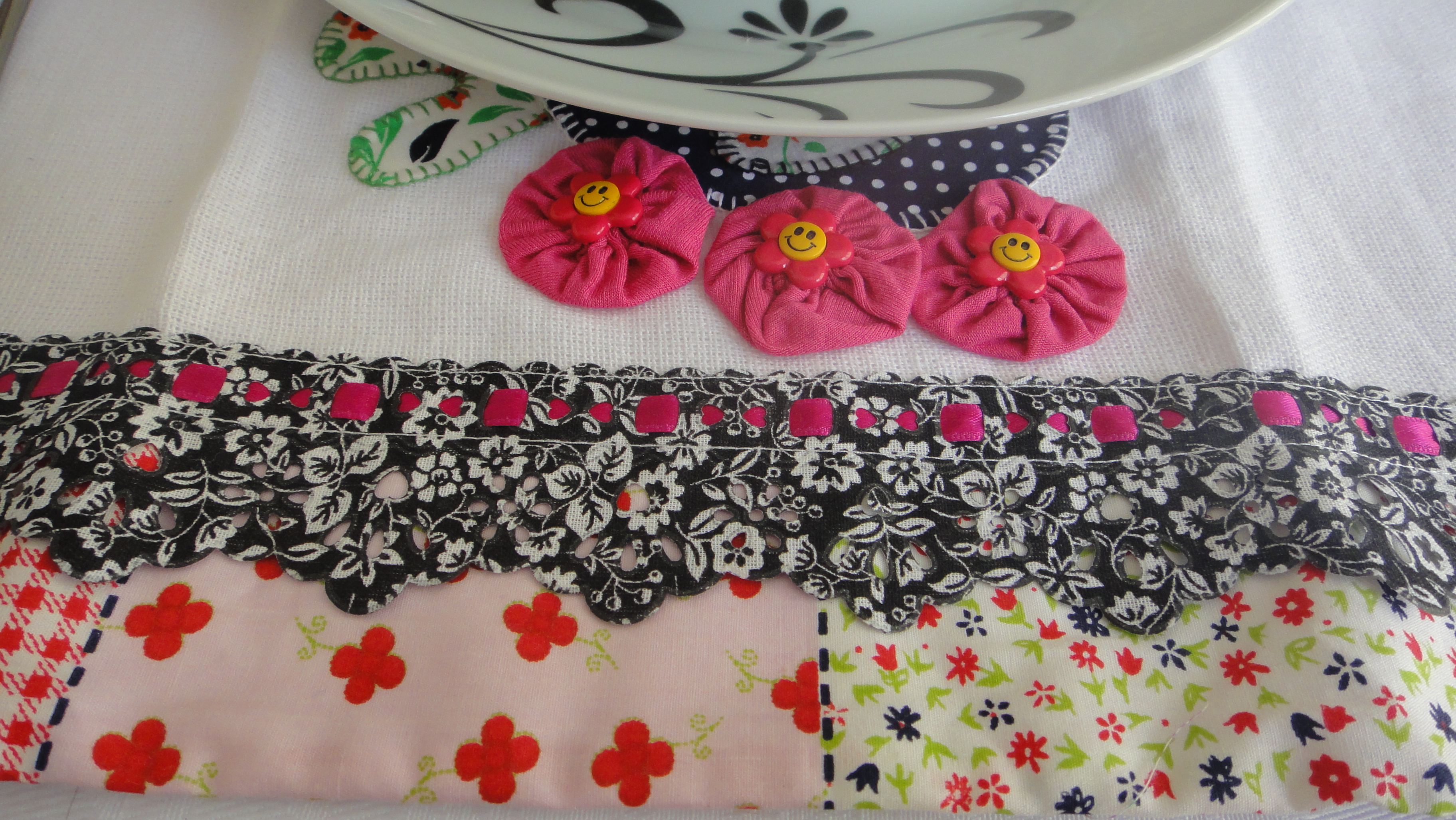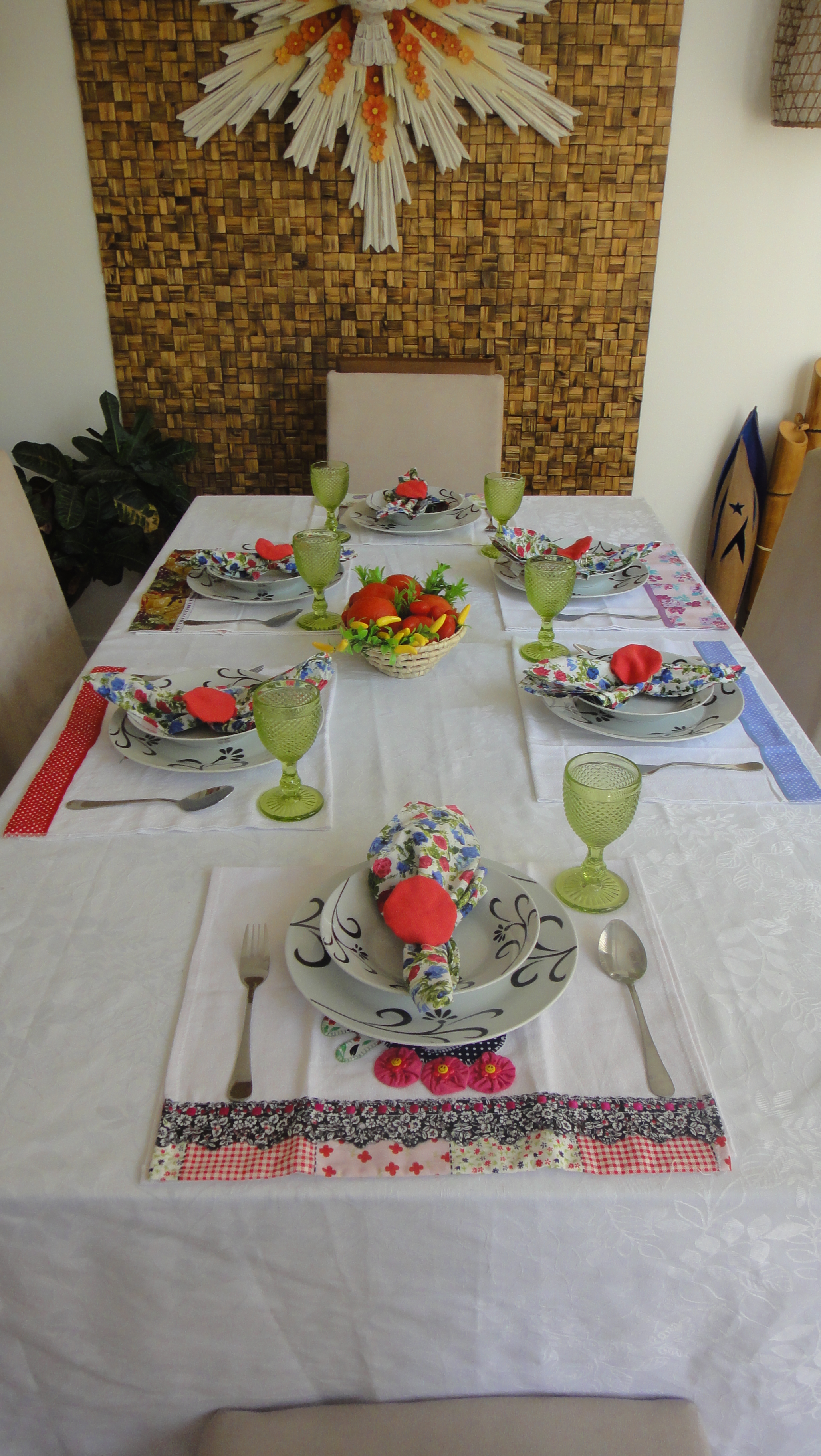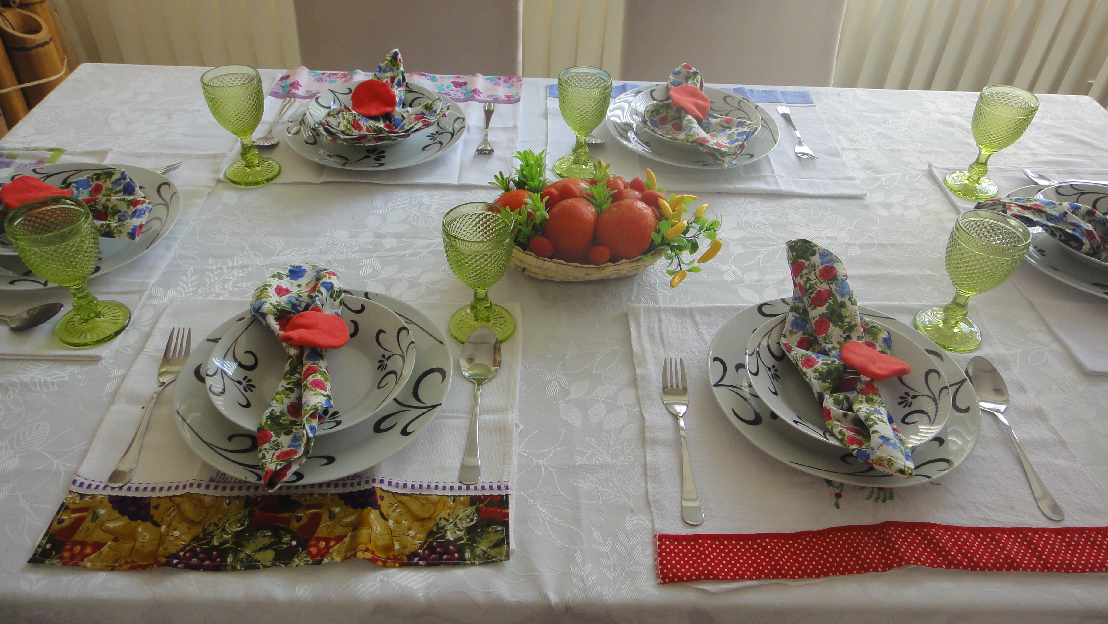 Escolhi para lugar americano, panos de pratos coloridos e divertidos que tenho em casa. Cada um com desenho e cor diferente.