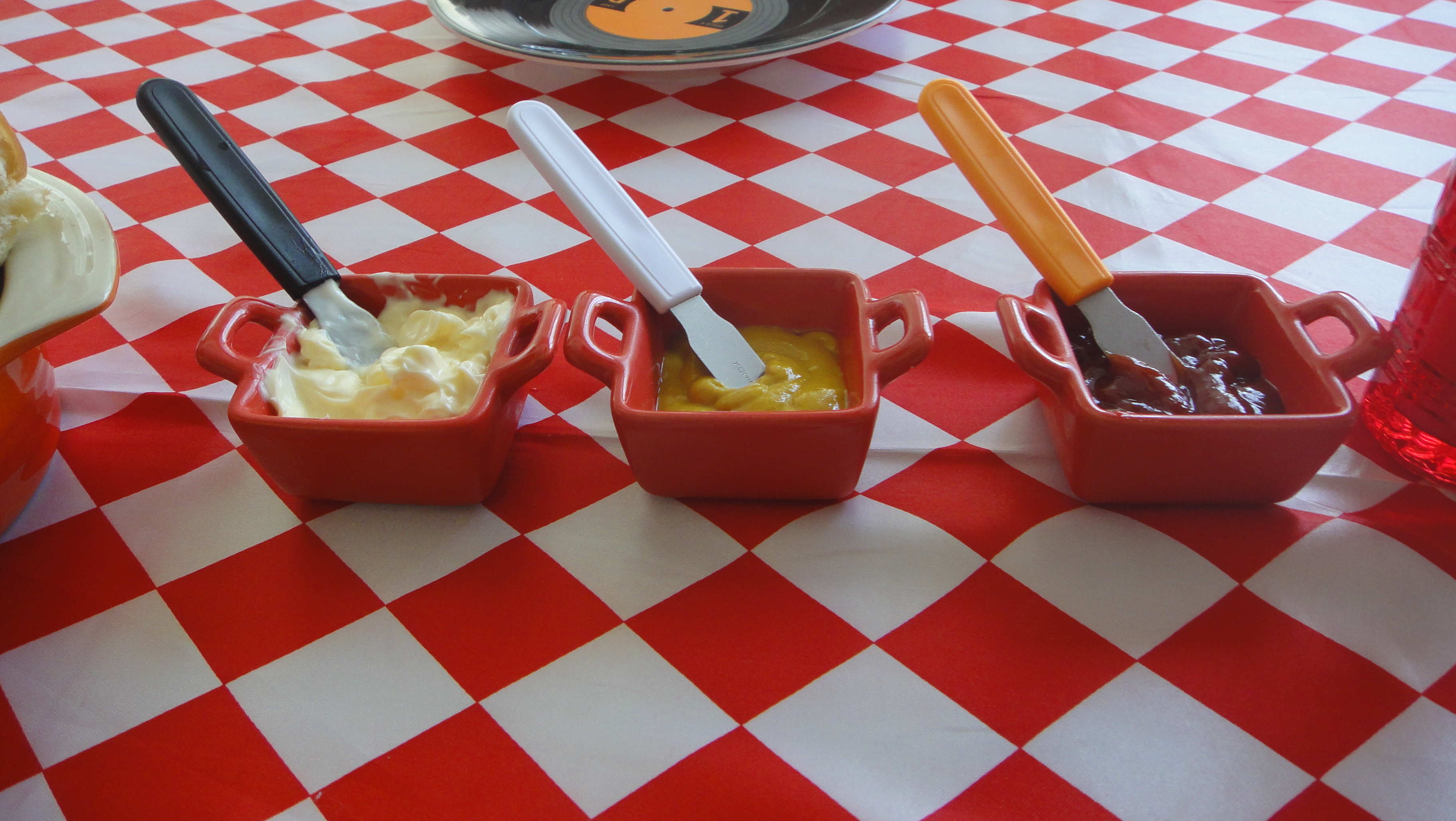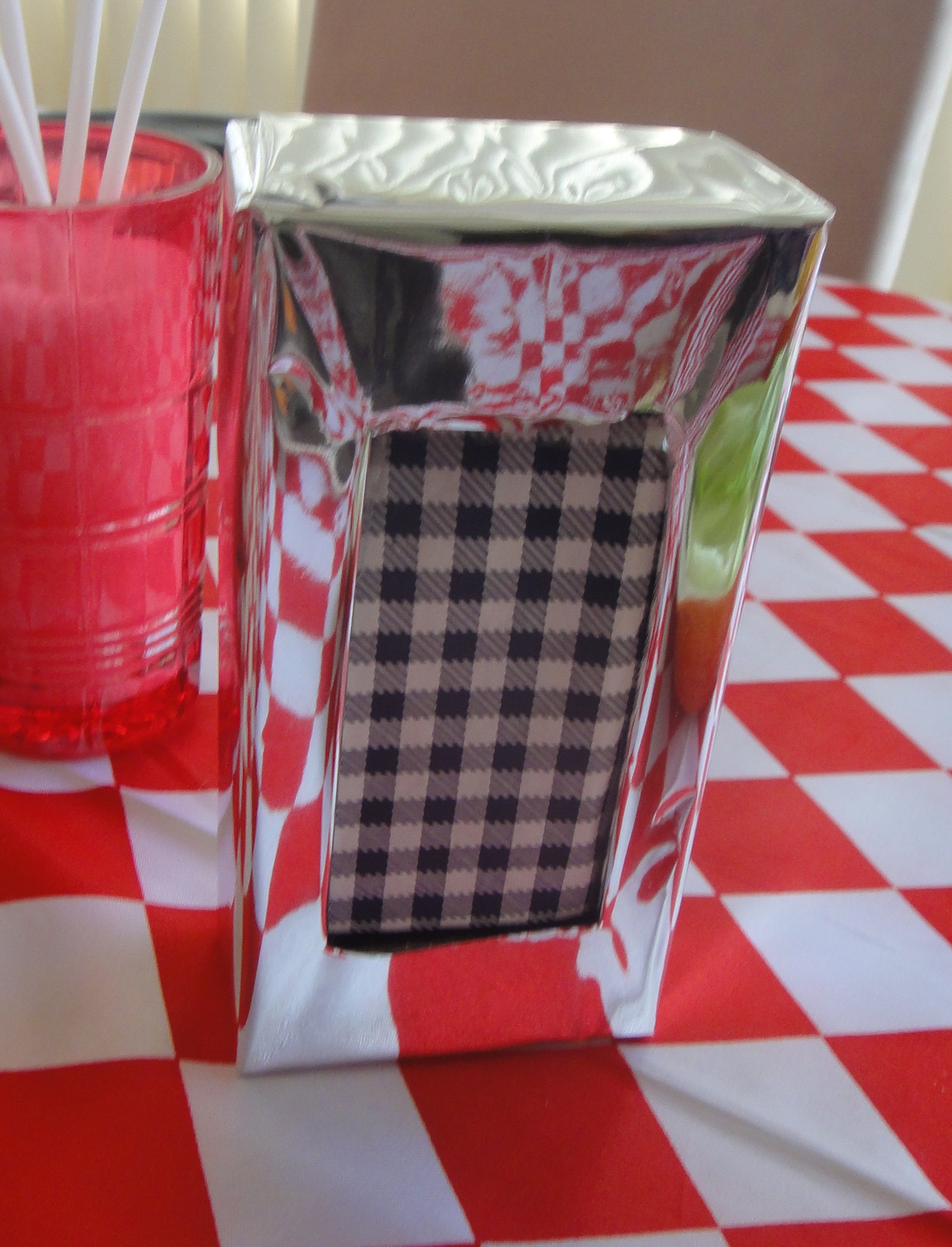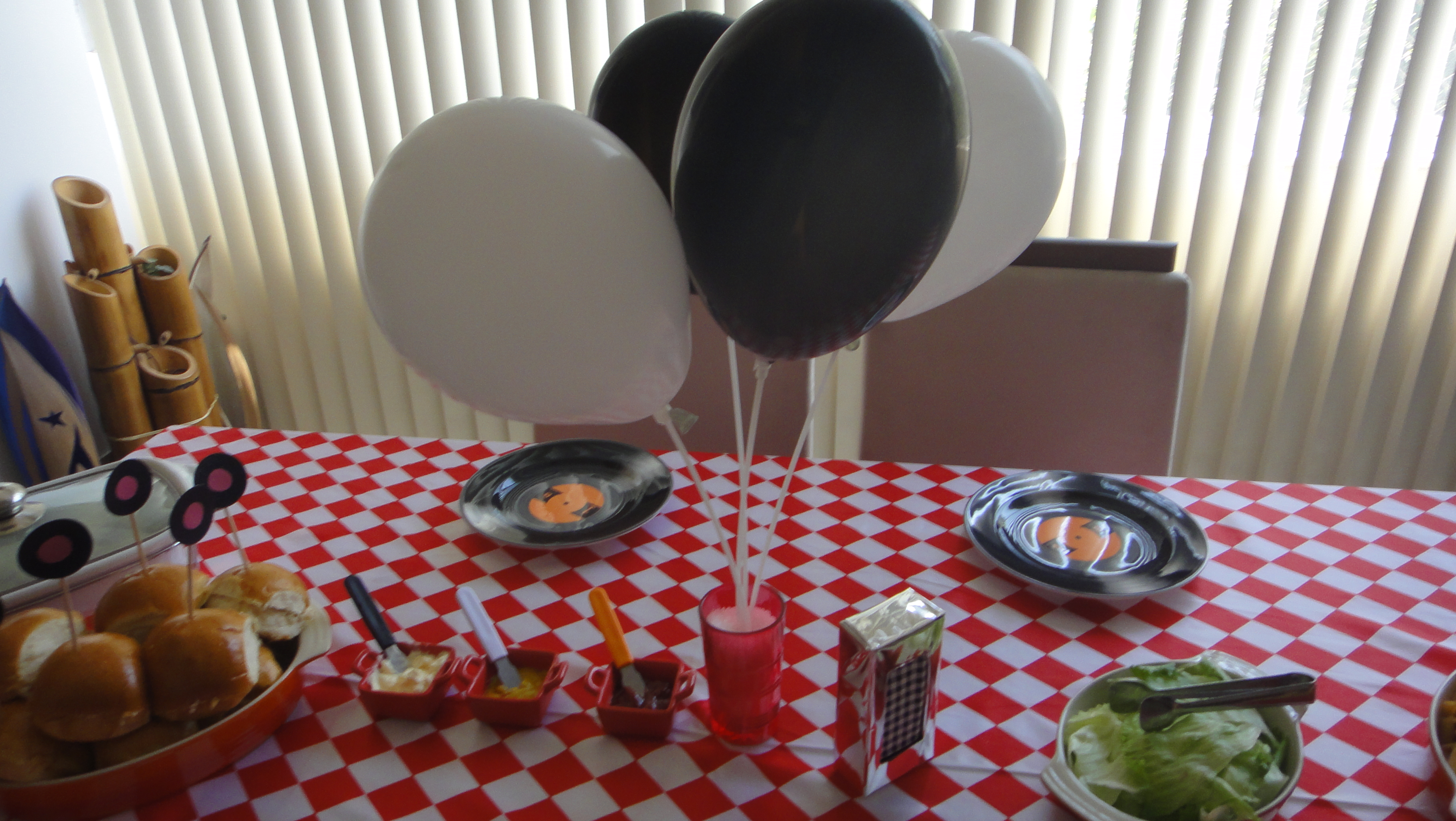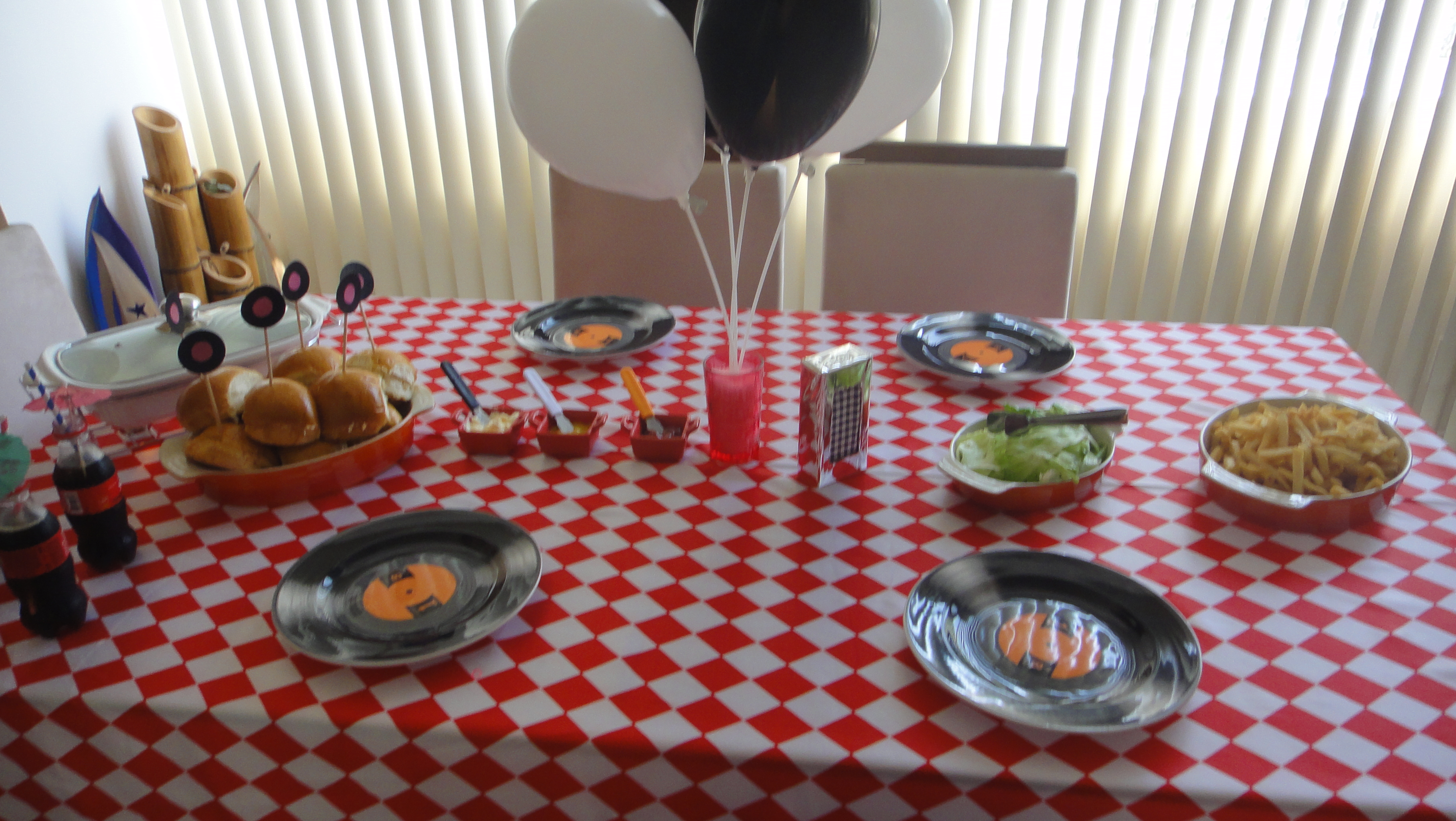 Na minha listinha tinha tecido para fazer uma toalha quadriculada em preto e branco, porta guardanapo estilo bar, balões pretos, scrapbook preto e colorido e canudo coloridos. A ideia era dar um ar de hamburgueria antiga. Obviamente nunca você acha tudo o que quer, logo a toalha virou vermelho e branco e os canudos mudaram de cor, mas acho que mesmo sendo simples, como todas as nossas mesas, ficou charmoso.