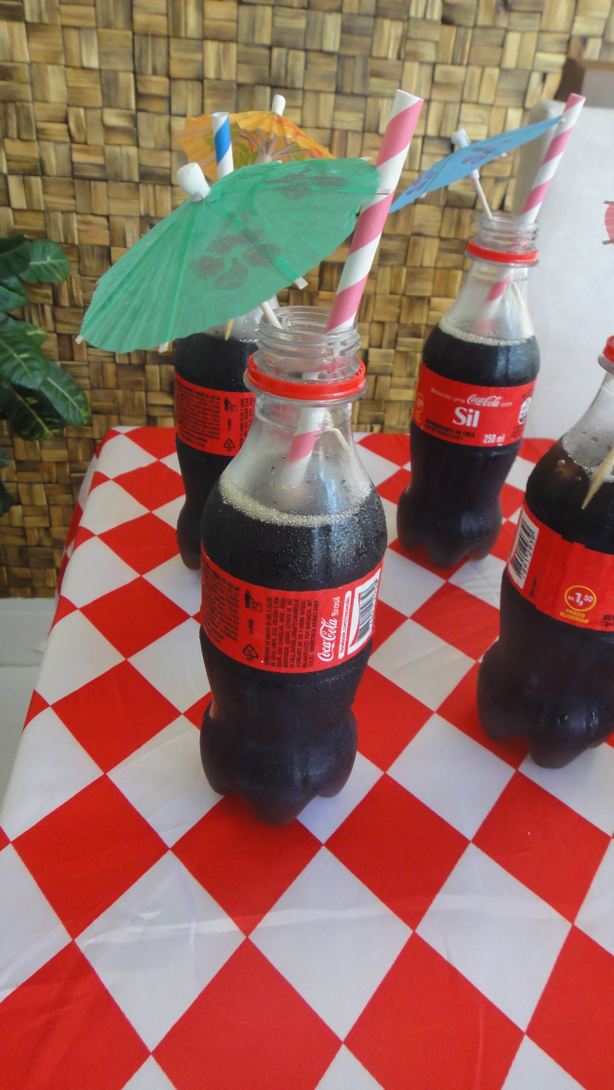 As bebidas foram garrafinhas de refrigerante decoradas com canudos e guarda-chuvas coloridos. Os molhos estavam em panelinhas (aquelas do ano novo).