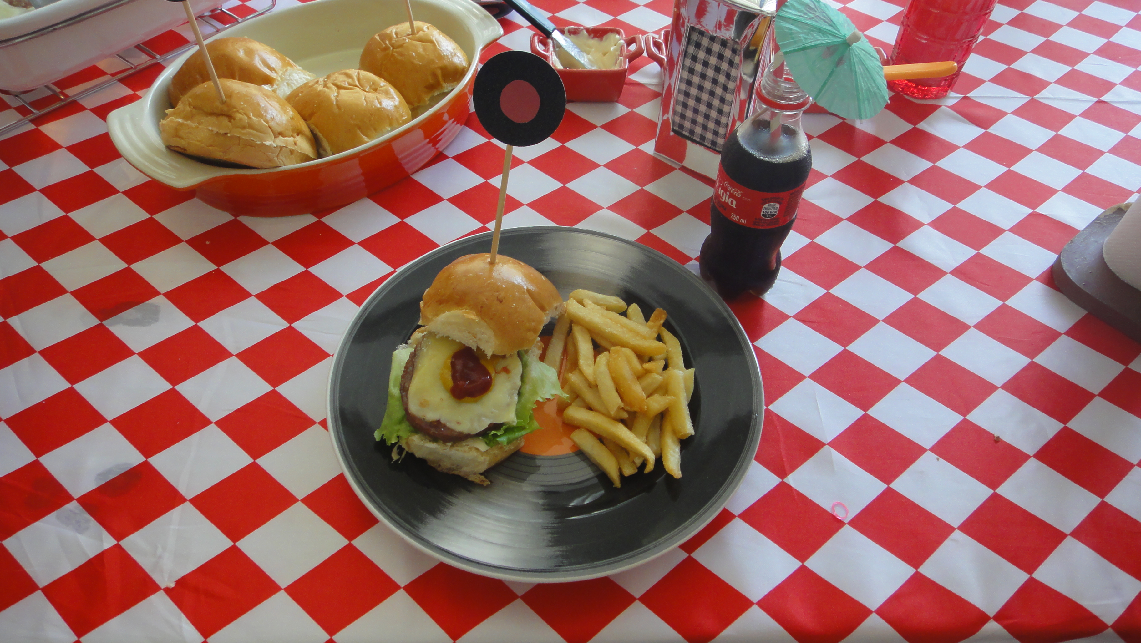 Os hambúrgueres foram montados pelos próprios convidados. Tudo foi colocado em travessas. Usei os pratos em formato de vinil antigo. Eles foram a grande atração.