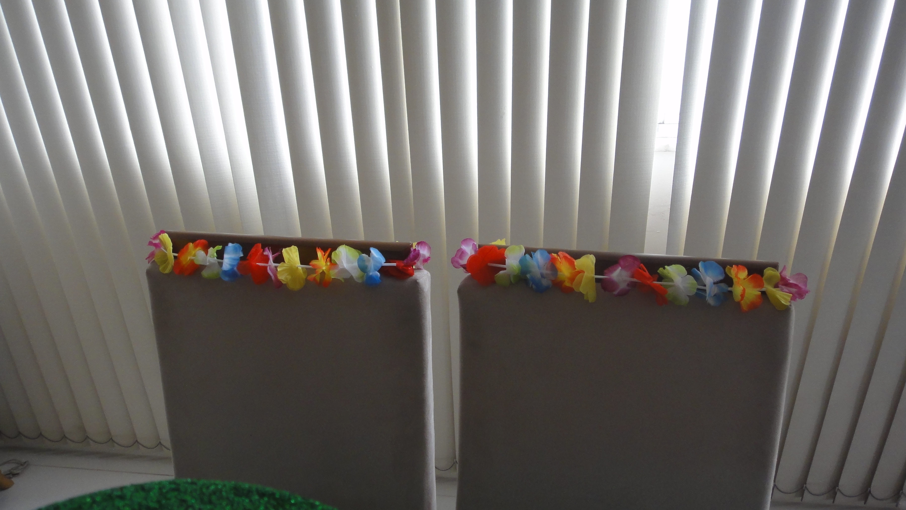 Usei as estrelas prateadas de EVA do Dia de Reis como lugar americano e colares de flores coloridas no entorno imitando sousplats. Esses mesmos colares decoraram as cadeiras.