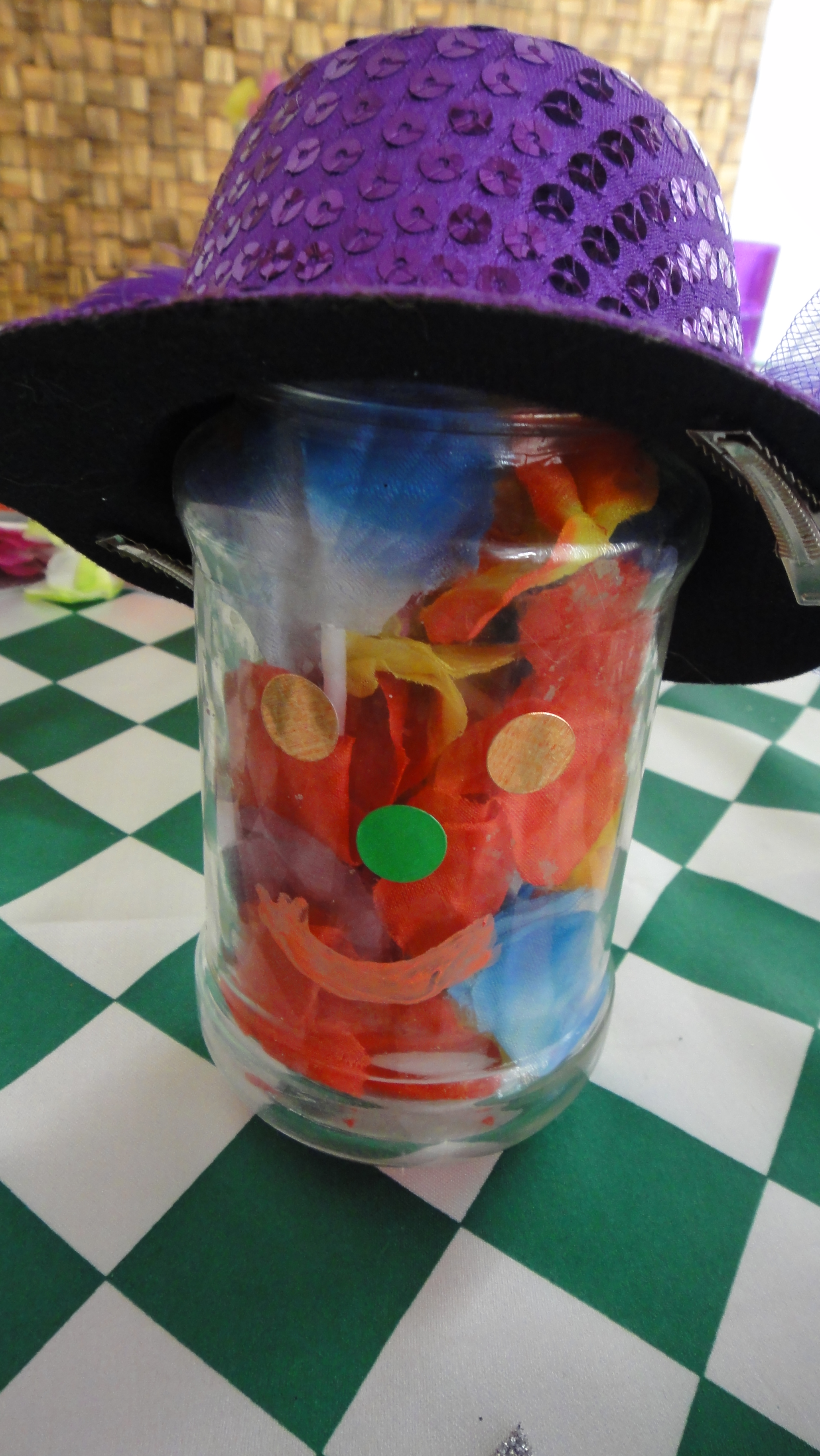 Aproveitei os famosos potes de molho de tomate como “foliões mirins”. Coloquei colares dentro e fiz olhos com as etiquetinhas e boca com batom. Também ganharam chapeis refinados.