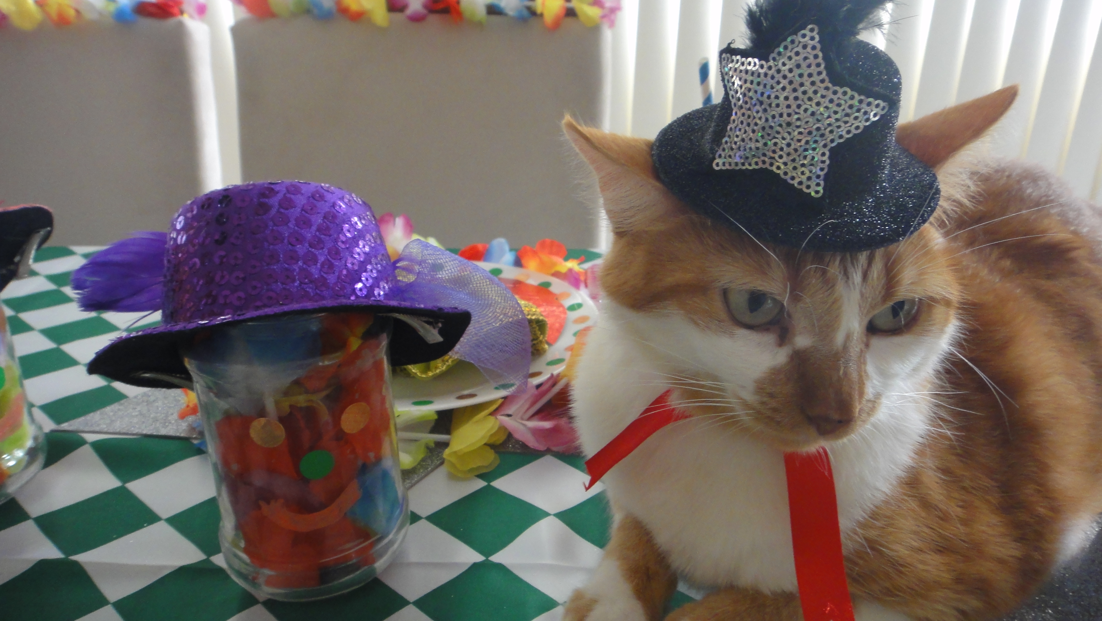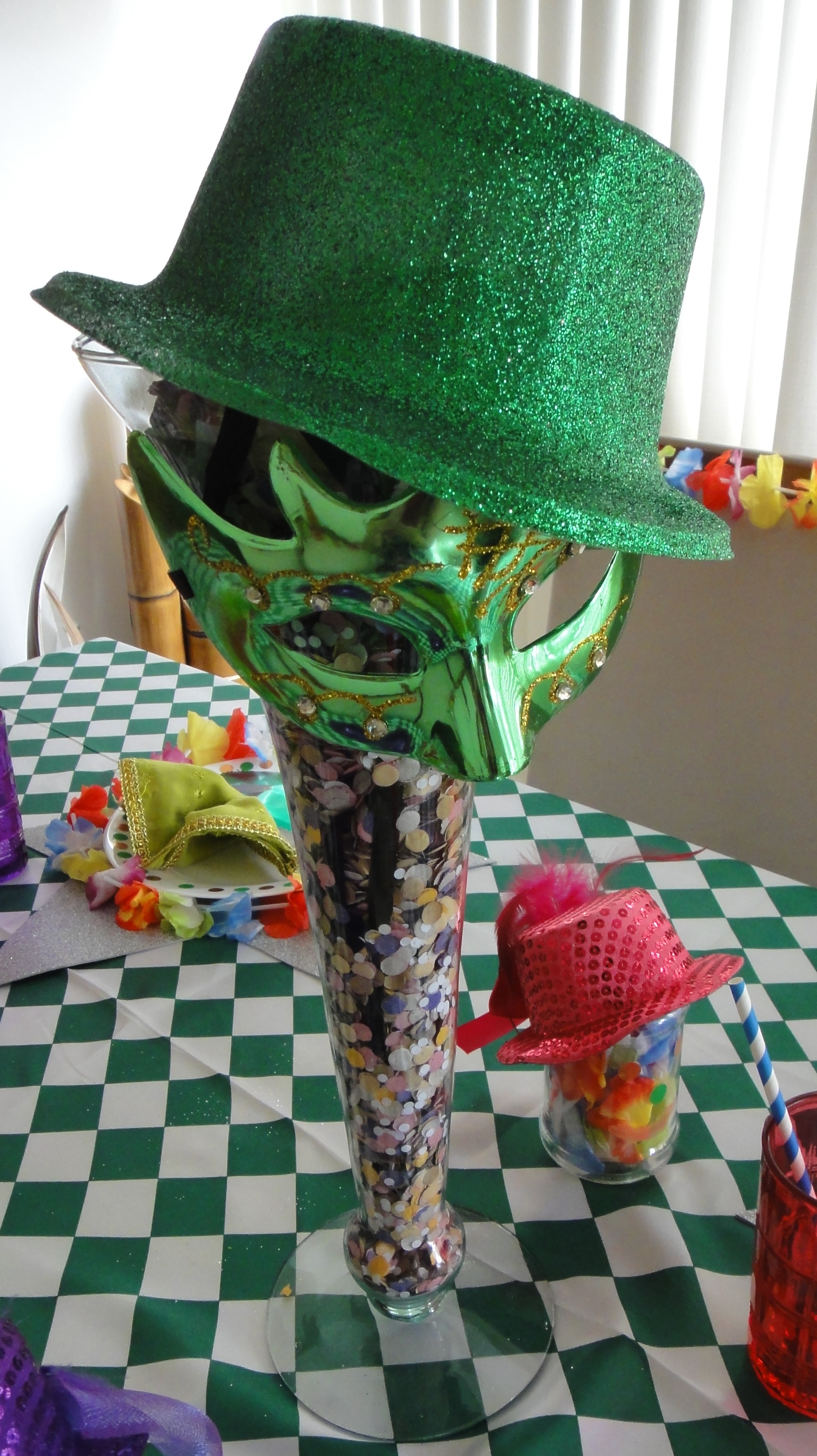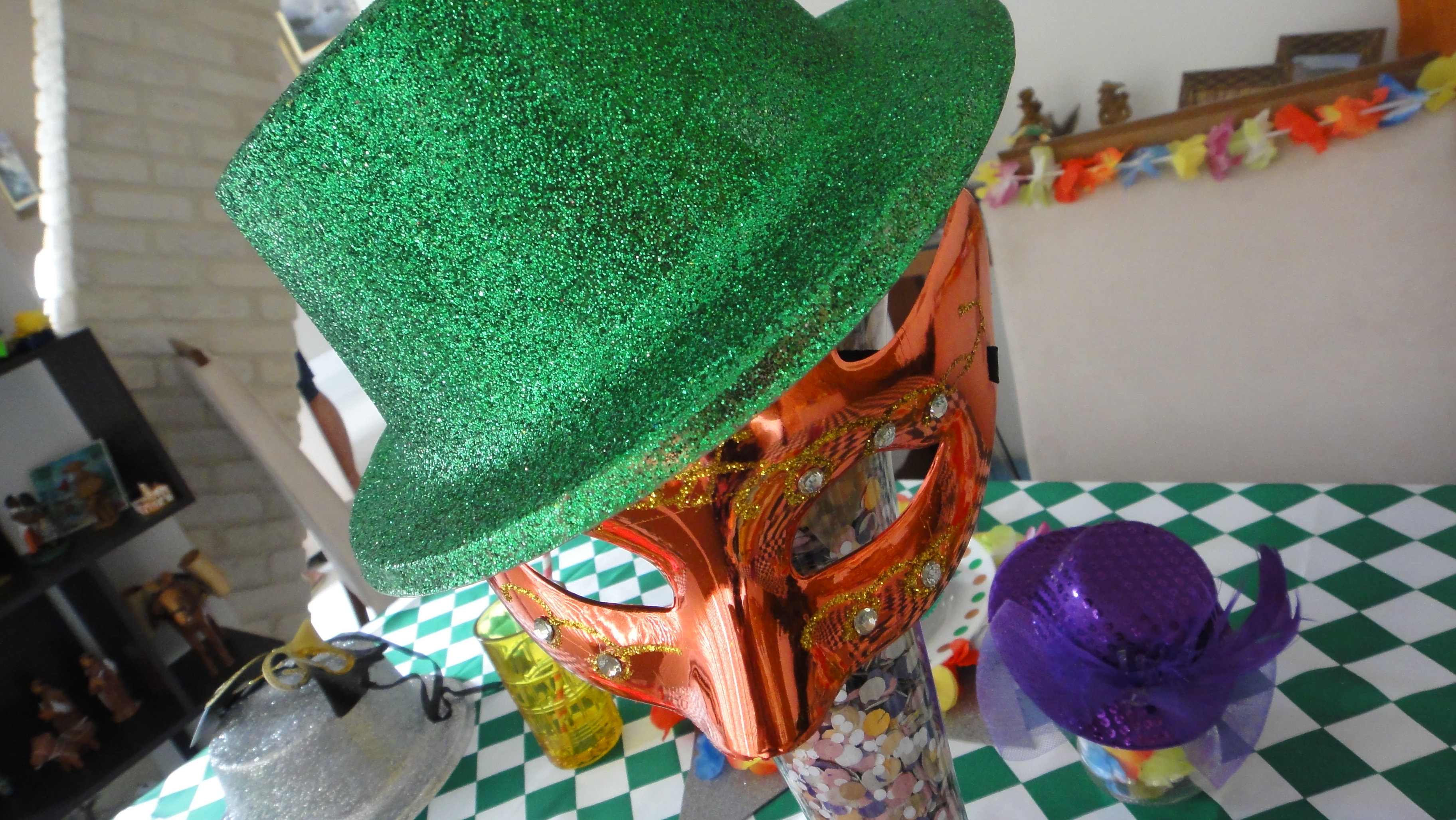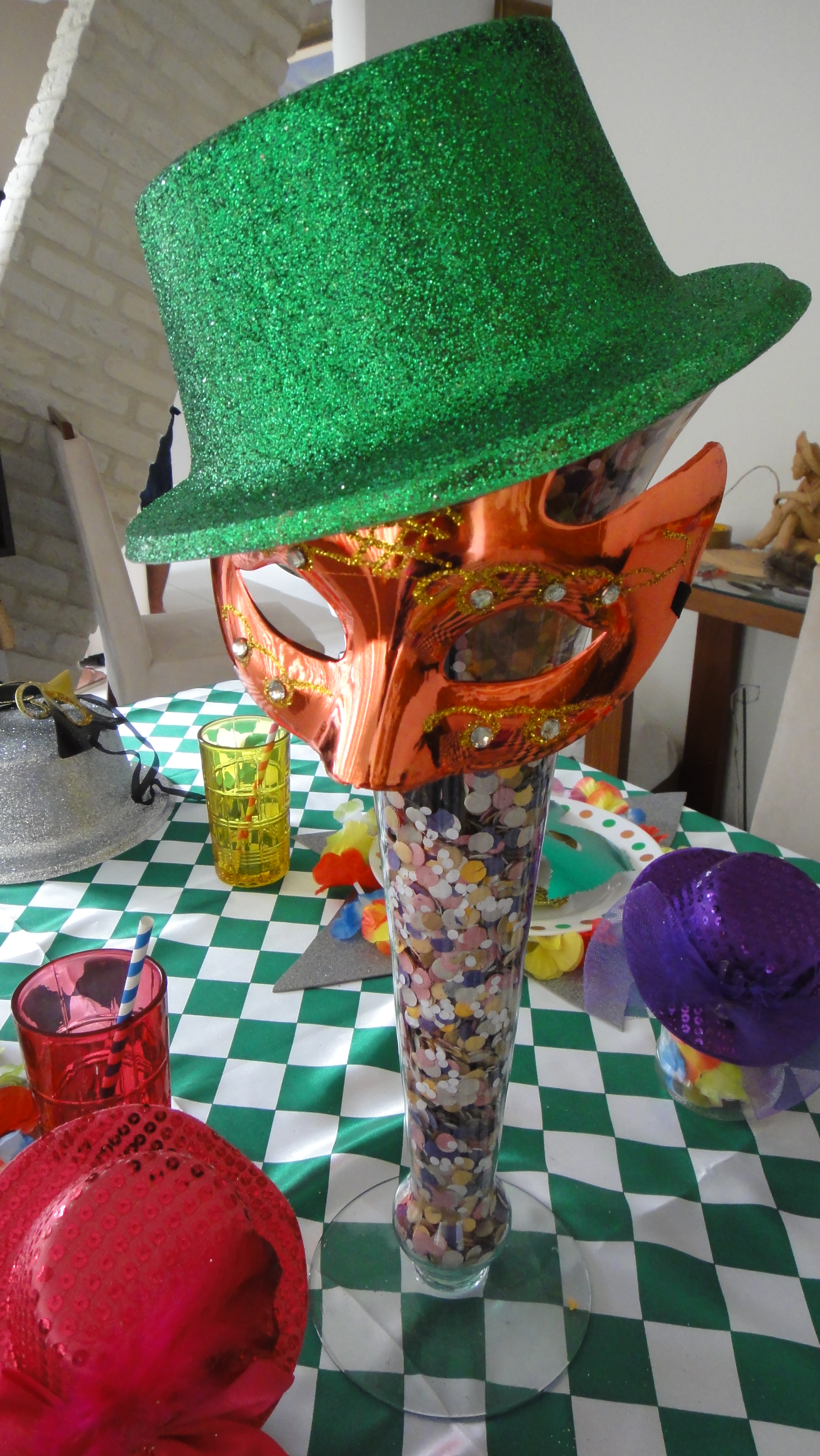 No centro usei um jarro como decoração principal. Enchi de confetes e coloquei máscaras dos dois lados. Para finalizar, o chapéu com jeito de malandro.
