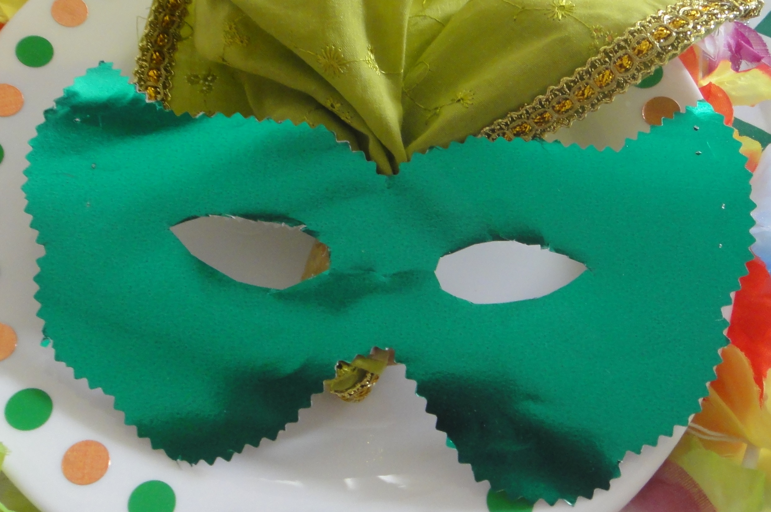 Para prender os guardanapos (lembram? São os mesmos do Natal) usei uma máscara feita de cartolina laminada. Peguei um molde na internet.