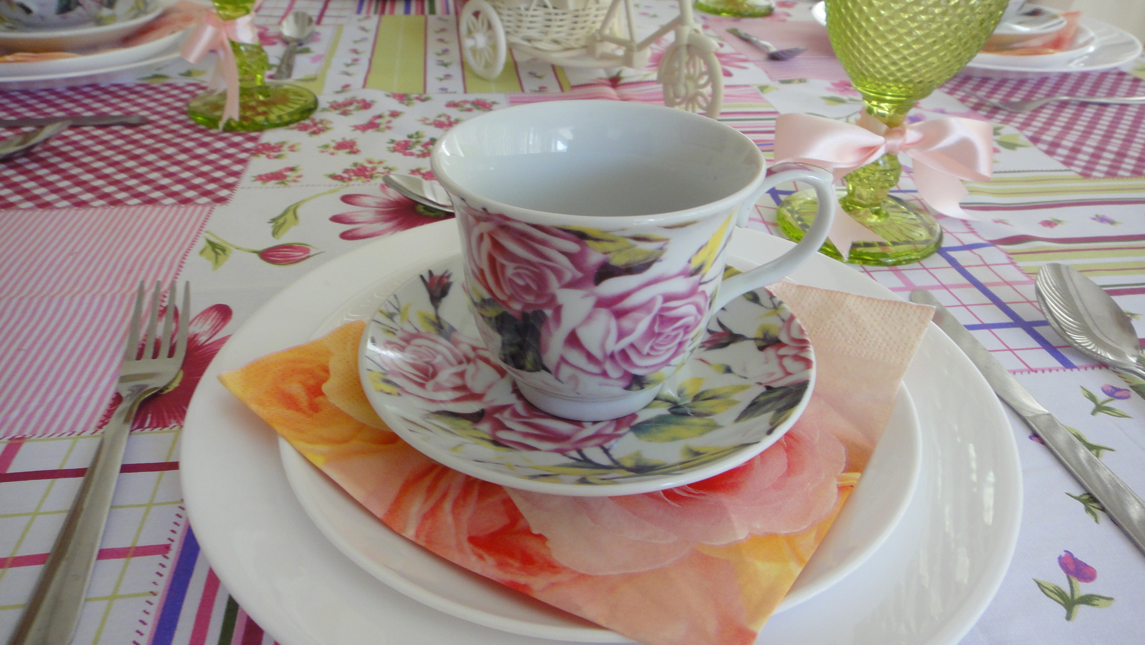 As xícaras com desenho de flores foram postas sobre pratos brancos para terem o destaque merecido. Os guardanapos eram de papel estampados com rosas.