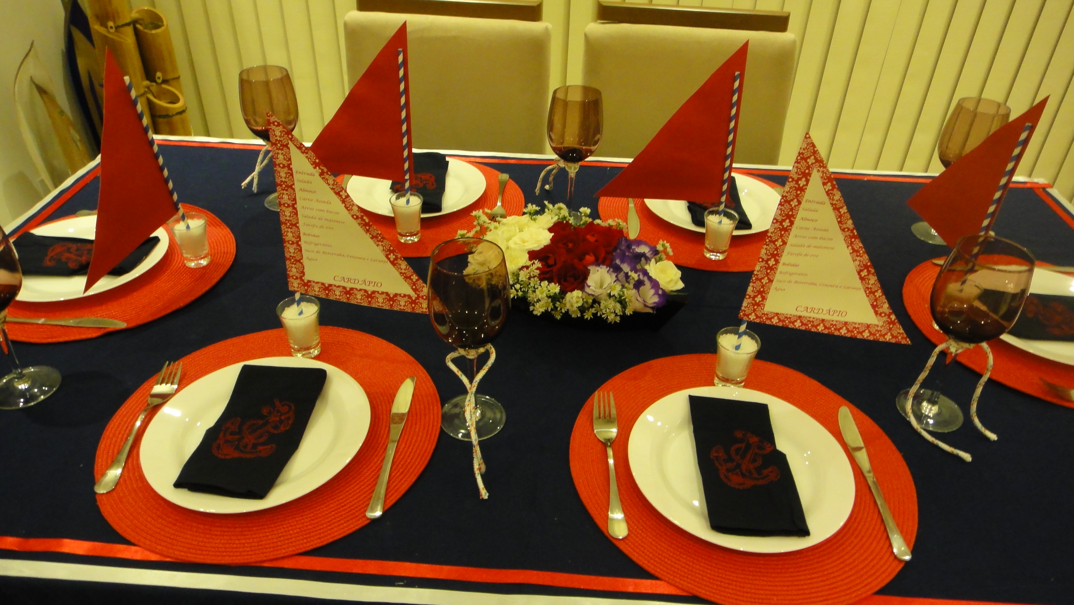 O segundo detalhe importante é o cardápio. Escolhi um scrapbook vermelho com desenhos em creme. Recortei no formato de vela de barco. Com um mesmo modelo, porém em tamanho menor, fiz lista de pratos em papel canson creme. Colei um canudo de papel colorido, sendo este o mastro.