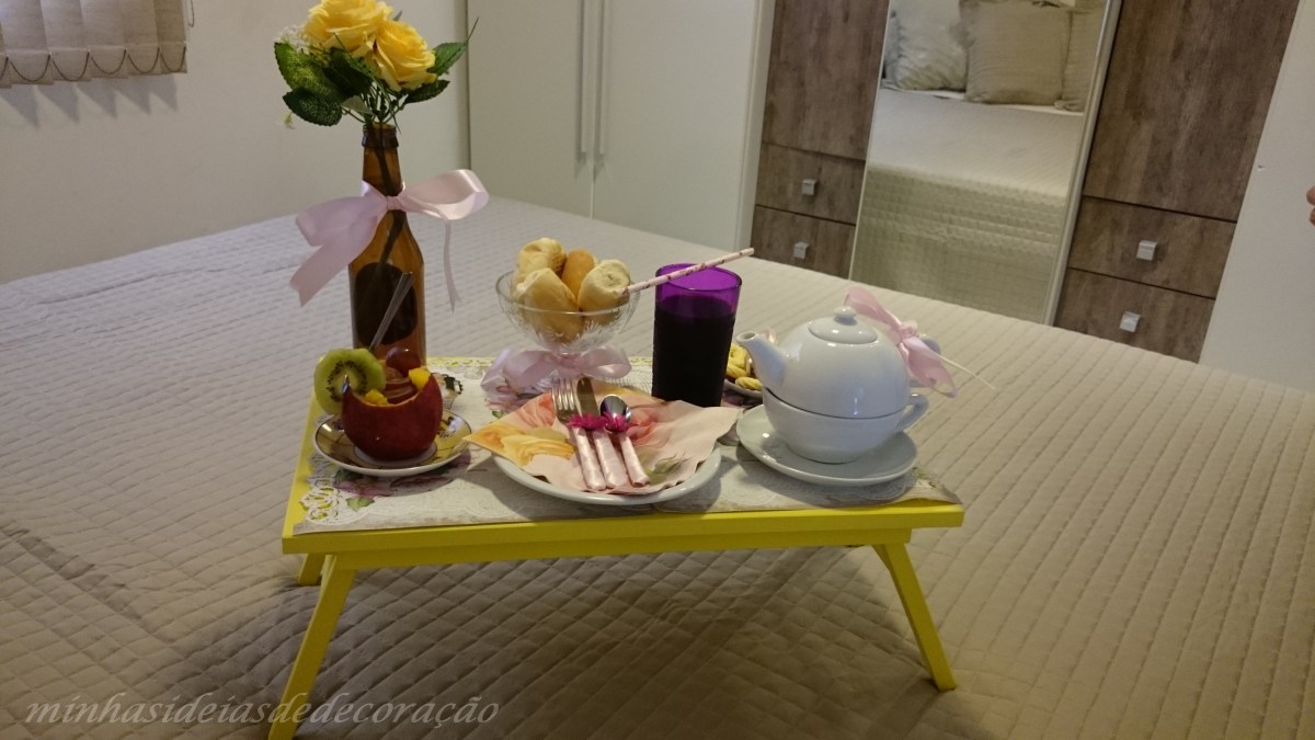 Escolhi brincar com as fitas, com o rosa e com a emoção. A combinação principal foi o rosa com o amarelo. Investi nos detalhes, por exemplo, poderia deixar a bandeja sem toalha ou colocar uma toalha de bandeja, mas preferi montar uma toalha com scrapbook e fotos.