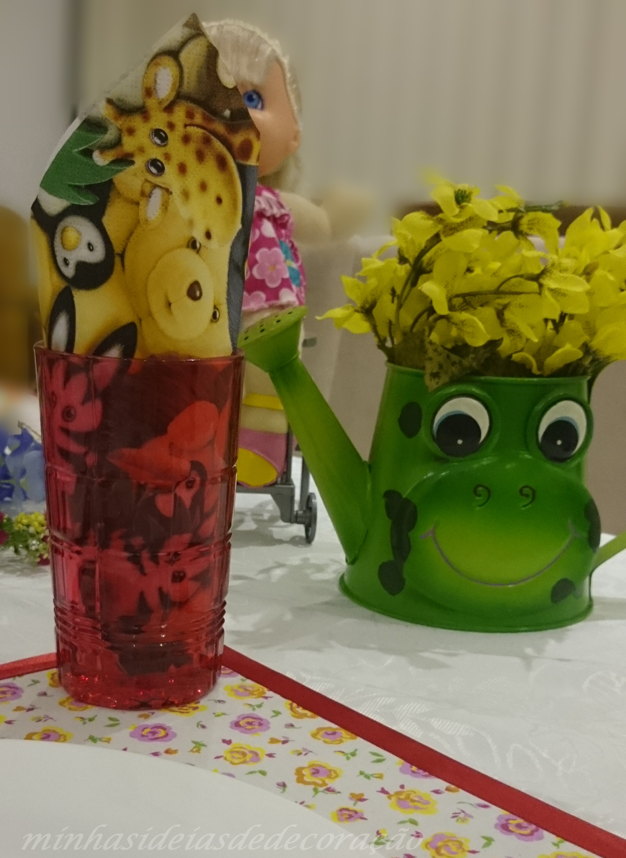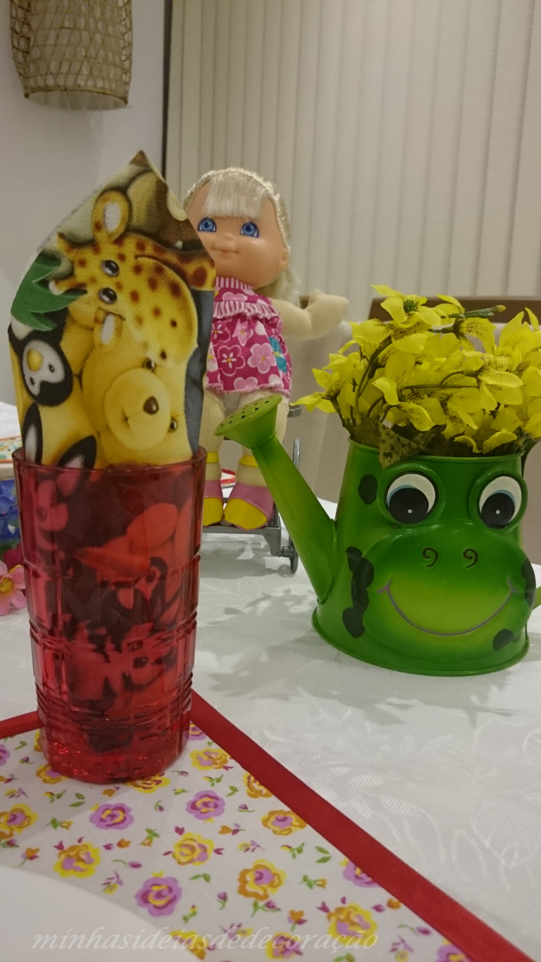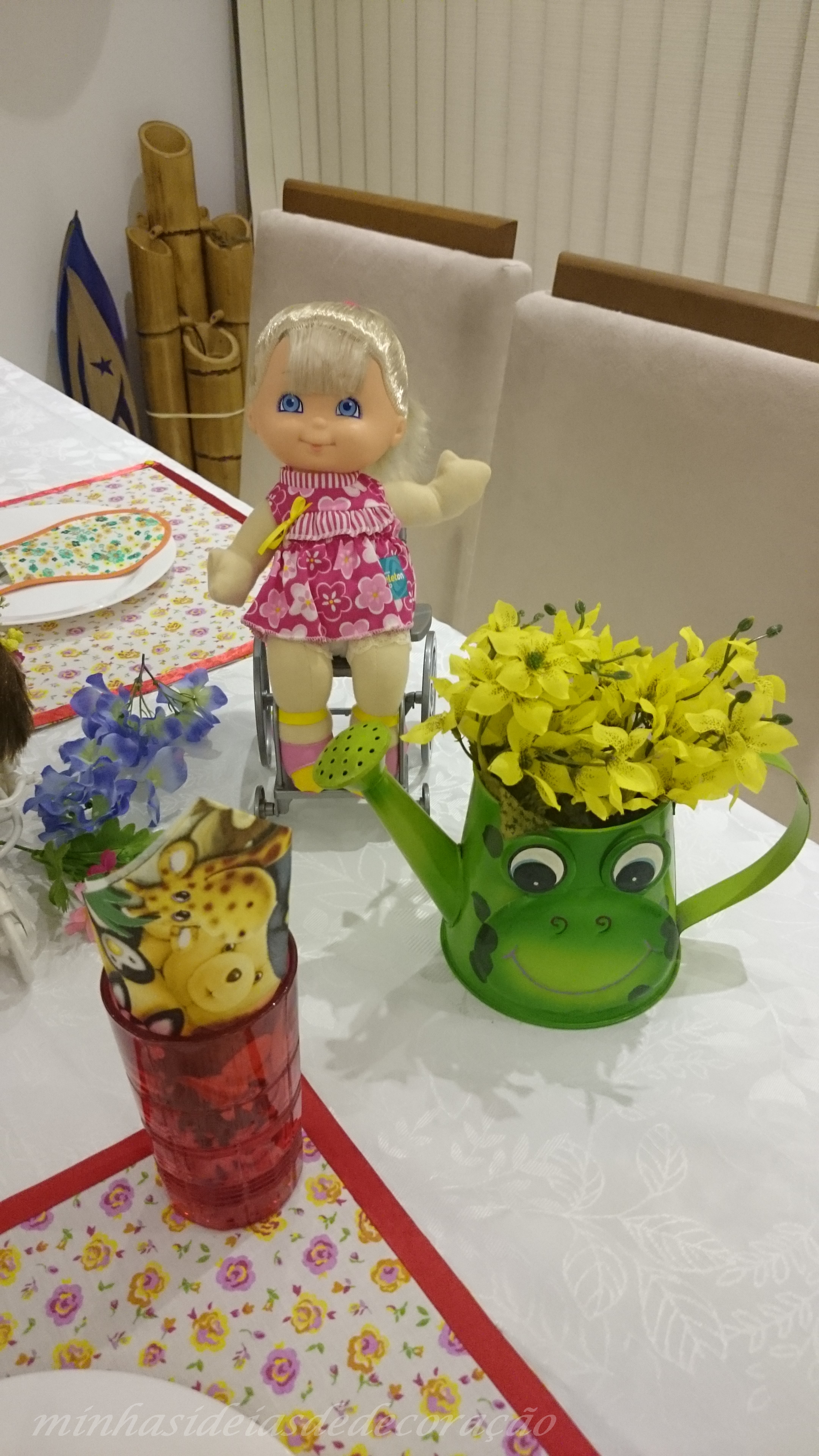 Espalhei pela mesa minhas bonequinhas favoritas, pois as ganhei do Teleton. Também coloquei regadores com cara de bichinhos.