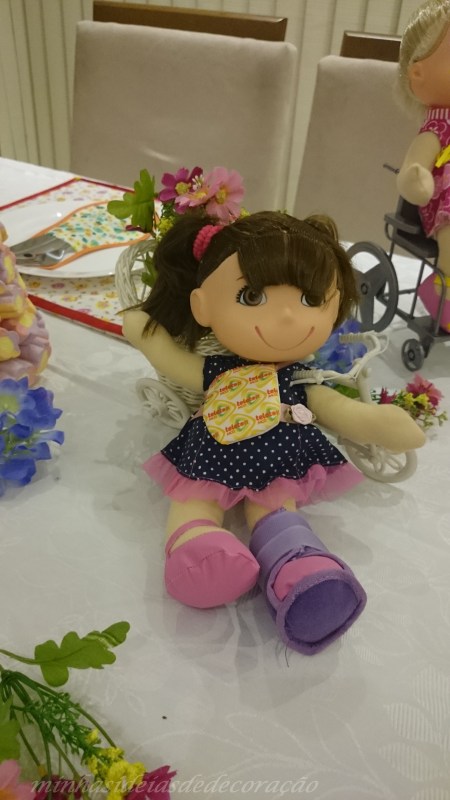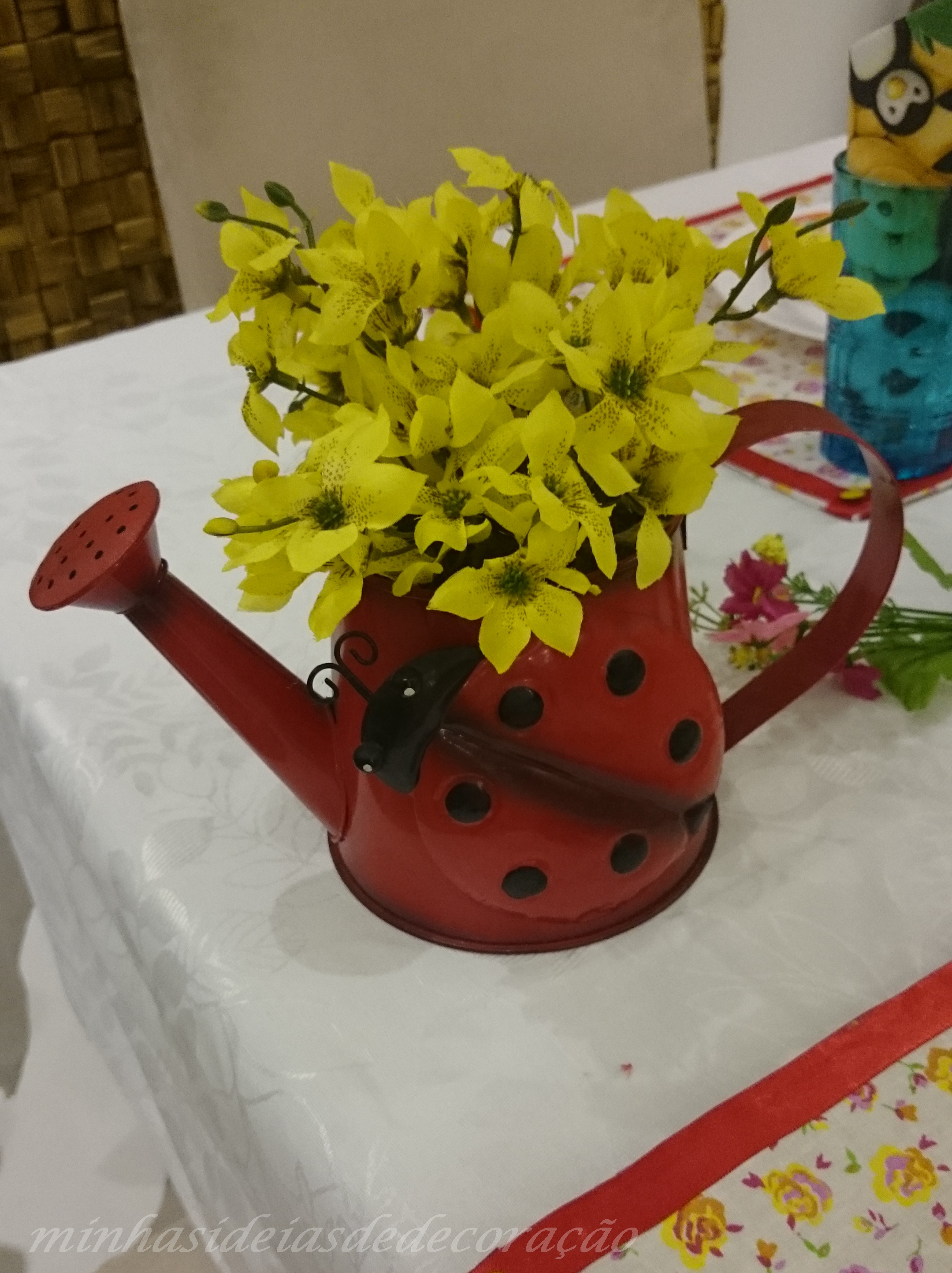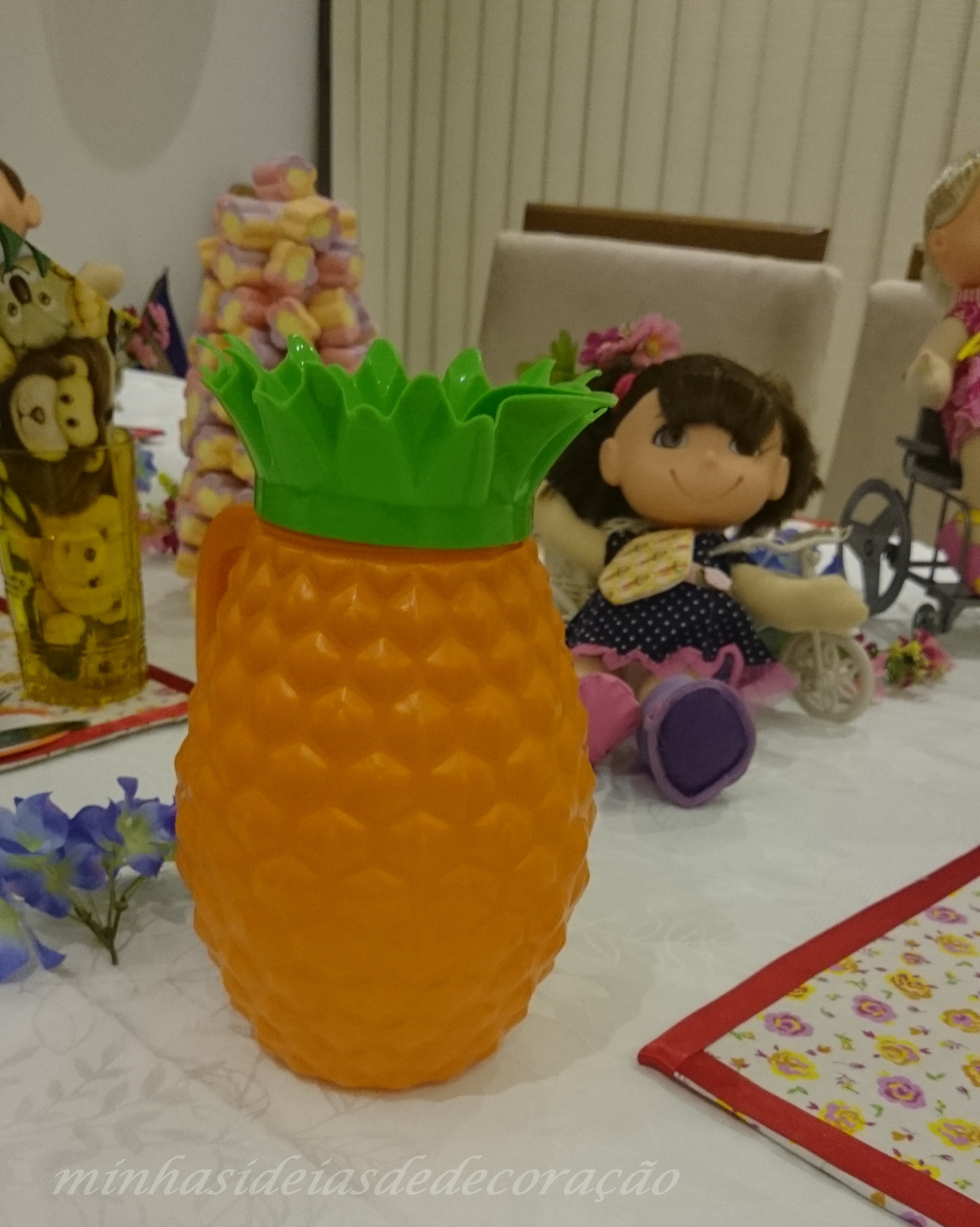 Espalhei pela mesa minhas bonequinhas favoritas, pois as ganhei do Teleton. Também coloquei regadores com cara de bichinhos.