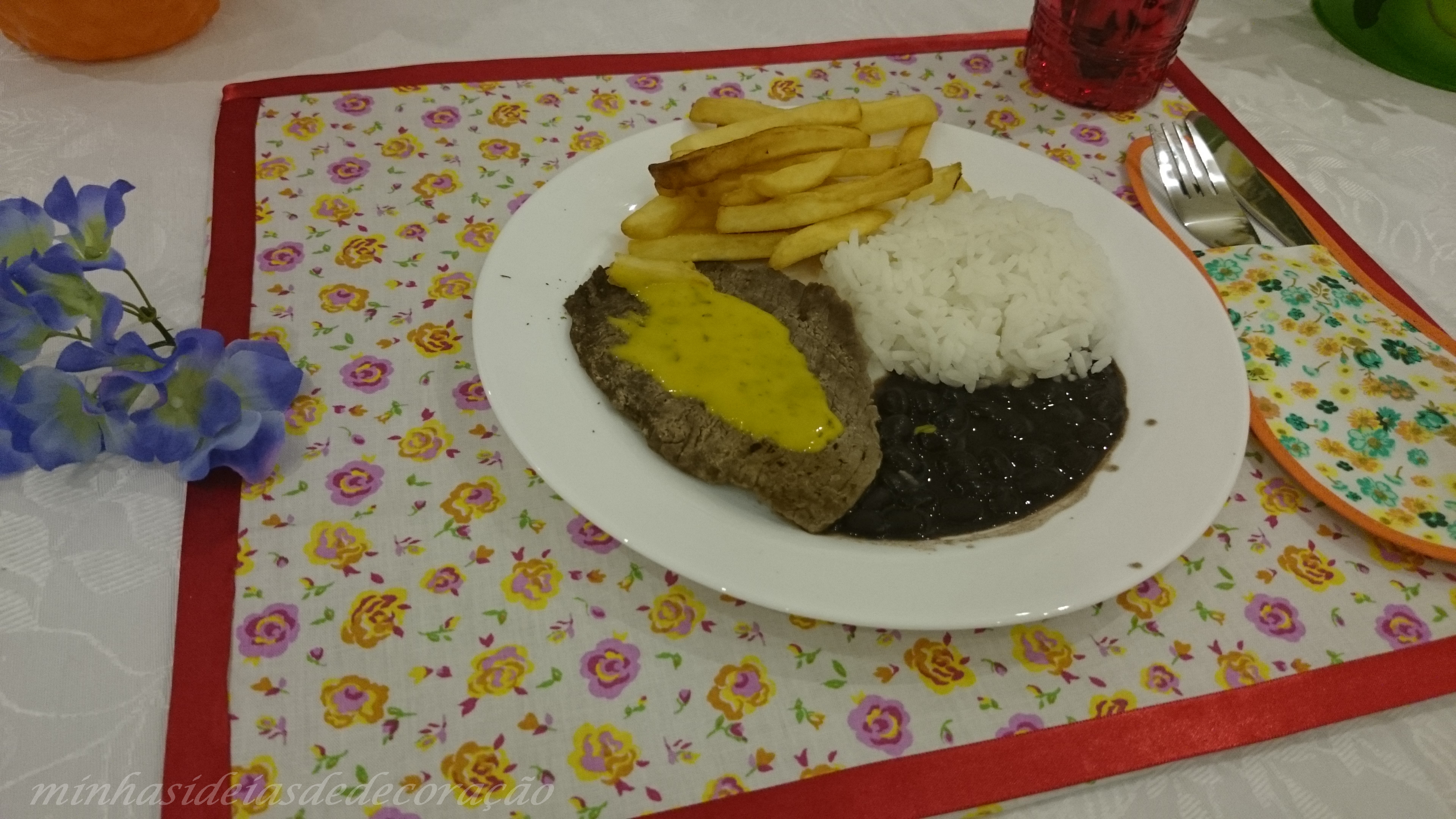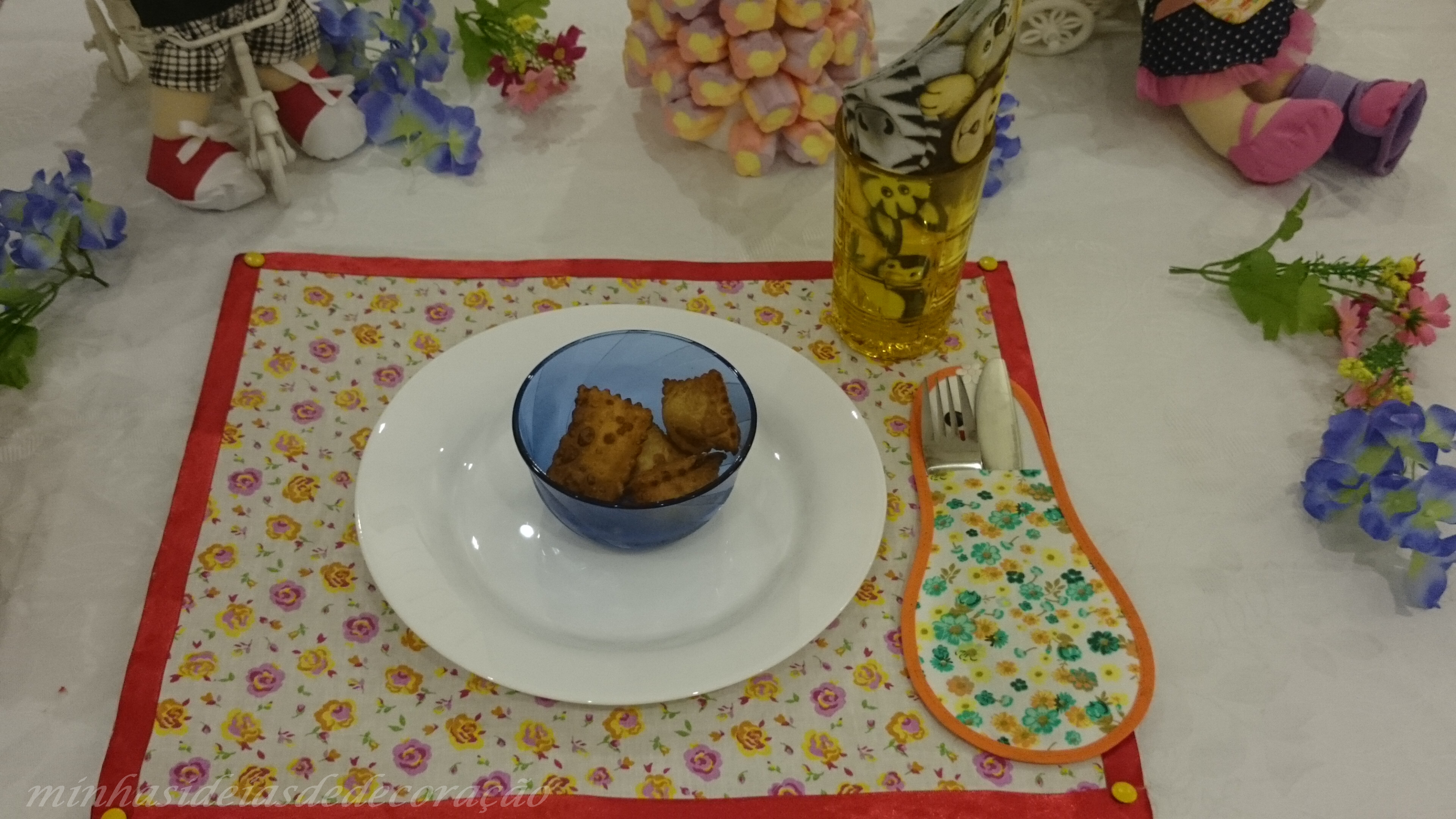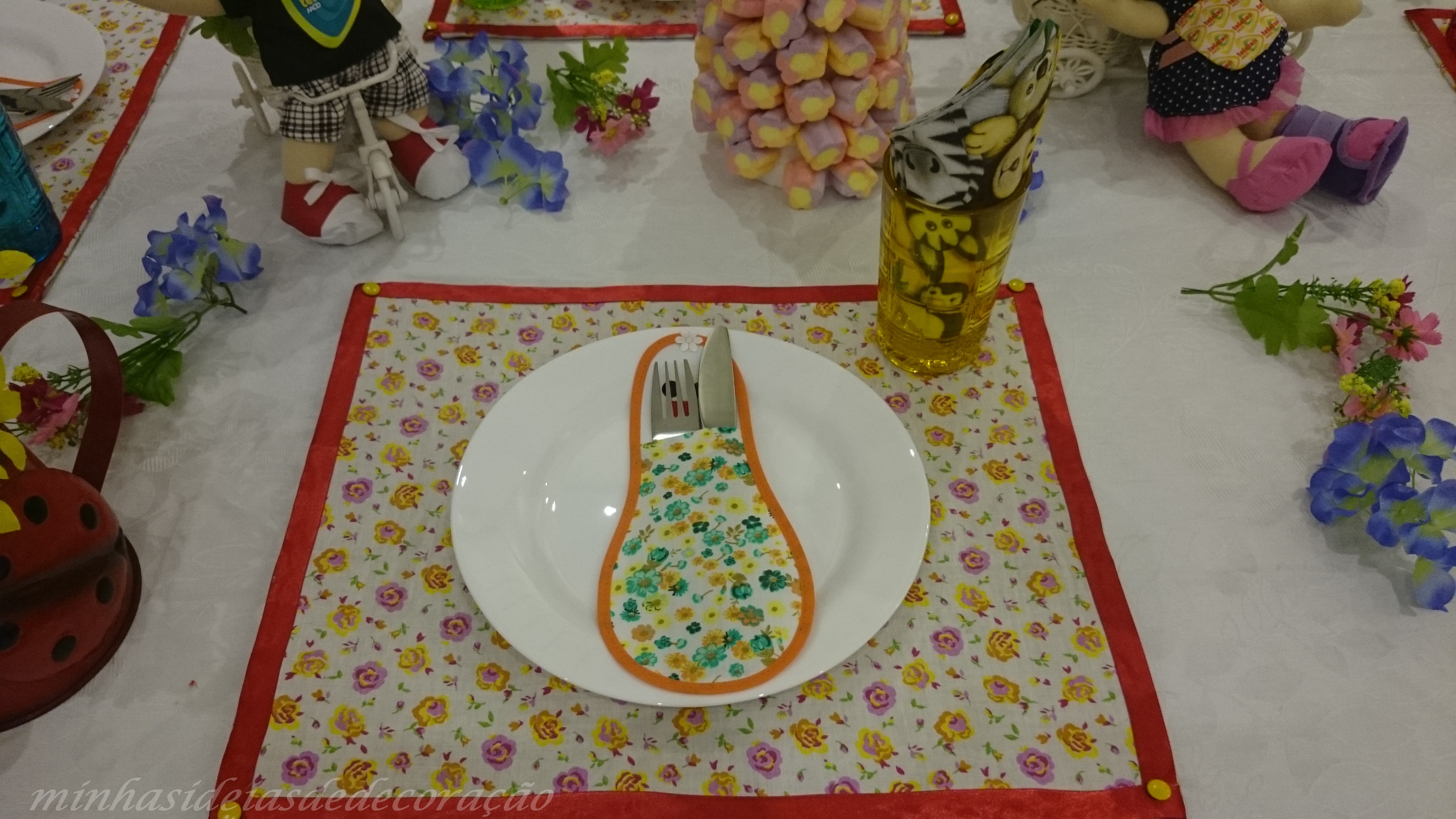 Como a toalha era branca e como criança tem que se sujar e sujar tudo mesmo, achei interessante colocar um jogo americano feito de papelão e tecido que ensinei a fazer aqui. Para os talheres escolhi um porta talher de galinha.