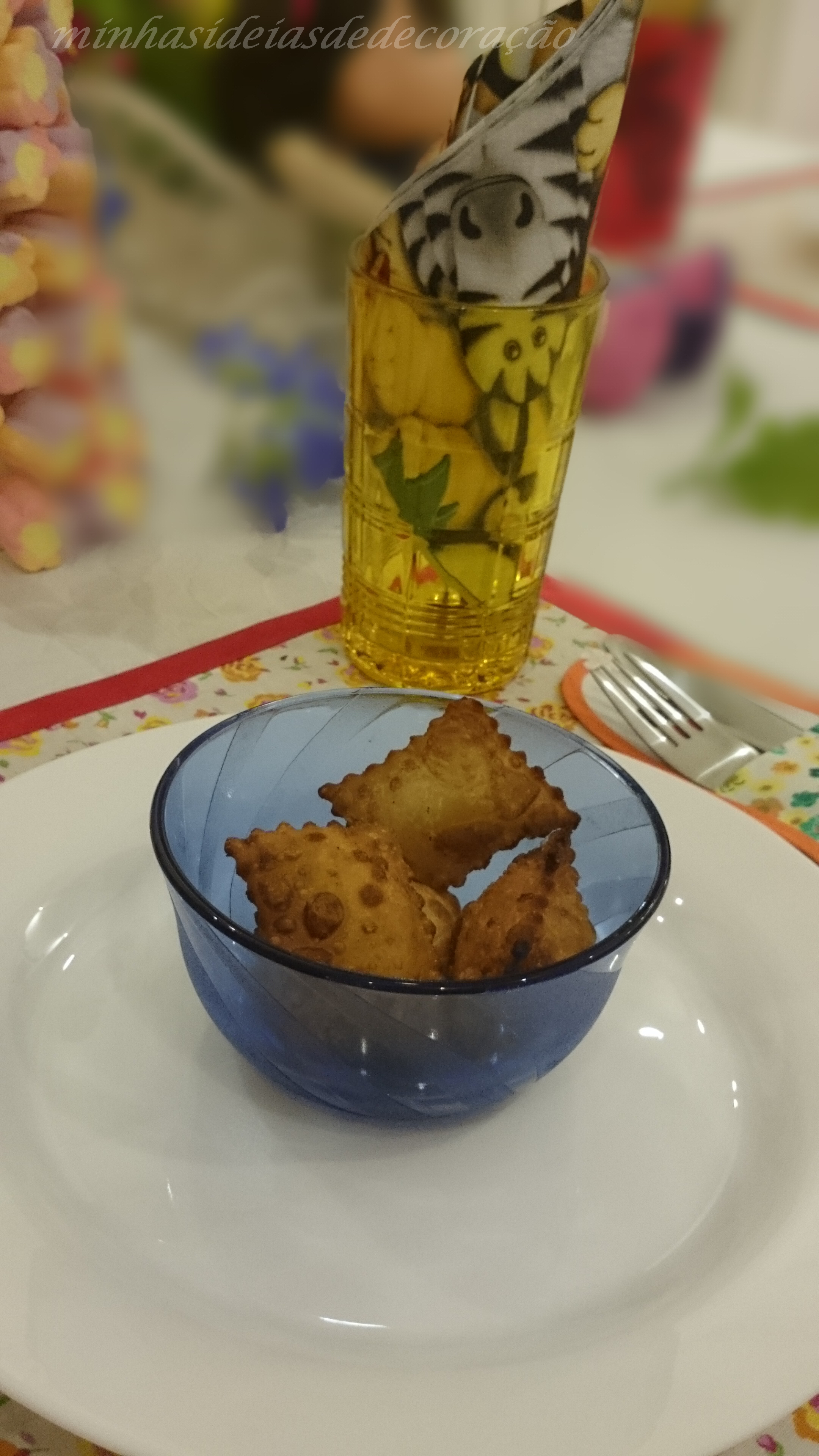Já a comida eu sei que não é muito saudável, mas nada mais me lembra infância que arroz, feijão, bife e batata frita. A entrada foi pastel de queijo num potinho de sobremesa.