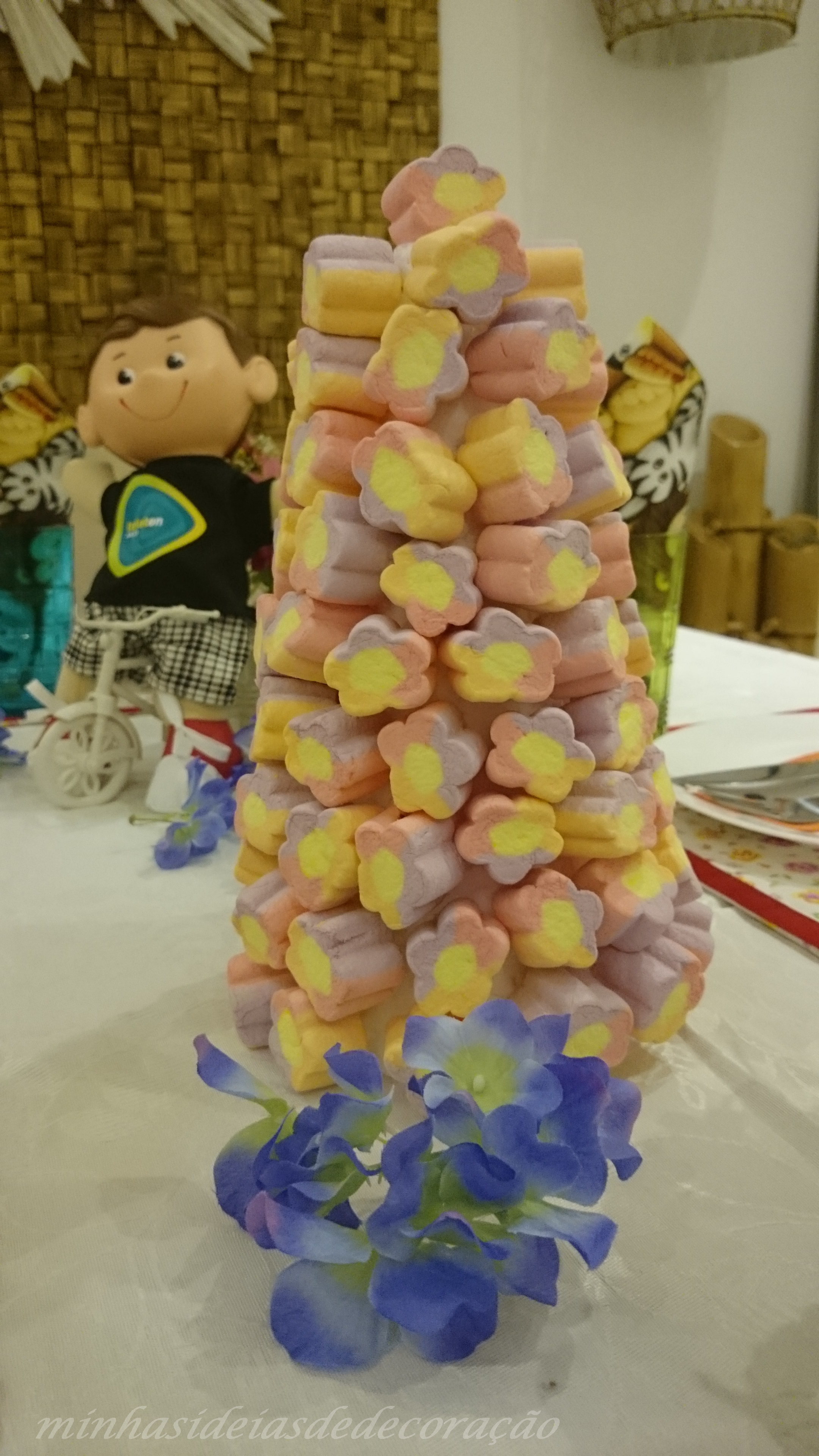 Num almoço de criança, o arranjo central não poderia ser flores nem velas, optei por uma árvore de masrshmallow coloridos.