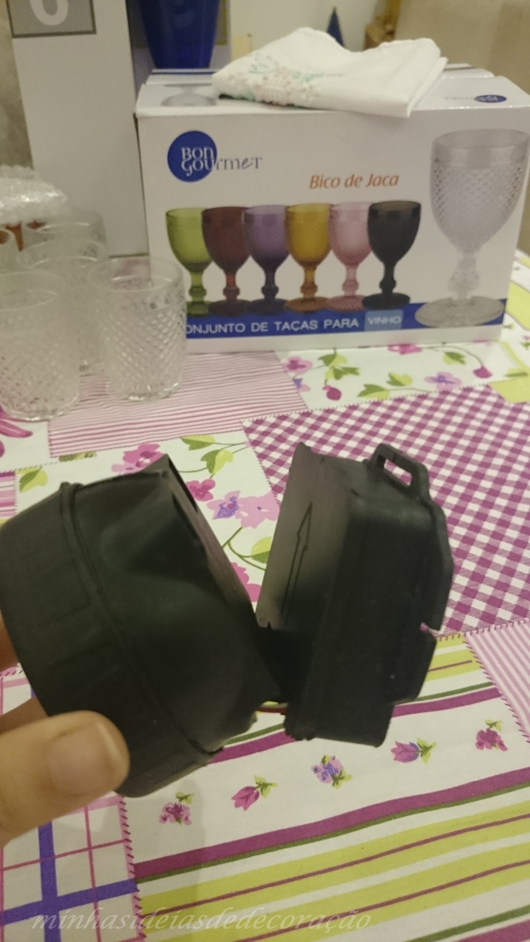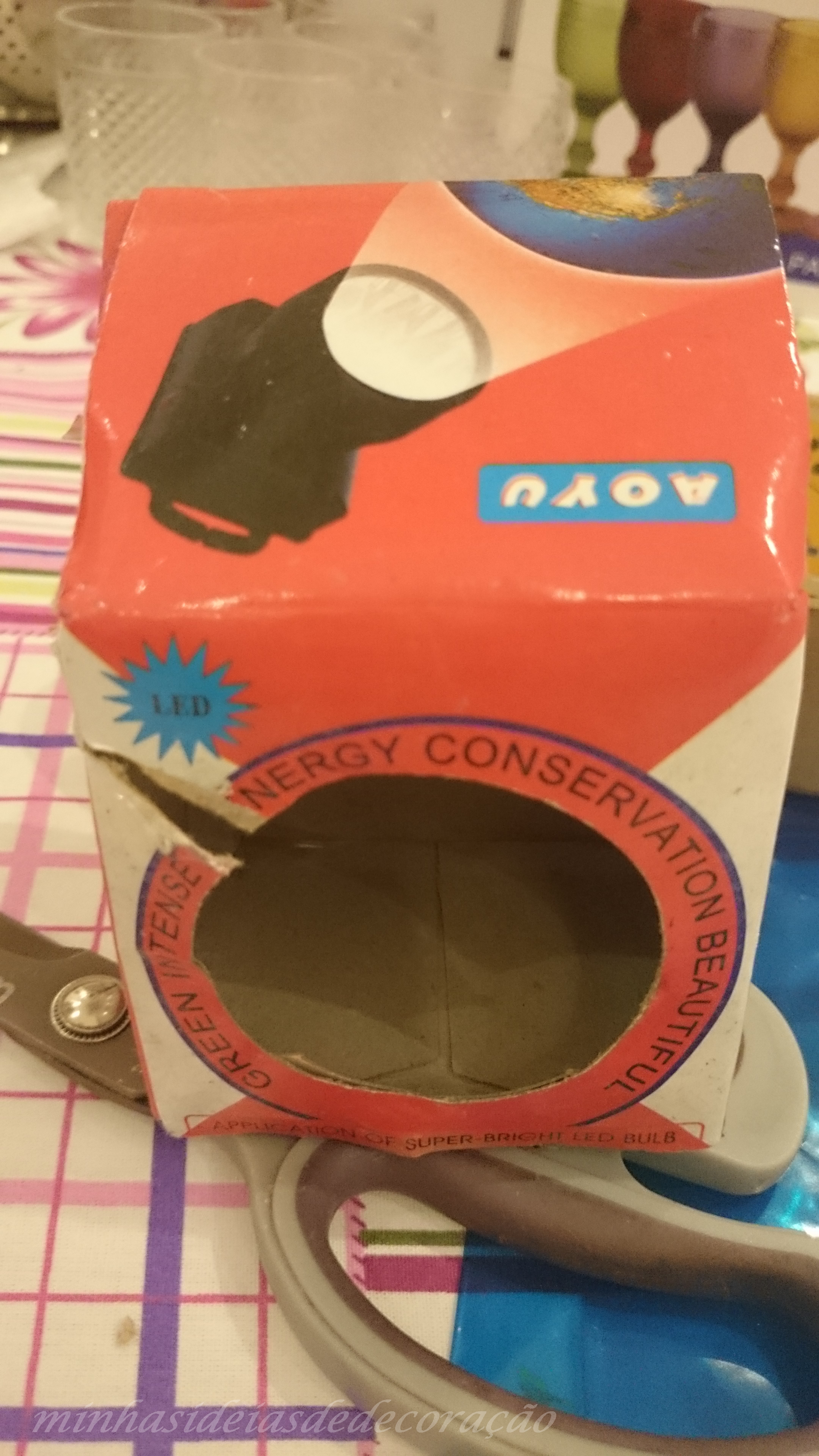A luz dela pode não ter um raio muito grande, mas é forte o bastante para iluminar pontos específicos da mesa e também de paredes. Para criar o efeito colorido uso papel celofane.
