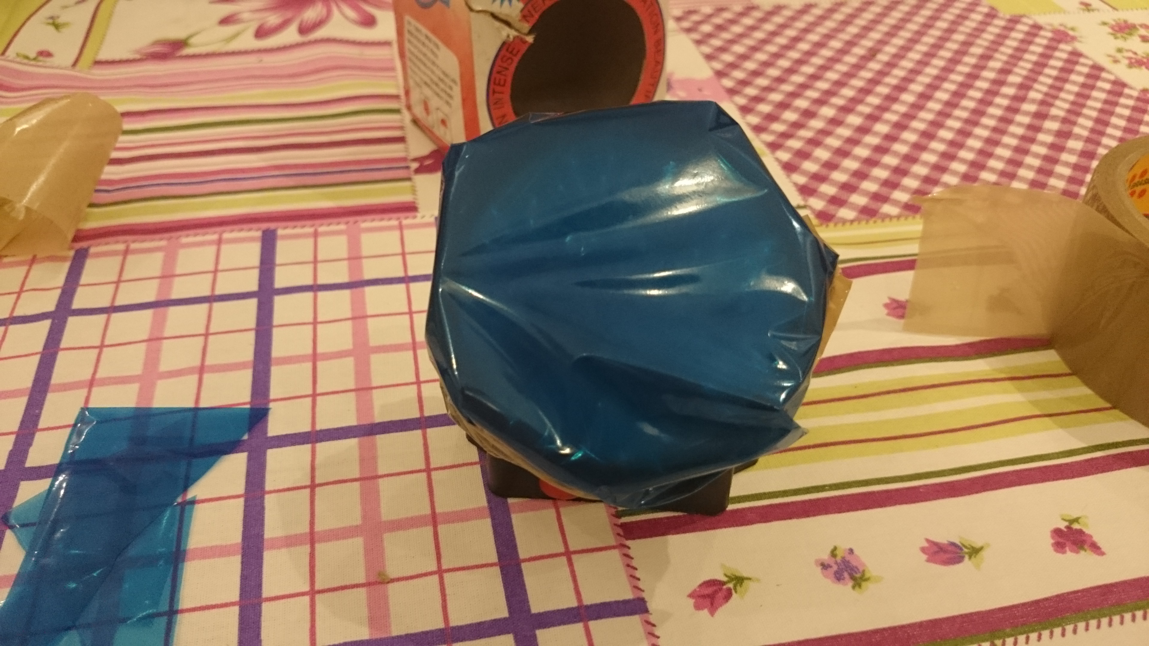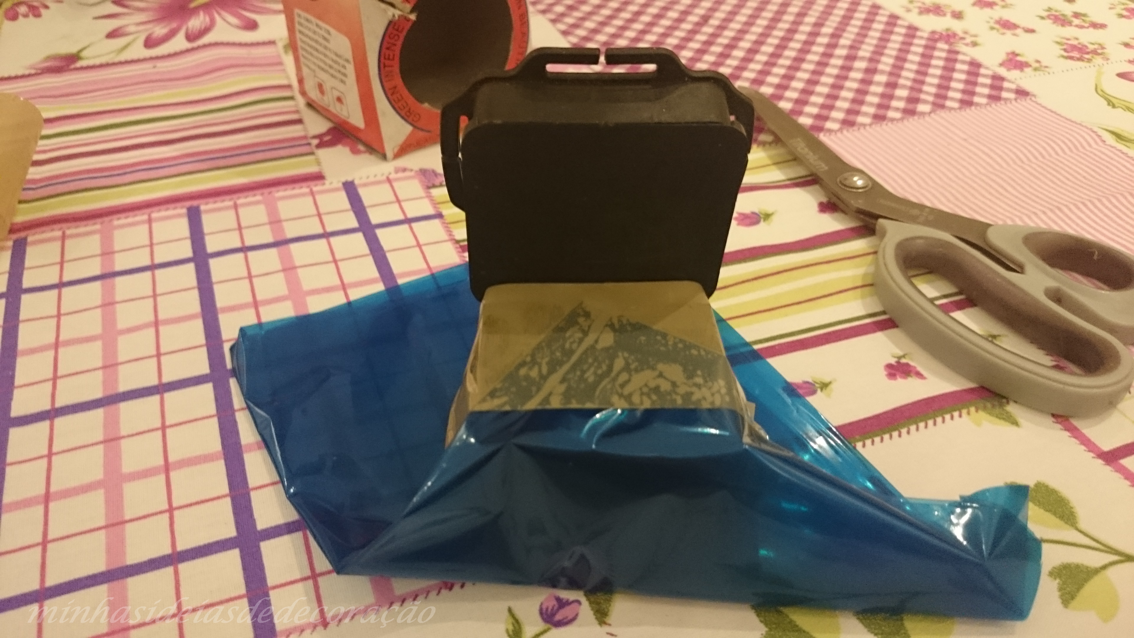 O passo a passo é simples, basta embrulhar a lanterna com o celofane. Veja abaixo. Aqui eu usei uma fita marrom porque estava sem a fita incolor em casa, mas use a incolor.