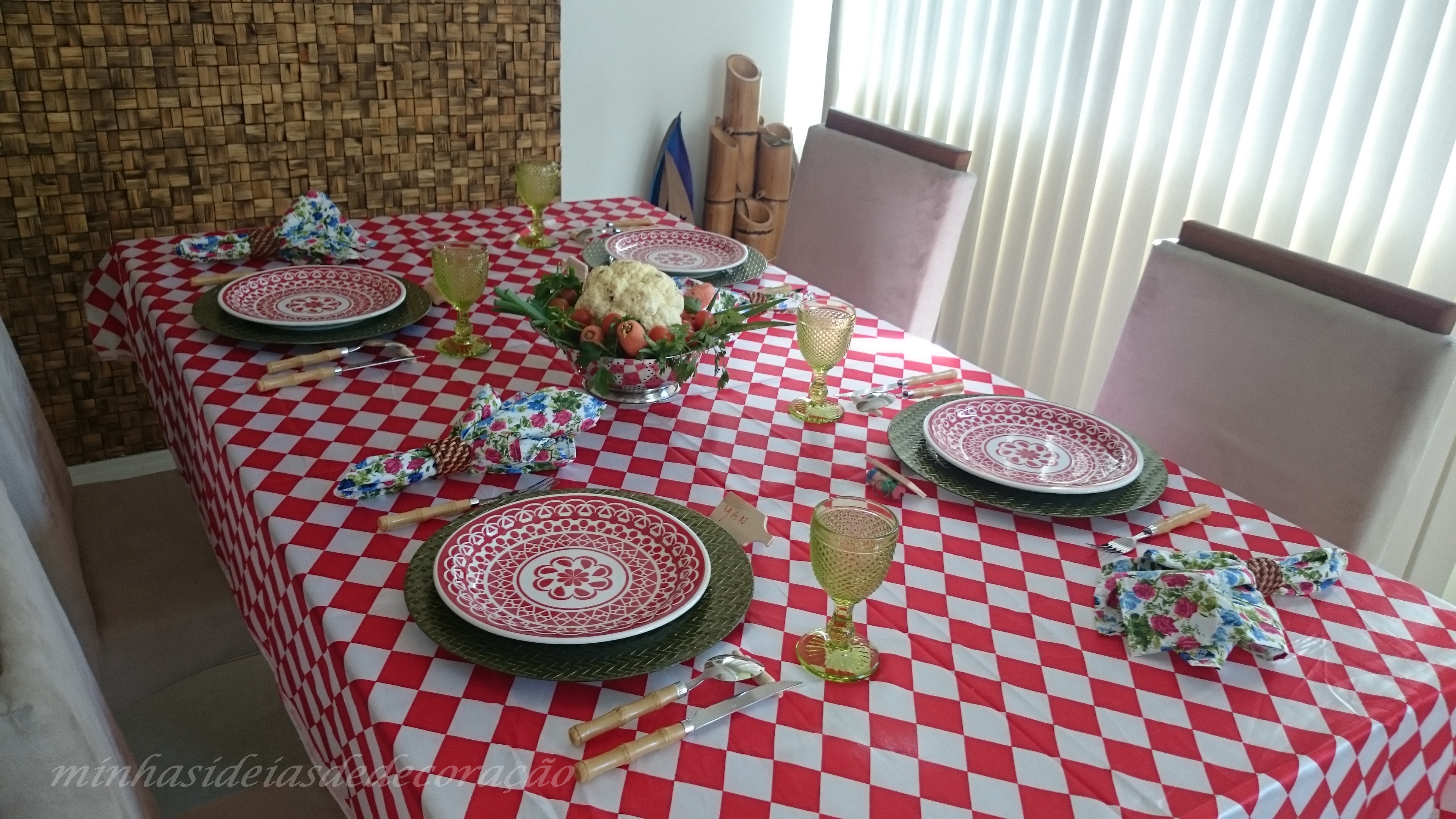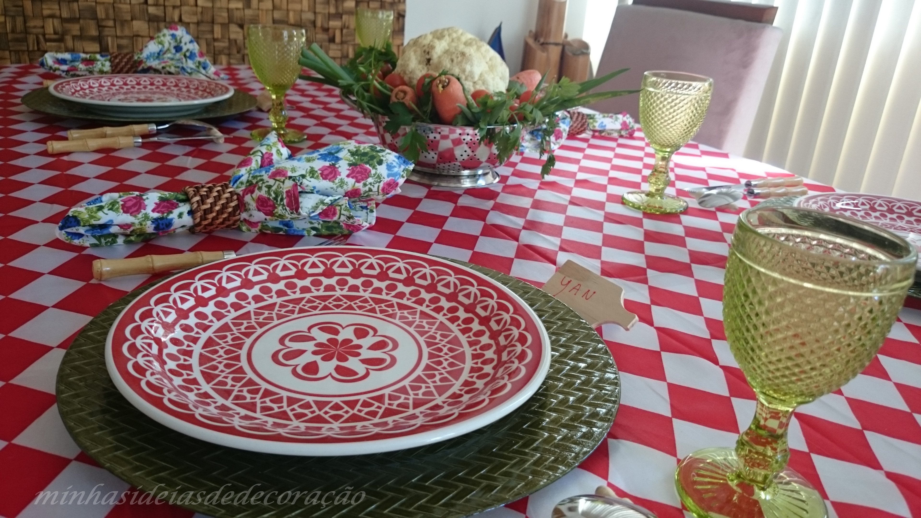 As cores principais eram vermelho e verde e muito xadrez. Sousplats verdes e pratos com mandalas vermelhas.