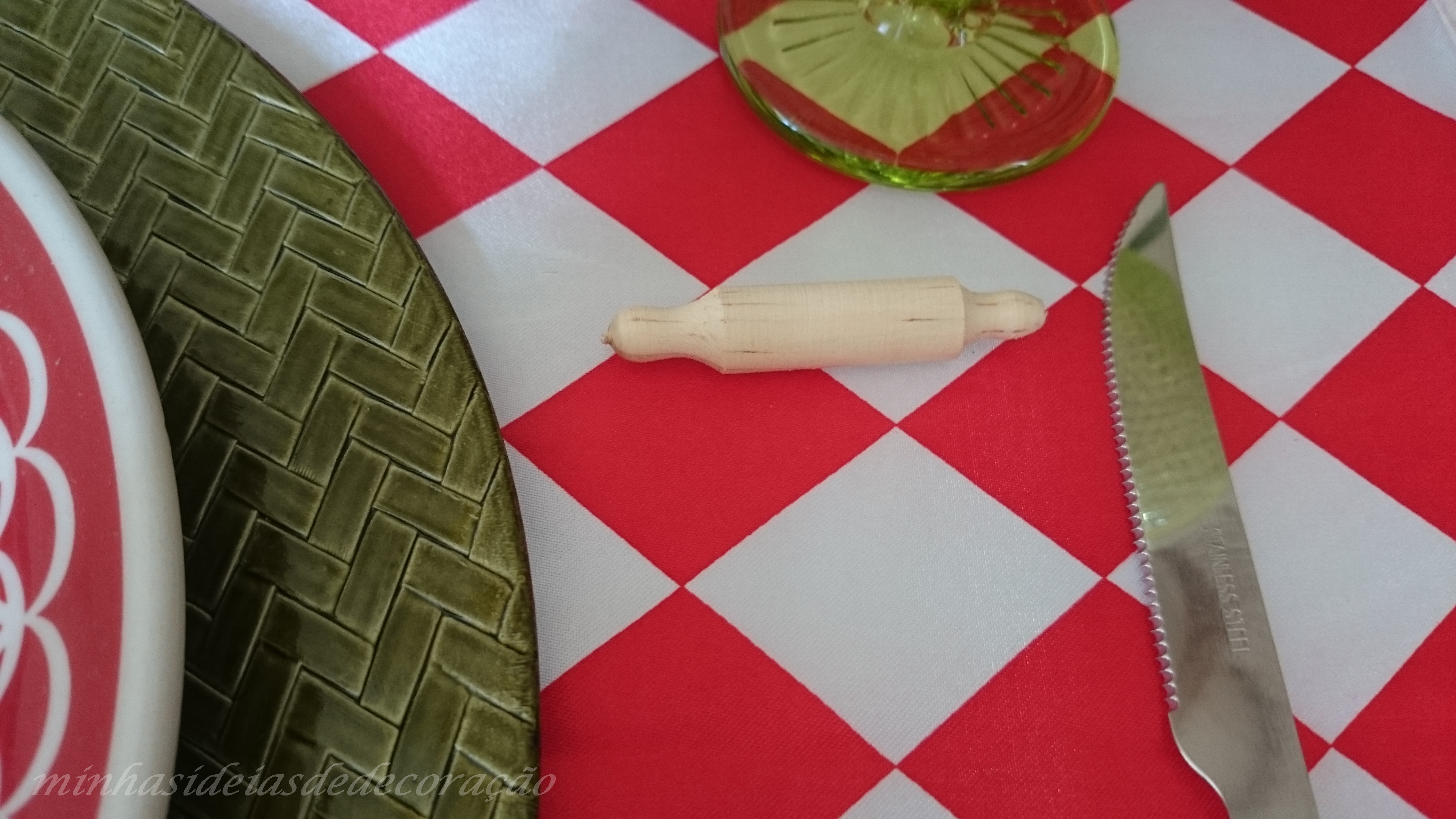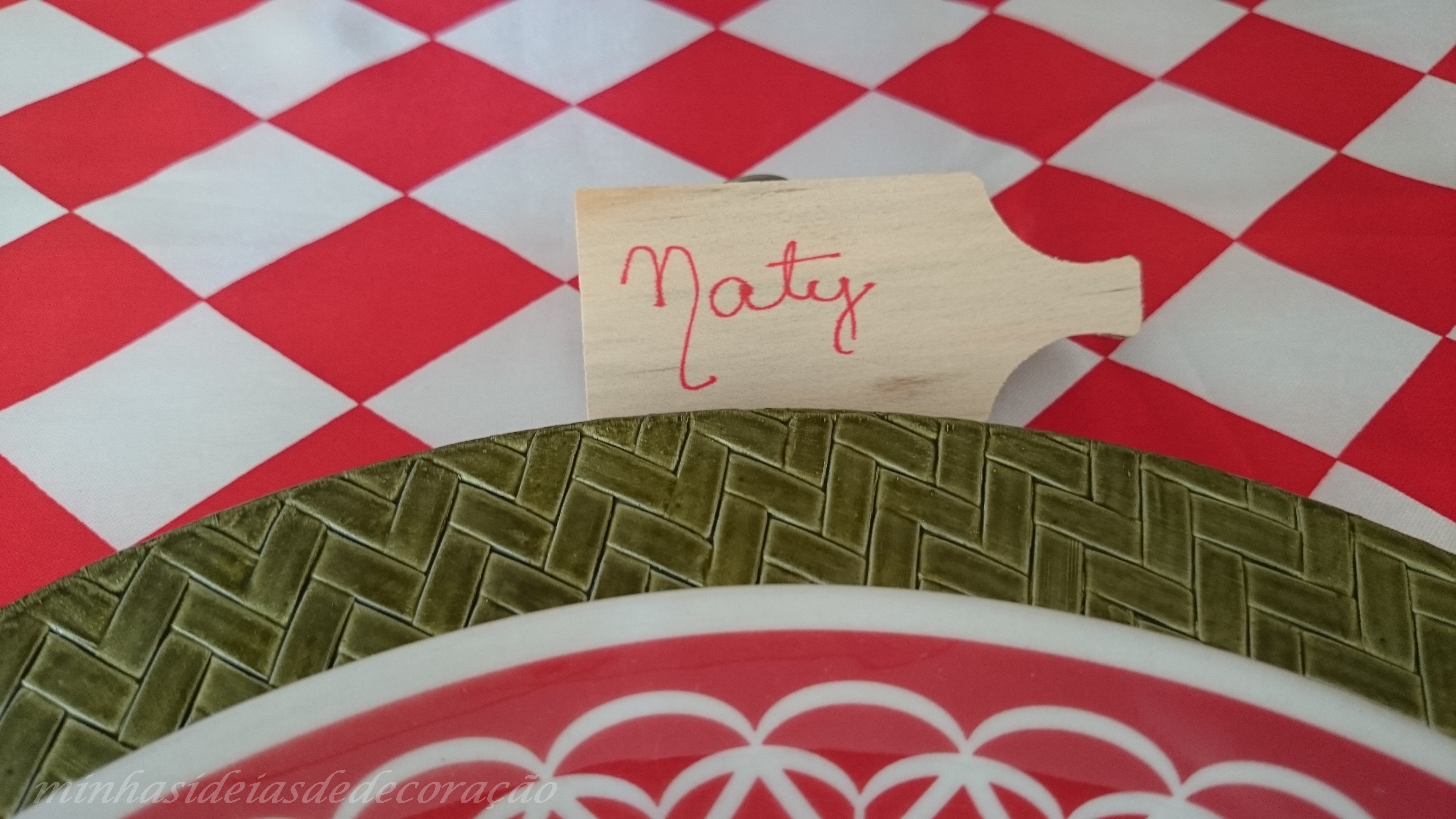 São rolinho de macarrão de mdf. Também usei essas tábuas de carne em mdf como marcador de lugar. Cada um custou R$ 1,00.