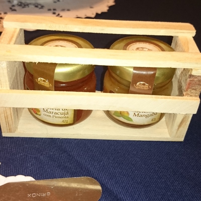 Tínhamos biscoitos, torradas, frutas e panetone (o natal vem vindo) e um sanduíche com o resto do rosbife e da salada Caprese. Tudo está servido em potinho bem simples de vidro, mas cobertos pelo papel de renda. Também coloquei meus potinho de geléia mimosos que trouxe de João Pessoa.