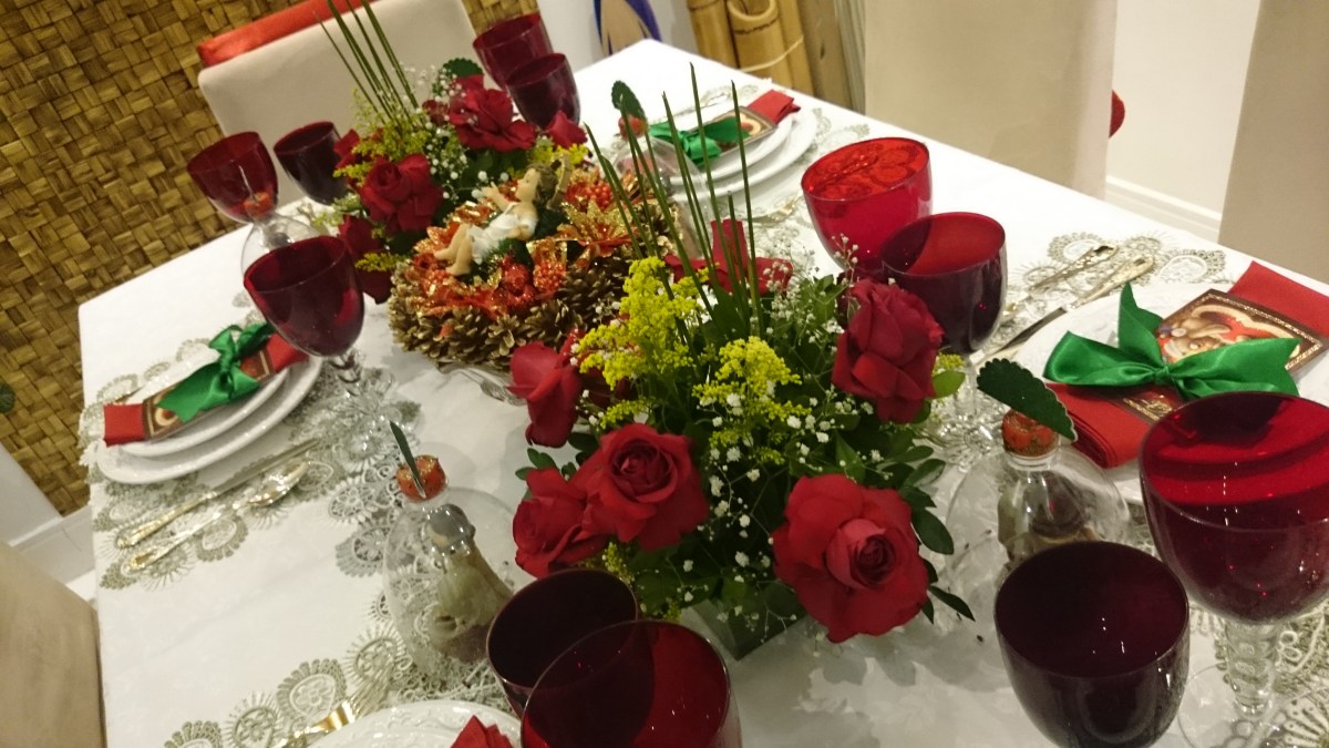 Quero dar um destaque aos arranjos. Os dois de rosas vermelhas comprei prontos, estavam bonitos, mas pelo preço esperava que fossem mais resistentes. O do centro eu mesma fiz. Usei bolas de Natal, uma guirlanda e um menino Jesus. Gosto de trazer o menino Jesus para a mesa, para que todos possam se lembrar do porquê de estar ali.