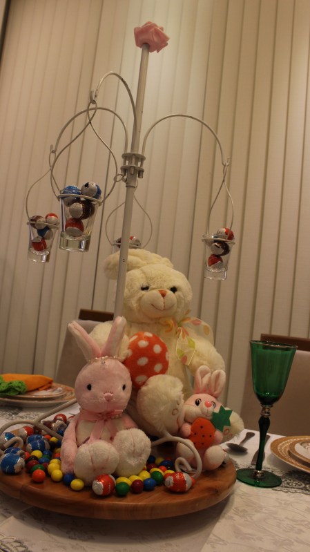 Logo de primeira, quero mostrar o centro da minha mesa. Aqui estão eles de novo: a família coelho, lembram? Eles já estiveram aqui ano passado.