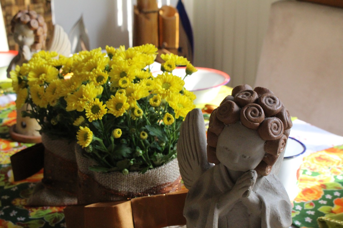 No centro da mesa usei mini margaridas e uns anjos de barro.