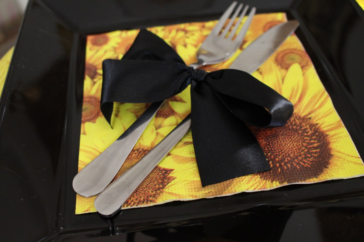 Usei peças bem simples como um lugar americano amarelo e pratos pretos. Se bem que com esses pratos nada fica muito simples, acho eles o ponto alto da combinação elegância com modernidade. Para ficar um pouco diferente coloquei os pratos de forma a fazer um losango e não um quadrado e para destacar guardanapos de girassol.