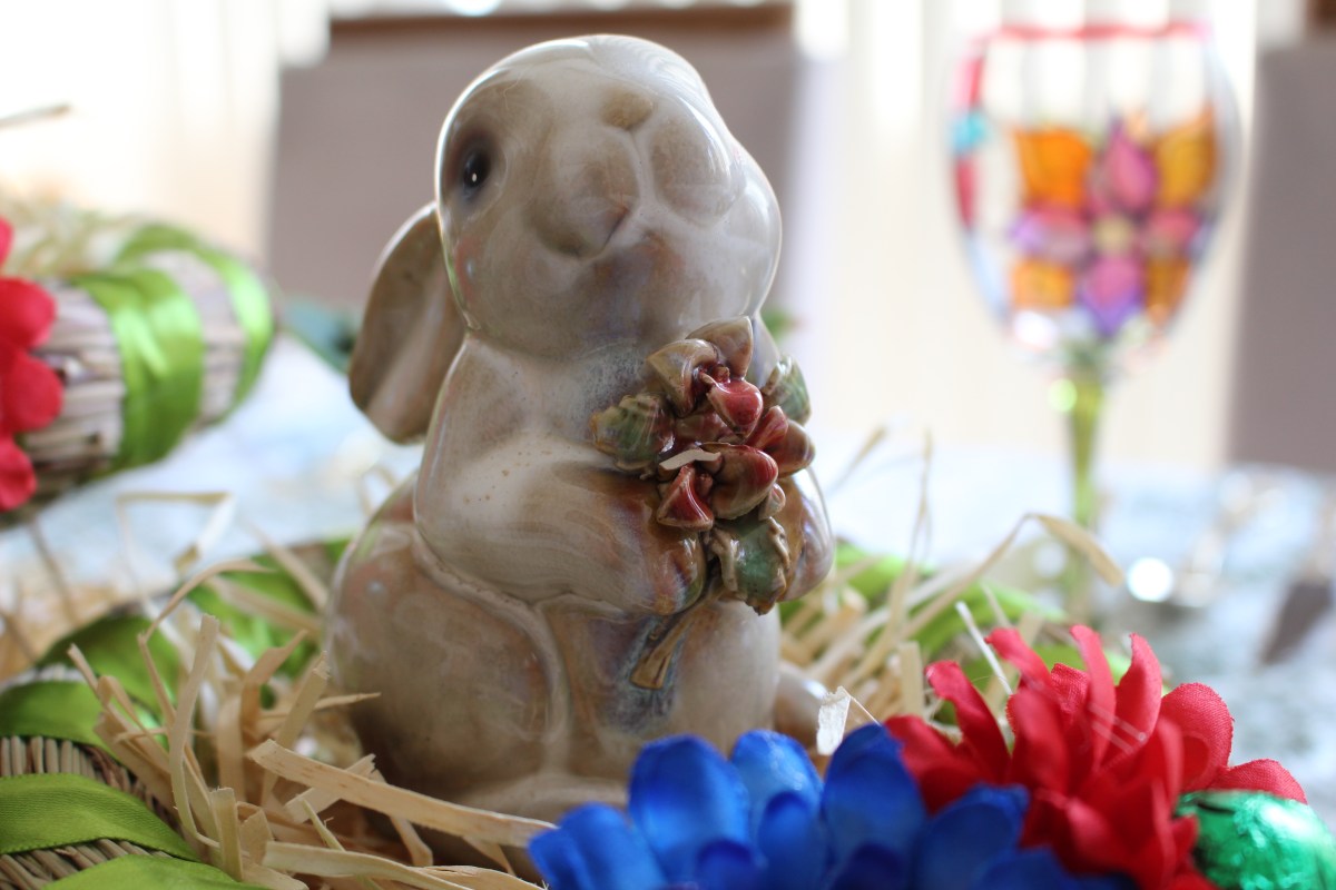 Esse ano não usei a Família Coelho rsrsrsrs (já está cansada de tantas páscoas). A decoração foi com coelhinhos de louça muito fofos. Digamos que foi uma decoração mais “adulta”. A mesa ficou bem colorida. Vamos ver?