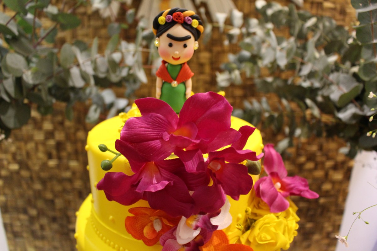 Já o bolo…Será que vocês lembram dele? É o bolo fake da festa de 50 anos que postei aqui. Pintei de amarelo, enfeitei com flores e coloquei uma mini Frida como detalhe especial no topo.