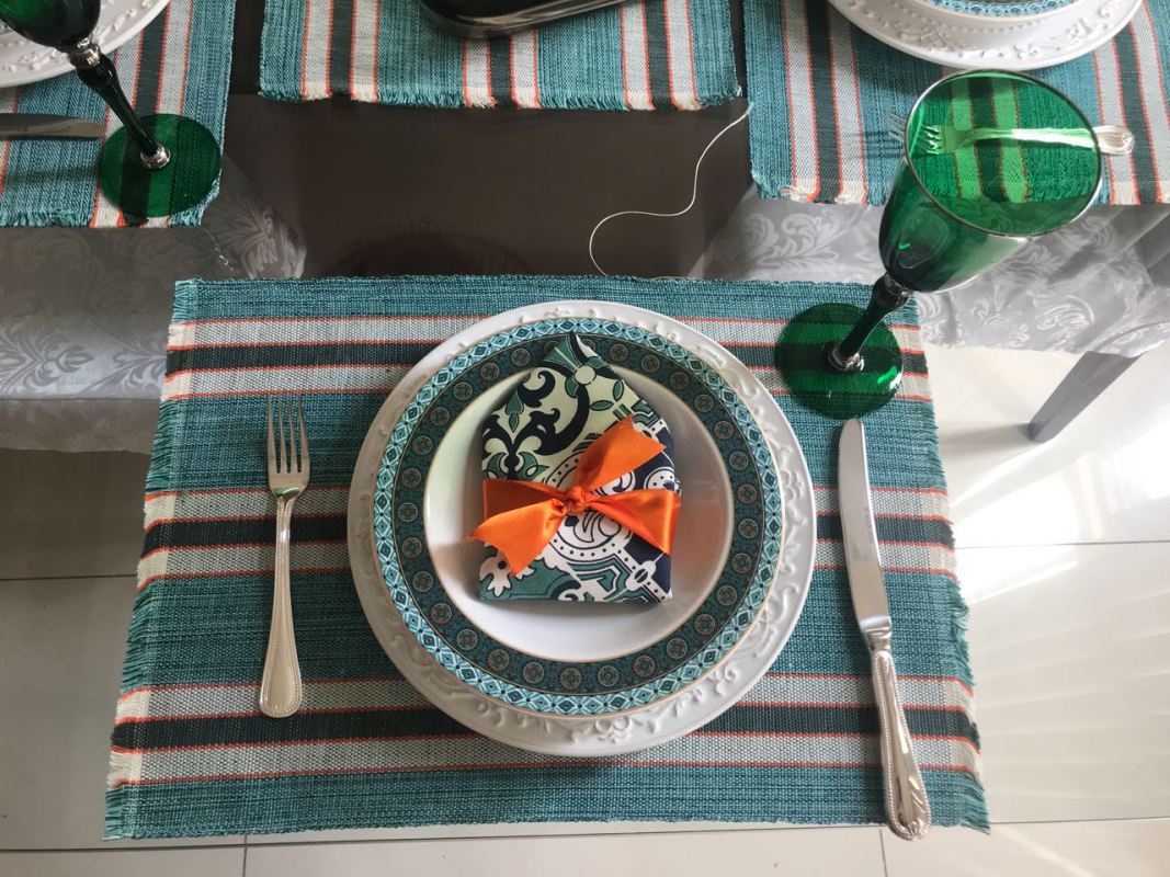 Para a decoração da mesa, segui a ideia que o jogo americano passa:vejam ele tem vários tons esverdeados e apenas uma pequenas listra laranja. Assim foi a mesa, vários itens em verde e apenas um laço laranja.