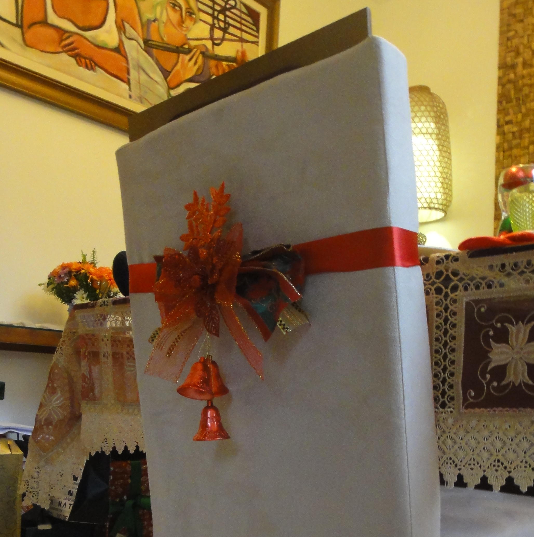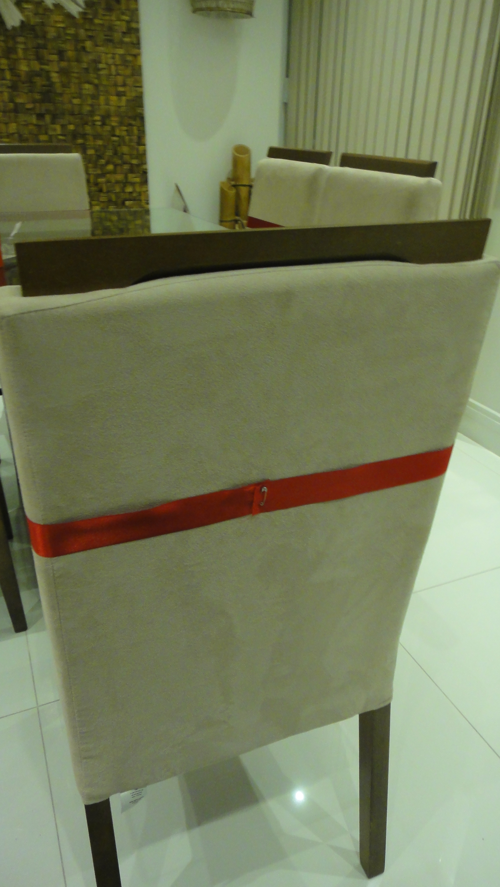 As cadeiras também foram decoradas. Vi no google uma ideia ótima e resolvi reproduzir. Primeiro prendi uma fita grossa de cetim vermelha com um alfinete. Depois fiz um laço de fita colorida e colei com cola quente uns sininhos que comprei no Saara.